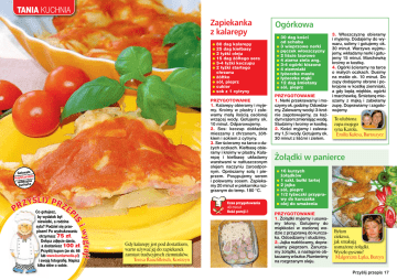 TANIA KUCHNIA Zapiekanka z kalarepy ● ● ● ● ● ● ● ● ● ● 80 dag kalarepy 25 dag kiełbasy 2 łyżki oleju 15 dag żółtego sera 3-4 łyżki keczupu 2 łyżki startego chrzanu żółtko sól, pieprz cukier sok z 1 cytryny PRZYGOTOWANIE 1. Kalarepy obieramy i myjemy. Kroimy w plastry i zalewamy małą ilością osolonej wrzącej wody. Gotujemy ok. 10 minut. Odparowujemy. 2. Sos: keczup dokładnie mieszamy z chrzanem, żółtkiem i sokiem z cytryny. 3. Ser ścieramy na tarce o dużych oczkach. Kiełbasę obieramy i kroimy w plastry. Kalarepę i kiełbasę układamy warstwami w natłuszczonym olejem naczyniu żaroodpornym. Oprószamy solą i pieprzem. Posypujemy serem i polewamy sosem. Zapiekamy 20 minut w piekarniku rozgrzanym do temp. 180 °C. Gotowała pis Przyślij prze redakcyjna kucharka Co gotujesz, by wydatek był niewielki, a rodzina syta? Podziel się przepisem! Po wydrukowaniu otrzymasz 75 zł. Dołącz zdjęcie dania, a dostaniesz 100 zł. Przyślij kupon (ze str. 66 lub www.burdamedia.pl) i swoją fotografię. Napisz kilka słów o sobie. Czas przygotowania 40 minut Ilość porcji 8 Gdy kalarepy jest pod dostatkiem, warto używać jej do zapiekanek zamiast tradycyjnych ziemniaków. Teresa Rauchfleisch, Kostrzyn Ogórkowa 3. Włoszczyznę obieramy i myjemy. Dodajemy do wywaru, solimy i gotujemy ok. ● 30 minut. Warzywa wyjmu● jemy, wkładamy nerki i gotu● jemy 15 minut. Marchewkę ● kroimy w kostkę. ● 4. Ogórki ścieramy na tarce ● o małych oczkach. Dusimy ● na maśle ok. 10 minut. Do ● zupy dodajemy obrane i po● krojone w kostkę ziemniaki, ● a gdy będą miękkie, ogórki PRZYGOTOWANIE i marchewkę. Śmietanę mie1. Nerki przekrawamy i mo- szamy z mąką i zabielamy czymy ok. godziny. Odcedza- zupę. Doprawiamy i zagotomy. Zalewamy wodą i 3-krot- wujemy. nie zagotowujemy, za każdym razem zmieniając wodę. To ulubiona Studzimy i kroimy w kostkę. zupa mojego 2. Kości myjemy i zalewa- syna Karola. my 1,5 l wody. Gotujemy ok. Emilia Kulesa, Bartoszyce 30 minut z liśćmi i zielem. ● 30 dag kości od schabu 3 wieprzowe nerki pęczek włoszczyzny 2 liście laurowe 4 ziarna ziela ang. 3-4 ogórki kiszone 4 ziemniaki łyżeczka masła łyżeczka mąki 12 dag śmietany sól, pieprz Żołądki w panierce ● ● ● ● ● ● 16 kurzych żołądków 1 szkl. bułki tartej 2 jajka sól, pieprz 1/2 łyżeczki przyprawy do kurczaka olej do smażenia PRZYGOTOWANIE 1. Żołądki myjemy i usuwamy błony. Gotujemy do miękkości w osolonej wodzie z przyprawą do kurczaka. Odcedzamy i studzimy. 2. Jajka rozkłócamy, doprawiamy pieprzem. Zanurzamy żołądki, a następnie obtaczamy w bułce. Rumienimy na rozgrzanym oleju. Byłam ciekawa, jak smakują usmażone żołądki. Wyszło pysznie! Małgorzata Łątka, Burzyn Przyślij przepis 17
