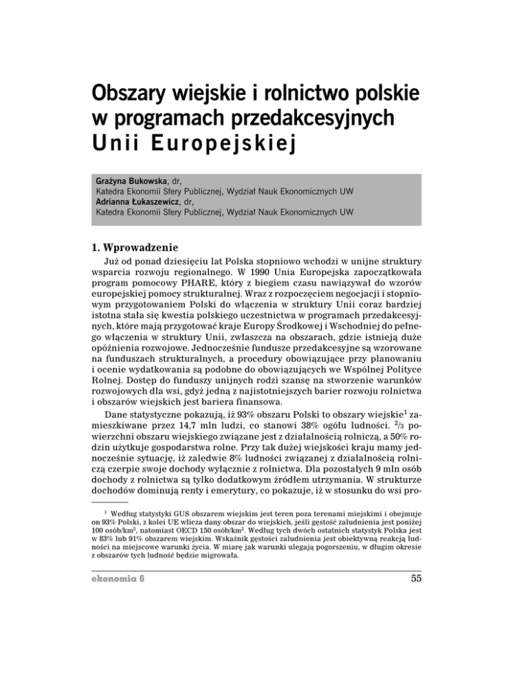 Obszary wiejskie i rolnictwo polskie w programach przedakcesyjnych Unii Europejskiej Gra¿yna Bukowska, dr, Katedra Ekonomii Sfery Publicznej, Wydzia³ Nauk Ekonomicznych UW Adrianna £ukaszewicz, dr, Katedra Ekonomii Sfery Publicznej, Wydzia³ Nauk Ekonomicznych UW 1. Wprowadzenie Ju¿ od ponad dziesiêciu lat Polska stopniowo wchodzi w unijne struktury wsparcia rozwoju regionalnego. W 1990 Unia Europejska zapocz¹tkowa³a program pomocowy PHARE, który z biegiem czasu nawi¹zywa³ do wzorów europejskiej pomocy strukturalnej. Wraz z rozpoczêciem negocjacji i stopniowym przygotowaniem Polski do w³¹czenia w struktury Unii coraz bardziej istotna sta³a siê kwestia polskiego uczestnictwa w programach przedakcesyjnych, które maj¹ przygotowaæ kraje Europy Œrodkowej i Wschodniej do pe³nego w³¹czenia w struktury Unii, zw³aszcza na obszarach, gdzie istniej¹ du¿e opóŸnienia rozwojowe. Jednoczeœnie fundusze przedakcesyjne s¹ wzorowane na funduszach strukturalnych, a procedury obowi¹zuj¹ce przy planowaniu i ocenie wydatkowania s¹ podobne do obowi¹zuj¹cych we Wspólnej Polityce Rolnej. Dostêp do funduszy unijnych rodzi szansê na stworzenie warunków rozwojowych dla wsi, gdy¿ jedn¹ z najistotniejszych barier rozwoju rolnictwa i obszarów wiejskich jest bariera finansowa. Dane statystyczne pokazuj¹, i¿ 93% obszaru Polski to obszary wiejskie1 zamieszkiwane przez 14,7 mln ludzi, co stanowi 38% ogó³u ludnoœci. 2/3 powierzchni obszaru wiejskiego zwi¹zane jest z dzia³alnoœci¹ rolnicz¹, a 50% rodzin u¿ytkuje gospodarstwa rolne. Przy tak du¿ej wiejskoœci kraju mamy jednoczeœnie sytuacjê, i¿ zaledwie 8% ludnoœci zwi¹zanej z dzia³alnoœci¹ rolnicz¹ czerpie swoje dochody wy³¹cznie z rolnictwa. Dla pozosta³ych 9 mln osób dochody z rolnictwa s¹ tylko dodatkowym Ÿród³em utrzymania. W strukturze dochodów dominuj¹ renty i emerytury, co pokazuje, i¿ w stosunku do wsi pro1 Wed³ug statystyki GUS obszarem wiejskim jest teren poza terenami miejskimi i obejmuje on 93% Polski, z kolei UE wlicza dany obszar do wiejskich, jeœli gêstoœæ zaludnienia jest poni¿ej 100 osób/km2, natomiast OECD 150 osób/km2. Wed³ug tych dwóch ostatnich statystyk Polska jest w 83% lub 91% obszarem wiejskim. WskaŸnik gêstoœci zaludnienia jest obiektywn¹ reakcj¹ ludnoœci na miejscowe warunki ¿ycia. W miarê jak warunki ulegaj¹ pogorszeniu, w d³ugim okresie z obszarów tych ludnoœæ bêdzie migrowa³a. ekonomia 6 55 Gra¿yna Bukowska, Adrianna £ukaszewicz wadzi siê przede wszystkim politykê socjaln¹. Na 2 mln gospodarstw 13% produkuje wy³¹cznie ¿ywnoœæ dla siebie, 37% sprzedaje na rynek produkty za 1200 z³ rocznie. Przy tym poziomie wyjœciowym Polska ma ogromne szanse na otrzymanie wsparcia w ramach Wspólnej Polityki Rolnej. Wysi³ki polskich negocjatorów koncentruj¹ siê na objêciu polskiej produkcji rolnej polityk¹ interwencyjn¹, realizowan¹ w ramach Sekcji Gwarancji. Jednak — jak siê wydaje — nasze przysz³e ewentualne korzyœci p³yn¹ce z udzia³u we Wspólnej Polityce Rolnej bêd¹ wynika³y z unijnego wsparcia w ramach polityki strukturalnej czy z Funduszu Spójnoœci. Bior¹c pod uwagê kryteria Unii (liczbê ludnoœci rolniczej, powierzchniê u¿ytków rolnych, wysokoœæ PKB na mieszkañca, specyfikê sytuacji w danym regionie), Polska mog³aby otrzymaæ wsparcie w ramach trzech programów: PHARE, ISPA i SAPARD rzêdu 900 mln EUR w latach 2000–2006. Pytanie, które siê nasuwa, dotyczy realnych mo¿liwoœci absorpcji funduszy przedakcesyjnych. Czy doœwiadczenia w wykorzystaniu unijnego wsparcia w ostatnich latach pozwalaj¹ optymistycznie oceniaæ efektywnoœæ wykorzystania funduszy unijnych w Polsce?2 Doœwiadczenia innych pañstw (Grecja) pokazuj¹, i¿ korzystanie z funduszy europejskich nie musi prowadziæ do szybkiego rozwoju. Efektywnoœæ wydatkowania œrodków zale¿y od wielu czynników, m.in. od postaw administracji rz¹dowej, a tak¿e decydentów wobec œrodków pomocowych p³yn¹cych z Brukseli. Efekty osi¹ga siê wówczas, gdy pomoc z funduszy jest powi¹zana z rz¹dow¹ polityk¹ regionaln¹ i makroekonomiczn¹ polityk¹ gospodarcz¹. W dalszej czêœci zawarta bêdzie próba oceny polityki regionalnej skierowanej do obszarów wiejskich i rolnictwa, struktur administracji i instrumentów oddzia³ywania bêd¹cych w ich dyspozycji, a tak¿e identyfikacja g³ównych barier absorpcji œrodków unijnych. Zanim zajmiemy siê powy¿szymi kwestiami, przyjrzyjmy siê bli¿ej programom, którymi Unia wspiera nasze wejœcie, a tak¿e programom, którymi mog³aby nas wesprzeæ po przyst¹pieniu w dziedzinie rolnictwa i obszarów wiejskich. 2. Przegl¹d programów przedakcesyjnych 2.1. PHARE (Poland and Hungary: Assistance for Restructuring their Economies) Pocz¹tkowo mia³ na celu pomóc Polsce i Wêgrom w przeprowadzaniu zmian politycznych i gospodarczych. PóŸniej poszerza³ siê o kolejne pañstwa Europy Œrodkowej i Wschodniej. Obecnie korzysta z niego 13 pañstw: 10 krajów Europy Œrodkowej i Wschodniej kandyduj¹cych do UE, czyli Bu³garia, Czechy, Estonia, Litwa, £otwa, Polska, Rumunia, S³owacja, S³owenia, Wêgry oraz Albania, Macedonia, Boœnia i Hercegowina. 2 W aneksie zawarte s¹ najczêstsze zarzuty NIK dotycz¹ce wydatkowania unijnych œrodków finansowych PHARE w Polsce. 56 ekonomia 6 Obszary wiejskie i rolnictwo polskie w programach przedakcesyjnych Unii Europejskiej W latach 1990–1999 œrodki pomocowe PHARE dla wszystkich krajów wynios³y 10,31 mld EUR, Polska otrzyma³a w tym okresie ponad 2 mld EUR, w dziedzinie rolnictwa 223,5 mln EUR. W bud¿ecie Unii na lata 2000–2006 wysokoœæ pomocy PHARE ustalono na sumê 1,56 mld euro rocznie. Zgodnie z Now¹ Orientacj¹ PHARE na projekty inwestycyjne zostanie przeznaczonych 70% œrodków i 30% na projekty dotycz¹ce rozwoju instytucjonalnego. Polska mo¿e liczyæ na œrodki o wartoœci oko³o 400–450 mln euro rocznie. W roku 2000 przyznano Polsce w ramach PHAR