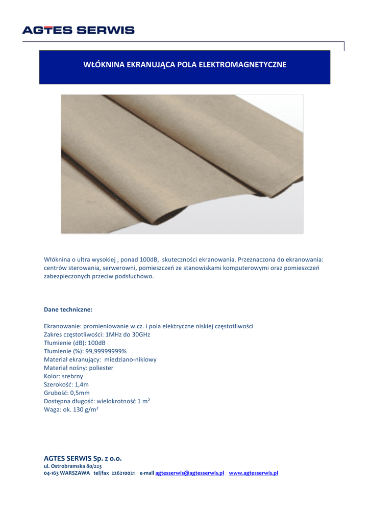 YK WŁÓKNINA EKRANUJĄCA POLA ELEKTROMAGNETYCZNE Włóknina o ultra wysokiej , ponad 100dB, skuteczności ekranowania. Przeznaczona do ekranowania: centrów sterowania, serwerowni, pomieszczeń ze stanowiskami komputerowymi oraz pomieszczeń zabezpieczonych przeciw podsłuchowo. Dane techniczne: Ekranowanie: promieniowanie w.cz. i pola elektryczne niskiej częstotliwości Zakres częstotliwości: 1MHz do 30GHz Tłumienie (dB): 100dB Tłumienie (%): 99,99999999% Materiał ekranujący: miedziano-‐niklowy Materiał nośny: poliester Kolor: srebrny Szerokość: 1,4m Grubość: 0,5mm Dostępna długość: wielokrotność 1 m² Waga: ok. 130 g/m² AGTES SERWIS Sp. z o.o. ul. Ostrobramska 80/223 04-‐163 WARSZAWA tel/fax 226210021 e-‐mail [email protected] www.agtesserwis.pl