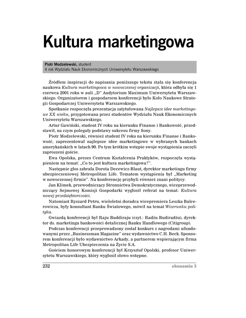 Kultura marketingowa Piotr Modzelewski, student 4 rok Wydzia³u Nauk Ekonomicznych Uniwersytetu Warszawskiego ród³em inspiracji do napisania poni¿szego tekstu sta³a siê konferencja naukowa Kultura marketingowa w nowoczesnej organizacji, która odby³a siê 1 czerwca 2001 roku w auli „D” Audytorium Maximum Uniwersytetu Warszawskiego. Organizatorem i gospodarzem konferencji by³o Ko³o Naukowe Strategii Gospodarczej Uniwersytetu Warszawskiego. Spotkanie rozpoczê³a prezentacja zatytu³owana Najlepsze idee marketingowe XX wieku, przygotowana przez studentów Wydzia³u Nauk Ekonomicznych Uniwersytetu Warszawskiego. Artur Gawiñski, student IV roku na kierunku Finanse i Bankowoœæ, przedstawi³, na czym polega³y podstawy sukcesu firmy Sony. Piotr Modzelewski, równie¿ student IV roku na kierunku Finanse i Bankowoœæ, zaprezentowa³ najlepsze idee marketingowe w wybranych bankach amerykañskich w latach 90. Po tym krótkim wstêpie swoje wyst¹pienia zaczêli zaproszeni goœcie. Ewa Opolska, prezes Centrum Kszta³cenia Praktyków, rozpoczê³a wyst¹pieniem na temat: „Co to jest kultura marketingowa?”. Nastêpnie g³os zabra³a Dorota Decewicz-Blaut, dyrektor marketingu firmy ubezpieczeniowej Metropolitan Life. Tematem wyst¹pienia by³ „Marketing w nowoczesnej firmie”. Na konferencjê przybyli równie¿ znani politycy. Jan Klimek, przewodnicz¹cy Stronnictwa Demokratycznego, wiceprzewodnicz¹cy Sejmowej Komisji Gospodarki wyg³osi³ referat na temat: Kultura nowej przedsiêbiorczoœci. Natomiast Ryszard Petru, wieloletni doradca wicepremiera Leszka Balcerowicza, by³y konsultant Banku Œwiatowego, mówi³ na temat Wizerunku polityka. Gwiazd¹ konferencji by³ Raju Buddiraju (czyt.: Rad¿u Budirad¿u), dyrektor ds. marketingu bankowoœci detalicznej Banku Handlowego (Citigroup). Podczas konferencji przeprowadzony zosta³ konkurs z nagrodami ufundowanymi przez „Businessman Magazine” oraz wydawnictwo C.H. Beck. Sponsorem konferencji by³o wydawnictwo Arkady, a partnerem wspieraj¹cym firma Metropolitan Life Ubezpieczenia na ¯ycie S.A. Goœciem honorowym konferencji by³ Krzysztof Opolski, profesor Uniwersytetu Warszawskiego, który wyg³osi³ s³owo wstêpne. 232 ekonomia 3 Piotr Modzelewski Kultura marketingowa 1. Czym jest marketing? OdpowiedŸ na to pytanie nie jest taka prosta, jak mog³oby siê wydawaæ. Ewa Opolska, skupiaj¹c siê na wyjaœnieniu tego pojêcia, stwierdzi³a, ¿e marketing jest koncepcj¹, która jest coraz bardziej przydatna we wspó³czesnym œwiecie. Dlaczego mówimy o kulturze marketingowej, a nie o koncepcji marketingu czy o instrumentach marketingu? Dzieje siê tak dlatego, ¿e marketing wykracza poza jedn¹ organizacjê. Ewa Opolska podkreœli³a, ¿e marketing jest pewnego rodzaju postaw¹ nie tylko w organizacji. Trzeba jednak najpierw stworzyæ postawy marketingowe wœród wszystkich pracowników, niezale¿nie od tego, gdzie w hierarchii przedsiêbiorstwa znajduje siê dana osoba. Czy mo¿na postawiæ znak równoœci pomiêdzy marketingiem a sprzeda¿¹? W ¿adnym razie nie. Marketing to wcale nie jest sprzeda¿. Zdaniem Ewy Opolskiej, koncepcja marketingu zaczyna siê w momencie opracowywania pomys³u na produkt, po dok³adnej analizie rynku. ¯eby zebraæ informacje bezpoœrednio od potencjalnych klientów, postawy pracowników musz¹ byæ promarketingowe. Dla firmy niezwykle cenne s¹ sygna³y, gdy przychodzi klient i sk³ada reklamacjê czy te¿ w inny sposób okazuje swoje niezadowolenie. Wg Ewy Opolskiej trzeba rejestrowaæ przyczyny, dlaczego klienci chc¹ odejœæ z firmy. Ka¿dy pracownik powinien rozumieæ, ¿e od niego równie¿ zale¿y sukces rynkowy organizacji. Musi sobie uœwiadamiaæ, sk¹d bior¹ siê pieni¹dze i dlaczego dostaje wyp³atê. Niewiele organizacji zdaje sobie sprawê z tego, ¿e marketing powinien byæ przede wszystkim funkcj¹ wewnêtrzn¹ organizacji. Ewa Opolska przytoczy³a œwietny przyk³ad klienta, który zwabiony dobr¹ i kosztown¹ kampani¹ promocyjn¹ przyszed³ do banku, a pracownicy nic nie wiedzieli o nowym produkcie. Prosz¹c klienta, ¿eby przyszed³ za tydzieñ, skierowali go prosto w objêcia konkurencji. Pieni¹dze wydane na tak¹ kampaniê pracuj¹ na konkurencjê. Klient przeby³ ju¿ wszystkie etapy zasady AIDA (Attention, Interest, Desire, Action — uwaga, zainteresowanie, pragnienie, dzia³anie), a poniewa¿ pojawi³o siê ju¿ pragnienie posiadania danego produktu, to zostanie ono prawdopodobnie zaspokojone u konkurencji. Dorota Decewicz-Blaut przedstawi³a bardziej pragmatyczny sposób patrzenia na rolê marketingu w organizacji. Okazuje siê, ¿e najwa¿niejsze dla dyrektora marketingu jest wiedzieæ, czego siê chce. Nie wyrêcz¹ go agencje odpowiedzialne za kampanie komunikacyjne. Dorota Decewicz-Blaut zachêca³a do studiowania teorii, ale podkreœli³a, ¿e nie mo¿na trzymaæ siê szablonów. Rynek zmienia siê tak szybko, ¿e liczy siê szybkoœæ reakcji. Dorota Decewicz-Blaut przytoczy³a przyk³ad Pokémonów (dodatków promocyjnych dla dzieci do „towarów ³atwo zbywalnych”, np. chipsów), które sta³y siê popularne na ca³ym œwiecie. Obecnie praca marketingowców skupia siê na klientach. Pose³ Jan Klimek w doskona³y sposób usystematyzowa³ wiedzê na temat nowej przedsiêbiorczoœci, rzucaj¹c ca³kiem inne œwiat³o na to pojêcie i rozszerzaj¹c jego zakres znaczeniowy. Jan Klimek podkreœli³, ¿e zwrot „kultura nowej przedsiêbiorczoœci” jest niezdefiniowany i wywo³uje sprzeczne konotacje. Przedsiêbiorczoœæ kojarzy siê ze strategicznym dzia³aniem i podejmowa- ekonomia 3 233 Studencka aktywnoœæ naukowa niem œwiadomego wysi³ku. Nowa przedsiêbiorczoœæ koncentruje siê na efektach i satysfakcji odbiorcy. Realizuje siê ona w modelu organizacji samoucz¹cej siê, rozwijaj¹cej siê, inteligentnej. Wiedza jest zasobem, który u¿ywany nie pomniejsza swej objêtoœci, ale wrêcz przeciwnie, zasoby te multiplikuje. Jeœli dwie osoby maj¹ po