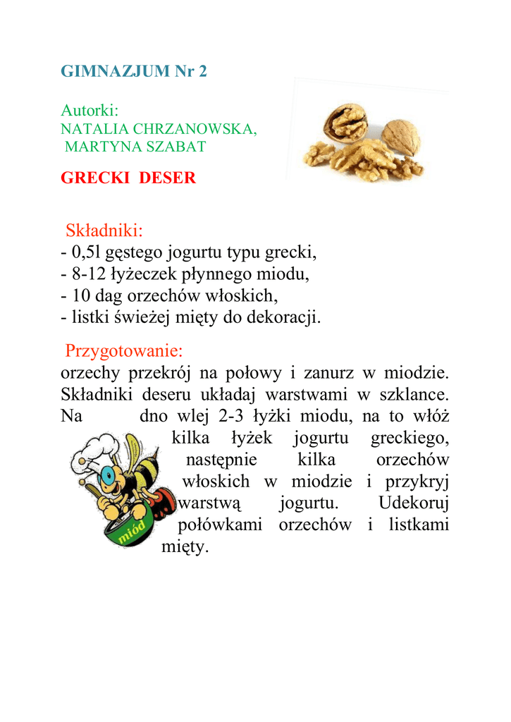 GIMNAZJUM Nr 2 Autorki: NATALIA CHRZANOWSKA, MARTYNA SZABAT GRECKI DESER Składniki: - 0,5l gęstego jogurtu typu grecki, - 8-12 łyżeczek płynnego miodu, - 10 dag orzechów włoskich, - listki świeżej mięty do dekoracji. Przygotowanie: orzechy przekrój na połowy i zanurz w miodzie. Składniki deseru układaj warstwami w szklance. Na dno wlej 2-3 łyżki miodu, na to włóż kilka łyżek jogurtu greckiego, następnie kilka orzechów włoskich w miodzie i przykryj warstwą jogurtu. Udekoruj połówkami orzechów i listkami mięty.