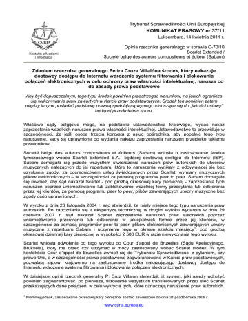Trybunał Sprawiedliwości Unii Europejskiej KOMUNIKAT PRASOWY nr 37/11 Luksemburg, 14 kwietnia 2011 r. Kontakty z Mediami i Informacja Opinia rzecznika generalnego w sprawie C-70/10 Scarlet Extended / Société belge des auteurs compositeurs et éditeur (Sabam) Zdaniem rzecznika generalnego Pedra Cruza Villalóna środek, który nakazuje dostawcy dostępu do Internetu wdrożenie systemu filtrowania i blokowania połączeń elektronicznych w celu ochrony praw własności intelektualnej, narusza co do zasady prawa podstawowe Aby być dopuszczalnym, tego typu środek powinien przestrzegać warunków, na jakich ogranicza się wykonywanie praw zawartych w Karcie praw podstawowych. Środek ten powinien zatem między innymi posiadać podstawę prawną spełniającą wymogi odnoszące się do „jakości ustawy” będącej przedmiotem sporu. Właściwe sądy belgijskie mogą, na podstawie ustawodawstwa krajowego, wydać nakaz zaprzestania wszelkich naruszeń prawa własności intelektualnej. Ustawodawstwo to przewiduje w szczególności, że jeśli osoba trzecia korzysta z usług pośrednika, aby popełnić tego typu naruszenie, sądy są uprawnione do wydania nakazu zaprzestania naruszeń przeciwko takiemu pośrednikowi. Société belge des auteurs compositeurs et éditeurs (Sabam) wniosła o zastosowanie środka tymczasowego wobec Scarlet Extended S.A., będącej dostawcą dostępu do Internetu (ISP). Sabam domagała się przede wszystkim stwierdzenia naruszeń praw autorskich do utworów muzycznych należących do jej repertuaru, które to naruszenia wynikały z odbywającej się bez uzyskania zgody, za pośrednictwem usług świadczonych przez Scarlet, wymiany muzycznych plików elektronicznych – w szczególności za pomocą programów peer to peer. Sabam domagała się również, aby sąd nakazał Scarlet - pod groźbą okresowej kary pieniężnej - zaprzestania tych naruszeń poprzez uniemożliwienie lub zablokowanie wszelkiej formy przesyłania lub odbierania przez jej klientów, za pomocą programu peer to peer, plików zawierających utwory muzyczne bez zgody osób uprawnionych. W wyroku z dnia 26 listopada 2004 r. sąd stwierdził, że miały miejsce tego typu naruszenia praw autorskich. Po zapoznianiu się z ekspertyzą techniczną, w drugim wyroku wydanym w dniu 29 czerwca 2007 r. sąd nakazał Scarlet zaprzestanie naruszeń praw autorskich poprzez uniemożliwienie przesyłania lub odbierania w jakiejkolwiek formie przez jej klientów, w szczególności za pomocą programów peer to peer, plików elektronicznych zawierających utwory muzyczne z repertuaru Sabam i uczynienie tego w okresie sześciu miesięcy1, pod groźbą okresowej dziennej kary pieniężnej w wysokości 2 500 EUR w razie niewykonania tego wyroku. Scarlet wniosła odwołanie od tego wyroku do Cour d’appel de Bruxelles (Sądu Apelacyjnego, Bruksela), który ma orzec czy utrzymać w mocy zastosowany wobec Scarlet środek. W tym kontekście Cour d’appel de Bruxelles zwrócił się do Trybunału Sprawiedliwości z pytaniem, czy prawo Unii, a w szczególności prawa podstawowe zagwarantowane w Karcie praw podstawowych, pozwalają sądowi krajowemu na zastosowanie środka nakazującego dostawcy dostępu do Internetu wdrożenie systemu filtrowania i blokowania połączeń elektronicznych. W dzisiejszej opinii rzecznik generalny P. Cruz Villalón stwierdził, iż system, jaki należy wdrożyć powinien zagwarantować, po pierwsze, filtrowanie wszystkich transferowanych przez sieć Scarlet przekazujących dane połączeń, w celu wykrycia tych, które oznaczają naruszenie praw autorskich. 1 Niemniej jednak, zastosowanie okresowej kary pieniężnej zostało zawieszone do dnia 31 października 2008 r. www.curia.europa.eu W rezultacie tego filtrowania system ten powinien zagwarantować, po drugie, blokowanie połączeń, które oznaczają faktycznie naruszenie praw autorskich, bądź na etapie próby ściągnięcia tych danych bądź na etapie ich wysłania. P. Cruz Villalón uważa, że środek w formie nakazu przybiera w ten sposób postać obowiązku o charakterze ogólnym, który można po jakimś czasie rozszerzyć w sposób stały na wszystkich dostawców dostępu do Internetu. Rzecznik generalny podkreślił w szczególności, że środek ten będzie miał długotrwały wpływ na nieokreśloną liczbę osób prawnych i fizycznych, bez względu na ich stosunki umowne ze Scarlet, czy też państwo ich siedziby lub miejsca zamieszkania. System ten powinien zatem umożliwiać blokowanie każdego przesyłu przez internautę, będącego abonentem Scarlet, innemu internaucie – który jest bądź nie jest abonentem Scarlet i który posiada bądź nie posiada siedzibę lub miejsce zamieszkania w Belgii – każdego pliku uważanego za stanowiący naruszenie prawa autorskiego, którym zarządza, z którego pobiera pożytki i którego ochronę zapewnia Sabam. Podobnie, system ten powinien również umożliwiać blokowanie odbierania przez każdego internautę będącego abonentem Scarlet każdego pliku naruszającego prawa autorskie, który pochodzi od każdego innego internauty. Ponadto środek ten byłby stosowany in abstracto i w sposób prewencyjny, to znaczy w sytuacji, kiedy nie miało miejsca wcześniejsze stwierdzenie faktycznego naruszenia czy też bezpośrednie zagrożenie naruszenia prawa własności intelektualnej. Rzecznik generalny uściślił ponadto, że przedmiotowy środek okazuje się nowym obowiązkiem. Środek ten nakładałby zatem na Scarlet obowiązek rezultatu, jeśli chodzi o ochronę praw autorskich, których broni Sabam poprzez ustanowiony system, i to pod groźbą okresowej kary pieniężnej. W dodatku obciążałby on ją kosztami wdrożenia systemu filtrowania i blokowania. W ten sposób, poprzez wdrożenie tego systemu, prawna i ekonomiczna odpowiedzialność za walkę z nielegalnym ściąganiem utworów pirackich w Internecie zostałaby w szerokiej mierze delegowana na dostawców dostępu 