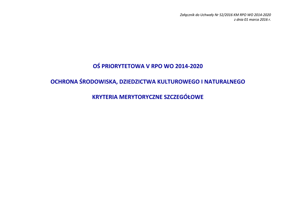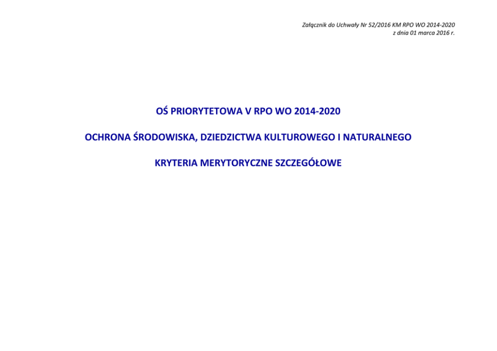 Załącznik do Uchwały Nr 52/2016 KM RPO WO 2014-2020 z dnia 01 marca 2016 r. OŚ PRIORYTETOWA V RPO WO 2014-2020 OCHRONA ŚRODOWISKA, DZIEDZICTWA KULTUROWEGO I NATURALNEGO KRYTERIA MERYTORYCZNE SZCZEGÓŁOWE Załącznik do Uchwały Nr 52/2016 KM RPO WO 2014-2020 z dnia 01 marca 2016 r. Oś priorytetowa V Ochrona środowiska, dziedzictwa kulturowego i naturalnego Działanie 5.3 Ochrona dziedzictwa kulturowego i kultury Poddziałanie 5.3.1 Dziedzictwo kulturowe i kultura Dla wszystkich typów projektów LP Nazwa kryterium 1 2 Projekt nie dotyczy organizacji imprez 1. o charakterze kulturalnym Projekt swym zakresem nie obejmuje budowy 2. od podstaw nowej infrastruktury kulturalnej Źródło informacji 3 Wniosek wraz z załącznikami Kryteria merytoryczne szczegółowe (TAK/NIE) Charakter kryterium W/B 4 Definicja 5 Bezwzględny W ramach działania 5.3 nie będą finansowane projekty dotyczące organizacji imprez o charakterze kulturalnym, takich jak wystawy, festiwale. Wniosek wraz z załącznikami Bezwzględny W ramach działania 5.3 nie będzie finansowana budowa od podstaw nowej infrastruktury kulturalnej. 3. Limit wartości projektu Wniosek wraz z załącznikami Bezwzględny Maksymalna wartość projektu nie przekracza 5 mln euro. Zrównoważenie 4. finansowe i trwałość finansowania projektu Wniosek wraz z załącznikami Bezwzględny W projektach musi zostać wykazane zrównoważenie finansowe, trwałość ich finansowania w okresie eksploatacyjnym z uwzględnieniem prognoz dotyczących popytu oraz przychodów generowanych przez bezpośrednich użytkowników, a także z uwzględnieniem środków własnych beneficjenta oraz subwencji ze strony właściwych podmiotów. Załącznik do Uchwały Nr 52/2016 KM RPO WO 2014-2020 z dnia 01 marca 2016 r. LP Nazwa kryterium Źródło informacji 1 2 3 Kryterium weryfikowane na podstawie zapisów zawartych w Studium Wykonalności Inwestycji. Kryteria merytoryczne szczegółowe (TAK/NIE) Charakter kryterium Definicja W/B 4 5 Wniosek wraz z załącznikami Bezwzględny W przypadku projektów dot. obiektu wpisanego na Listę Światowego Dziedzictwa UNESCO lub uznanego przez Prezydenta RP za Pomnik Historii lub zlokalizowanego na obszarze objętym wpisem na Listę Światowego Dziedzictwa UNESCO lub położonego na obszarze uznanym za Pomnik Historii przez Prezydenta RP, wartość całkowita projektu nie przekracza 2 mln euro. Działania edukacyjne, informacyjne jako 6. integralny element projektu (jeśli dotyczy) Wniosek wraz z załącznikami Bezwzględny Działania edukacyjne, informacyjne będą stanowiły integralny element projektu w przypadku, gdy będą realizowane w ramach projektu. Działania takie nie mogą stanowić odrębnego typu przedsięwzięcia. Działania dotyczące wykorzystania, rozwoju aplikacji i usług teleinformatycznych 7. związanych z kulturą i turystyką jako integralny element projektu (jeśli dotyczy) Wniosek wraz z załącznikami Bezwzględny Działania dotyczące wykorzystania, rozwoju aplikacji i usług teleinformatycznych związanych z kulturą i turystyką będą stanowiły integralny element projektu w przypadku, gdy będą realizowane w ramach projektu. Działania takie nie mogą stanowić odrębnego typu przedsięwzięcia. 5. Limity wsparcia (jeśli dotyczy) Załącznik do Uchwały Nr 52/2016 KM RPO WO 2014-2020 z dnia 01 marca 2016 r. LP Nazwa kryterium Źródło informacji 1 2 3 Wartość projektu ograniczona finansowo 8. ze względu na jego zakres (jeśli dotyczy) Wniosek wraz z załącznikami Ograniczenie ze względu na charakter 9. przedsięwzięcia (jeśli dotyczy) Wniosek wraz z załącznikami Kryteria merytoryczne szczegółowe (TAK/NIE) Charakter kryterium W/B 4 Definicja 5 Bezwzględny Koszt całkowity projektu z zakresu: a) konserwacji, restauracji, rewaloryzacji zabytków drewnianych (zarówno nieruchomych, jak i ruchomych), b) projekty dotyczące rozwoju czytelnictwa w miastach wojewódzkich, c) projekty dotyczące rozwoju sztuki współczesnej w miastach wojewódzkich, d) konserwacji, restauracji, rewaloryzacji, adaptacji na cele kulturalne oraz zabezpieczenia przed kradzieżą i zniszczeniem ruchomych i nieruchomych zabytków techniki nie przekracza 2 mln euro. Bezwzględny Budowa towarzyszącej infrastruktury technicznej, informacyjnej oraz zagospodarowania terenu wokół obiektów dziedzictwa kulturowego lub naturalnego, dostosowanie tych obiektów do potrzeb osób z niepełnosprawnościami stanowi jedynie uzupełniający element projektu. Projekt stanowi część 10. terytorialnej strategii dla konkretnych obszarów Wniosek wraz z załącznikami Bezwzględny Wpływ projektu na 11. rozwój gospodarczospołeczny Wniosek wraz z załącznikami Bezwzględny Przedsięwzięcia projektowe wpisują się w terytorialne strategie dla poszczególnych obszarów m. in. terytorialna strategia ochrony dziedzictwa kulturowego, programy opieki nad zabytkami (na szczeblu gminnym, powiatowym i wojewódzkim), strategie subregionalne obejmujące swoim zakresem m. in. kwestie związane ze zrównoważoną turystyką, kulturą i dziedzictwem naturalnym. Kryterium weryfikowane na podstawie danych zawartych w SWI. Oceniany będzie wpływ efektów realizacji projektu na rozwój gospodarczy i społeczny regionu, przy uwzględnieniu zrównoważonego rozwoju w wymiarze regionalnym. Ocenie w ramach projektu podlegać będzie bilans zysków i strat społecznych i gospodarczych, z uwzględnieniem specyfiki obszaru wsparcia. Ocena w ramach kryterium obejmować będzie w szczególności takie czynniki jak: Załącznik do Uchwały Nr 52/2016 KM RPO WO 2014-2020 z dnia 01 marca 2016 r. - wpływ na realizację celów: strategii rozwoju województwa i/ lub strategii ponadregionalnych; - wpływ na tworzenie pośrednich miejsc pracy poprzez tworzenie warunków sprzyjających zwiększeniu aktywności usługowej i handlowej w bezpośrednim sąsiedztwie inwestycji; - tworzenie warunków dla rozwoju gospodarczego regionu; - wzmacnianie spó