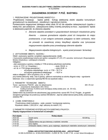 BUDOWA PUNKTU SELEKTYWNEJ ZBIÓRKI ODPADÓW KOMUNALNYCH W ALWERNI ZAGADNIENIA OCHRONY P.POŻ. BUDYNKU1. PRZEZNACZENIE PROJEKTOWANEJ INWESTYCJI : Projektowana inwestycja będzie pełniła funkcję selektywnej zbiórki odpadów komunalnych gromadzonych na utwardzonym , oświetlonym i ogrodzonym terenie . Pomieszczenie magazynowe (istniejąca wiata) około 30 m2 dla odpadów niebezpiecznych (zgodne z tabelą n/w) jest zadaszone , zabezpieczone siatką i bramką zamykaną na klucz , wyposażone będzie w atestowane pojemniki do zbierania odpadów Zbieranie odpadów powstałych w gospodarstwach domowych mieszkańców gminy Alwernia – czasowe gromadzenie odpadów przed ich transportem do miejsc przetwarzania, w tym wstępne sortowanie polegajace na takim sortowaniu, które nie prowadzi do zasadniczej zmiany klasyfikacji odpadów oraz tymczasowe magazynowanie odpadów przez prowadzącego zbieranie odpadów Magazynowanie odpadów biologicznych-- wywóz przed procesem fermentacji 2. USYTUOWANIE OBIEKTU - BUDOWLI : Obiekt usytuowany zgodnie z projektem zagospodarowania działki . ( Usytuowanie projektowanego budynku jest zgodne z paragrafem 271,272, 273 warunków technicznych ( Rozporządzenie Ministra Infrastruktury z późniejszymi zmianami). Odległości : - plac usytuowany w granicy z działką nr 1736 od strony południowo-wschodniej - od dz. nr 1737 ( ul. I.Krasickieo ) - około 105,00 m - od dz. nr 1734 (droga wewnętrzna ) – około 25,80 m - od budynku mieszkalnego na dz. nr 1735 – 18,17 m - od budynku godpodarczo-składowego – 16,07 m wiata w odległości 1,69 m od granicy z dz. nr 1736 przy ścianie północnej wiaty oraz w granicy północno wschodniej na odcinku długości wiaty – ogrodzenie betonowe (mur ) o odporności ogniowej REI 60 (na wysokość wiaty ) 3. PARAMETRY TECHNICZNE OBIEKTU: Teren ogrodzony PSZOK –plac do składowania ( W tym : utwardzenie destruktem 403,10m2, kostką brukową 72,00m2 pod istniejącą wiatą (wiata pow. ok. 30 m2), zieleń 5,60 m2) 481,70 m2 Zakład mieści się przestrzeni nie zabudowanej .jego powierzchnia wynosi 481,70 m2 .Przyjęto , że gęstość obciążenia ogniowego nie przekroczy wartości 500 [MJ/m2 , stąd też zakład stanowi jedną strefę pożarową dla obiektów PM : 4. LICZBA KONDYGNACJI: Przedmiotowy obiekt budowlany – wiata posiada 1 kondygnację naziemną . Wysokości obiektu 2,38-2,63 m , stąd zaliczony do niskich ( N ). 5. PARAMETRY POŻAROWE WYSTĘPUJĄCYCH SUBSTANCJI PALNYCH : Odpady magazynowane w kontenerach na zewnątrz : Kod odpadu 16 01 03 16 01 20 17 01 01 17 01 02 17 01 07 Rodzaj odpadu Zużyte opony 120-200 kg Szkło Odpady betonu oraz gruz betonowy z rozbiórek i remontów Gruz ceglany Zmieszane odpady z betonu, gruzu ceglanego, odpadowych materiałów ceramicznych i elementów FIRMA ARCHITEKTONICZNO-BUDOWLANA „ARCHITRAW” 32-566 ALWERNIA UL. M.SKŁODOWSKIEJ –CURIE 3E TEL 12 283 17 06 , e-mail: [email protected] BUDOWA PUNKTU SELEKTYWNEJ ZBIÓRKI ODPADÓW KOMUNALNYCH W ALWERNI wyposażenia inne niż wymienione w 170106 Szkło Zużyte urządzenia elektryczne i elektroniczne inne niż wymienione w 200121, 200123 i 200135 Tworzywa sztuczne Odpady ulegajace biodegradacji Odpady wielkogabarytowe Zużyte urządzenia inne niż wymienione w 160209 do 160213 17 02 02 20 01 36 20 01 39 20 02 01 20 03 07 16 02 14 odpady magazynowane w pojemnikach w zamkniętym, zadaszonym pomieszczeniu (wiata ) Kod odpadu 08 03 17* 15 01 10* 16 02 11* 16 02 13* 20 01 13* 20 01 14* 20 01 19* 20 01 21* 20 01 23 20 01 26 20 01 27 20 01 29 20 01 33* 20 01 35* 20 01 80 08 03 18 20 01 28 20 01 30 20 01 32 20 01 34 16 06 03 Rodzaj odpadu Odpadowy toner drukarski zawierający substancje niebezpieczne Opakowanie zawierające pozostałości substancji niebezpiecznych lub nimi zanieczyszczone (np. środkami ochrony roślin I iII klasy toksyczności- bardzo tosyczne i toksyczne) Zużyte urządzenia zawierające freony, HCFC, HFC Zużyte urządzenia zawierające niebezpieczne elementy inne niż wymienione w 160209 do 160212 Rozpuszczalniki Kwasy Środki ochrony roślin I i II klas toksyczności (bardzo toksyczne i toksyczne np. Herbicydy, insektycydy) Lampy fluorescencyjne i inne odpady zawierające rtęć Urządzenia zawierające freony Oleje i tłuszcze inne niż wymienione w 200125 Farby , tusze drukarskie, kleje, lepiszcze i żywice zawierajace substancje niebezpieczne Detergenty zawierające substancje niebezpieczne Baterie i akumulatory łacznie z bateriami i akumulatorami wymienionymi w 160601, 160602 lub 160603 oraz nie sortowane baterie i akumulatory zawierajace te baterie Zużyte urządzenia elektryczne i elektroniczne inne niż wymienione w 200121 i 200123 zawierające niebezpieczne składniki Środki ochrony roślin inne niż wymienione w 200119 Odpadowy toner drukarski inny niż wymieniony w 080317 Farby, tusze, farby drukarskie , kleje, lepiszcze i żywice inne niż wymienione w 200127 Detergenty inne niż wymienione w 200129 Leki inne niż wymienione w 200131 Baterie i akumulatory inne niż wymienione w 200133 Baterie zawierające rtęć Wiata – gromadzenie odpadów niebezpiecznych: Pojemniki na zużyte świetlówki itp. 1 szt - 0,64 m3 Pojemniki na zużyte akumulatory . 3 szt x 600 l = 1800 l Pojemniki na zużyte baterie 2 szt x 40 l = 80 l Pojemniki na leki 2 szt x 40l=80 l Pojemniki na odpady ciekłe 3 szt x 40 l = 120 l Pojemniki na np.farby, tusze, kleje itp. 3 szt x 450 l = 1350 l Inne odpady: Kontener na odpady ciężkie , wielkogabarytowe 1 szt – pojemność Kontener na gruz , odpady budowlane 1 szt około 7,00 m3 Kontener na odpady ulegające biodegradacji 1 szt około 7,00 m3 Mulda otwarta -na odpady wielkogabarytowe 1 szt –około 7,00m3 Pojemniki do segregacji typu Dzwon AT o pojemności 2 m3 ( plastik, szkło, papier) 3 szt Pojemniki stalowe z pokrywą na kółkach 7 szt x 0,80 = 5,6 m3 Pojemniki siatkowe na tworzywa sztuczne 3 szt x 0,80 = 2,40 m3 Pojemniki na puszki 5 szt x 40 l = 200 l 6. KATEGORIA ZAGRO