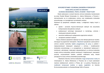WYKORZYSTANIE I OCHRONA ZASOBÓW HYDROSFERY NOWA SPECJALNOŚĆ NA KIERUNKU OCHRONA ŚRODOWISKA, PROFIL STUDIÓW - PRAKTYCZNY Studia realizowane w ramach kierunku ochrona środowiska, koordynowane są przez Wydział Biologii Uniwersytetu im. Adama Mickiewicza w Poznaniu i skoncentrowane są na problematyce ochrony oraz kształtowania środowiska przyrodniczego, a w szczególności na środowisku wodnym. Absolwent tej specjalności zdobędzie wiedzę i umiejętności między innymi z zakresu: zjawisk i procesów fizyczno-chemicznych istotnych dla zrozumienia funkcjonowania ekosystemów wodnych; podstawowych technologii stosowanych w monitoringu, ochronie i rekultywacji środowisk wodnych; warunków siedliskowych występowania organizmów wodnych; zarządzania zasobami wodnymi. Nasza unikatowa specjalność obejmuje trzy lata interdyscyplinarnych studiów, kończących się egzaminem licencjackim. Absolwent specjalności wykorzystanie i ochrona zasobów hydrosfery będzie przygotowany do pracy w polskich i międzynarodowych instytucjach związanych z ochroną i kształtowaniem środowiska przyrodniczego, a w szczególności w: laboratoriach badawczych i kontrolnych, administracji, instytucjach odpowiedzialnych za ochronę środowiska (urzędy ochrony środowiska), parkach narodowych i krajobrazowych, rezerwatach przyrody, oczyszczalniach ścieków, punktach uzdatniania wody, firmach pracujących na rzecz ochrony środowiska przyrodniczego. Absolwenci kierunku ochrona środowiska mogą kontynuować naukę na Uniwersytecie im. Adama Mickiewicza w Poznaniu lub w innych placówkach naukowo dydaktycznych, zarówno w Polsce, jak i za granicą. Nowością jest możliwość kontynuacji studiów w języku angielskim Environmental protection na Wydziale Biologii UAM w Poznaniu. na kierunku