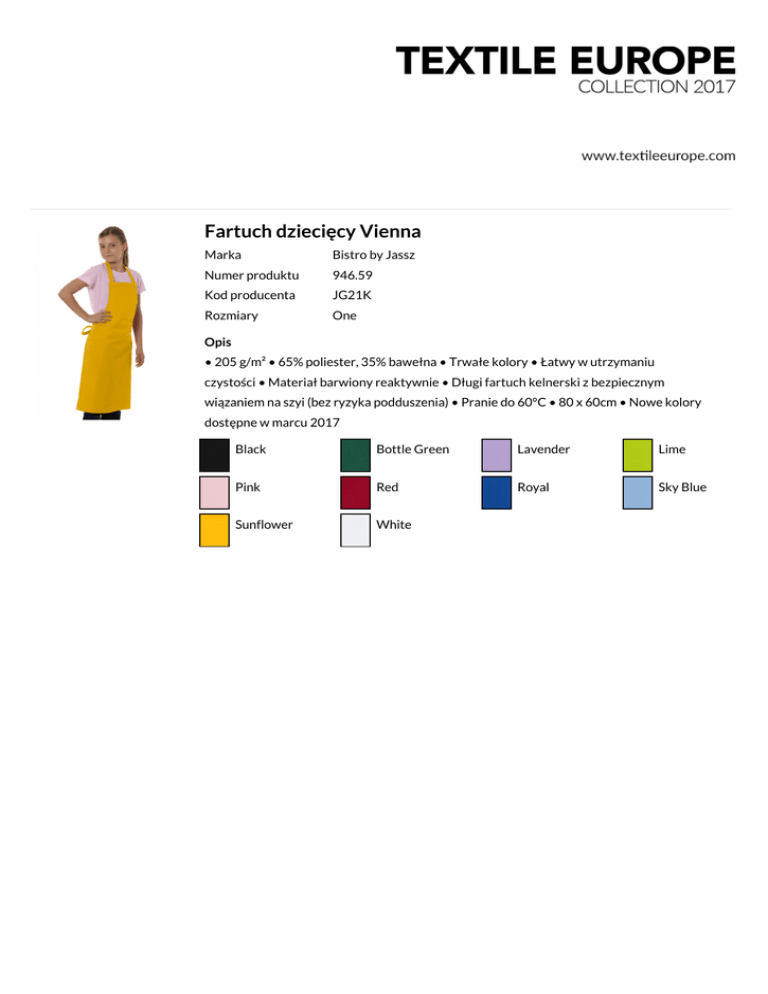 Fartuch dziecięcy Vienna Marka Bistro by Jassz Numer produktu 946.59 Kod producenta JG21K Rozmiary One Opis • 205 g/m² • 65% poliester, 35% bawełna • Trwałe kolory • Łatwy w utrzymaniu czystości • Materiał barwiony reaktywnie • Długi fartuch kelnerski z bezpiecznym wiązaniem na szyi (bez ryzyka podduszenia) • Pranie do 60°C • 80 x 60cm • Nowe kolory dostępne w marcu 2017 Black Bottle Green Lavender Lime Pink Red Royal Sky Blue Sunflower White