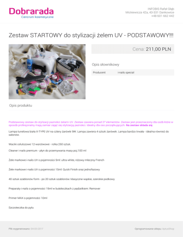 INFOBIS Rafał Głąb Mickiewicza 42a, 43-331 Dankowice +48 601 662 442 Zestaw STARTOWY do stylizacji żelem UV - PODSTAWOWY!!! Cena: 211,00 PLN Opis słownikowy Producent i-nails special Opis produktu Podstawowy zestaw do stylizacji paznokci żelami UV. Zestaw zawiera ponad 27 elementów. Zestaw jest przeznaczony dla osób które w sposób profesjonalny mają zamiar zająć się stylizacją paznokci. Idealny dla oso początkujących. Na zestaw składa się: Lampa tunelowa biała X-TYPE UV na cztery żarówki 9W. Lampa zawiera 4 sztuki żarówek. Lampa bardzo trwała - idealna również do salonów. Waciki celulozowe 12-warstwowe - rolka 250 sztuk. Cleaner i-nails premium - płyn do przemywania masy poj.100 ml Żele markowe i-nails UV o pojemności 5ml: ultra white, różowy mleczny French Żele markowe i-nails UV o pojemności 15ml: Quick Finish oraz jednofazowy 40 sztuk szablonów form - po 20 sztuk szablonów: klasyczne wąskie, szerokie podkowy Preparaty i-nails o pojemności 15ml w buteleczkach z pędzelkiem: Remover Primer MAX o pojemności 10ml Szczoteczka do pyłu Plik wygenerowano: 04-03-2017 Oprogramowanie sklepu: AptusShop INFOBIS Rafał Głąb Mickiewicza 42a, 43-331 Dankowice +48 601 662 442 Blok polerski biały Pilniki klasyczne o gradacjach: 2 sztuki 80/80, 2 sztuki 100/180 i 1 sztuka 240/240 5 drewnianych patyczków Profesjonalne cążki Pędzelek nylonowy do żelu UV #4 Klej do tipsów z pędzelkiem Gilotyna do tipsów Tipsy - 2 komplety po 100 sztuk - mleczne i szklane z długą kieszonką Wszystkie produkty z zestawu są dostepne na sklepie. W zestawie taniej!!! 15% rabatu!!! Cena zestawu to jedyne 211,00 złotych!!! Oprócz tego do zestawu dołączamy GRATIS: karuzelka z cyrkoniami kolor i zestaw 20 opakowań ozdób do paznokci w woreczkach strunowych + GRATIS Oliwka do paznokci !!!!! Uwaga dla odbiorców hurtowych i osób z przyznanymi rabatami ! Zestaw nie podlega innym rabatom i obniżkom ceny! Galeria Plik wygenerowano: 04-03-2017 Powered by TCPDF (www.tcpdf.org) Oprogramowanie sklepu: AptusShop