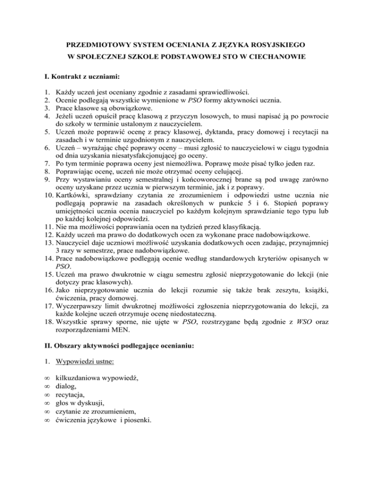 PRZEDMIOTOWY SYSTEM OCENIANIA Z JĘZYKA ROSYJSKIEGO W SPOŁECZNEJ SZKOLE PODSTAWOWEJ STO W CIECHANOWIE I. Kontrakt z uczniami: 1. 2. 3. 4. Każdy uczeń jest oceniany zgodnie z zasadami sprawiedliwości. Ocenie podlegają wszystkie wymienione w PSO formy aktywności ucznia. Prace klasowe są obowiązkowe. Jeżeli uczeń opuścił pracę klasową z przyczyn losowych, to musi napisać ją po powrocie do szkoły w terminie ustalonym z nauczycielem. 5. Uczeń może poprawić ocenę z pracy klasowej, dyktanda, pracy domowej i recytacji na zasadach i w terminie uzgodnionym z nauczycielem. 6. Uczeń – wyrażając chęć poprawy oceny – musi zgłosić to nauczycielowi w ciągu tygodnia od dnia uzyskania niesatysfakcjonującej go oceny. 7. Po tym terminie poprawa oceny jest niemożliwa. Poprawę może pisać tylko jeden raz. 8. Poprawiając ocenę, uczeń nie może otrzymać oceny celującej. 9. Przy wystawianiu oceny semestralnej i końcoworocznej brane są pod uwagę zarówno oceny uzyskane przez ucznia w pierwszym terminie, jak i z poprawy. 10. Kartkówki, sprawdziany czytania ze zrozumieniem i odpowiedzi ustne ucznia nie podlegają poprawie na zasadach określonych w punkcie 5 i 6. Stopień poprawy umiejętności ucznia ocenia nauczyciel po każdym kolejnym sprawdzianie tego typu lub po każdej kolejnej odpowiedzi. 11. Nie ma możliwości poprawiania ocen na tydzień przed klasyfikacją. 12. Każdy uczeń ma prawo do dodatkowych ocen za wykonane prace nadobowiązkowe. 13. Nauczyciel daje uczniowi możliwość uzyskania dodatkowych ocen zadając, przynajmniej 3 razy w semestrze, prace nadobowiązkowe. 14. Prace nadobowiązkowe podlegają ocenie według standardowych kryteriów opisanych w PSO. 15. Uczeń ma prawo dwukrotnie w ciągu semestru zgłosić nieprzygotowanie do lekcji (nie dotyczy prac klasowych). 16. Jako nieprzygotowanie ucznia do lekcji rozumie się także brak zeszytu, książki, ćwiczenia, pracy domowej. 17. Wyczerpawszy limit dwukrotnej możliwości zgłoszenia nieprzygotowania do lekcji, za każde kolejne uczeń otrzymuje ocenę niedostateczną. 18. Wszystkie sprawy sporne, nie ujęte w PSO, rozstrzygane będą zgodnie z WSO oraz rozporządzeniami MEN. II. Obszary aktywności podlegające ocenianiu: 1. Wypowiedzi ustne: • • • • • • kilkuzdaniowa wypowiedź, dialog, recytacja, głos w dyskusji, czytanie ze zrozumieniem, ćwiczenia językowe i piosenki. 2. Wypowiedzi pisemne: • • • • opanowanie alfabetu i zasad pisowni, odpowiedź na pytania, redagowanie krótkich form wypowiedzi (takie formy jak przewiduje podstawa programowa dla danego etapu kształcenia), dyktando. 3. Zadania praktyczne: • • umiejętność korzystania ze słownika dwujęzycznego, niewerbalne wytwory pracy: album, słownik, prace dodatkowe. III. Formy aktywności: Formy aktywności Liczba ocen w semestrze ( minimum) Prace klasowe 2 Kartkówki 1 Mówienie 1 Czytanie 1 Pisanie 1 Praca w grupach 1 IV. Kryteria oceniania poszczególnych form aktywności: a. Uczeń otrzymuje z pracy pisemnej (sprawdziany, prace klasowe) ocenę: niedostateczną – poniżej 44 % punktów dopuszczającą – 45 - 59 % punktów, dostateczną – 60 - 74 % punktów, dobrą – 75 - 89% punktów, bardzo dobrą - od 90% punktów, celującą - gdy otrzymał ocenę bardzo dobrą i rozwiązał zadanie dodatkowe lub gdy wykazał się wiedzą wykraczającą poza zakres wymagań dla danego etapu kształcenia; b. Przy recytacji brane są pod uwagę: prawidłowa wymowa, akcentuacja i intonacja, opanowanie tekstu, interpretacja; c. Dyktanda (1 do 3 błędów I stopnia na ocenę bardzo dobrą w zależności od etapu kształcenia); d. Aktywność językowa: udział i bardzo dobre wyniki w konkursach rusycystycznych i innych przedsięwzięciach związanych z językiem rosyjskim lub wiedzą o Rosji. 2 V. Sposób ustalania oceny semestralnej i końcoworocznej: Przy ustalaniu oceny semestralnej nauczyciel bierze pod uwagę stopnie ucznia z poszczególnych obszarów aktywności według następującej kolejności: • prace klasowe • sprawdziany • wypowiedzi ustne • czytanie i pisanie • dyktanda • prace domowe • prace dodatkowe • aktywność na lekcji • praca w grupach. VI. Informowanie uczniów i rodziców o wymaganiach i postępach ucznia: a. nauczyciel - uczeń • nauczyciel przekazuje uczniowi komentarz do każdej wystawionej oceny; • uczeń ma możliwość otrzymywania dodatkowych wyjaśnień i uzasadnień do wystawionej oceny; b. nauczyciel - rodzic • podczas wywiadówek i indywidualnych konsultacji rodzic może uzyskać informacje o postępach w nauce dziecka; • rodzice są zobowiązani do podpisywania ocen z prac klasowych i sprawdzianów. VII. Wymagania na poszczególne oceny: Ocenę celującą otrzymuje uczeń, który: • spełnia wymagania na ocenę bardzo dobrą, • uzyskuje oceny celujące z prac klasowych, sprawdzianów i prac domowych, • systematycznie wykonuje prace nadobowiązkowe i otrzymuje z nich oceny celujące, • polecenia nauczyciela wypełnia zawsze systematycznie i sumiennie, prezentując wzorowy stosunek do przedmiotu, • uczestniczy i zdobywa nagrody w konkursach przedmiotowych w szkole lub poza szkołą, • wykazuje się umiejętnościami pozaprogramowymi w zakresie podanych niżej zagadnień: Sprawność Słuchanie Mówienie Umiejętności bezbłędnie rozumie wysłuchany tekst; bezbłędnie rozumie i wykonuje oraz potrafi samodzielnie zastosować w sytuacjach szkolnych wszystkie rosyjskie polecenia wydawane przez nauczyciela; prawidłowo wymawia wszystkie dźwięki, można go doskonale zrozumieć; bezbłędnie przekazuje wiadomości na znany mu temat przy użyciu bogatego słownictwa, wzorców intonacyjnych i bardzo 3 Pisanie Czytanie dobrej wymowy; potrafi bezbłędnie przekazać informacje zawarte w wysłuchanym tekście; doskonale potrafi się odnaleźć w typowej sytuacji komunikacyjnej: odpowiedzieć na pytanie, udzielić informacji, a także uzyskać informacj