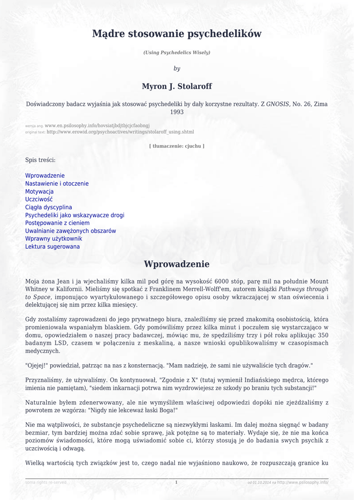 Mądre stosowanie psychedelików (Using Psychedelics Wisely) by Myron J. Stolaroff Doświadczony badacz wyjaśnia jak stosować psychedeliki by dały korzystne rezultaty. Z GNOSIS, No. 26, Zima 1993 wersja ang. www.en.psilosophy.info/hovsiatjbdjtbjcjcfaobngj original text: http://www.erowid.org/psychoactives/writings/stolaroff_using.shtml [ tłumaczenie: cjuchu ] Spis treści: Wprowadzenie Nastawienie i otoczenie Motywacja Uczciwość Ciągła dyscyplina Psychedeliki jako wskazywacze drogi Postępowanie z cieniem Uwalnianie zawężonych obszarów Wprawny użytkownik Lektura sugerowana Wprowadzenie Moja żona Jean i ja wjechaliśmy kilka mil pod górę na wysokość 6000 stóp, parę mil na południe Mount Whitney w Kalifornii. Mieliśmy się spotkać z Franklinem Merrell-Wolff'em, autorem książki Pathways through to Space, imponująco wyartykułowanego i szczegółowego opisu osoby wkraczającej w stan oświecenia i delektującej się nim przez kilka miesięcy. Gdy zostaliśmy zaprowadzeni do jego prywatnego biura, znaleźliśmy się przed znakomitą osobistością, która promieniowała wspaniałym blaskiem. Gdy pomówiliśmy przez kilka minut i poczułem się wystarczająco w domu, opowiedziałem o naszej pracy badawczej, mówiąc mu, że spędziliśmy trzy i pół roku aplikując 350 badanym LSD, czasem w połączeniu z meskaliną, a nasze wnioski opublikowaliśmy w czasopismach medycznych. "Ojejej!" powiedział, patrząc na nas z konsternacją. "Mam nadzieję, że sami nie używaliście tych dragów." Przyznaliśmy, że używaliśmy. On kontynuował, "Zgodnie z X" (tutaj wymienił Indiańskiego mędrca, którego imienia nie pamiętam), "siedem inkarnacji potrwa nim wyzdrowiejesz ze szkody po braniu tych substancji!" Naturalnie byłem zdenerwowany, ale nie wymyśliłem właściwej odpowiedzi dopóki nie zjeżdżaliśmy z powrotem ze wzgórza: "Nigdy nie lekceważ łaski Boga!" Nie ma wątpliwości, że substancje psychedeliczne są niezwykłymi łaskami. Im dalej można sięgnąć w badany bezmiar, tym bardziej można zdać sobie sprawę, jak potężne są to materiały. Wydaje się, że nie ma końca poziomów świadomości, które mogą uświadomić sobie ci, którzy stosują je do badania swych psychik z uczciwością i odwagą. Wielką wartością tych związków jest to, czego nadal nie wyjaśniono naukowo, że rozpuszczają granice ku soma rights re-served 1 od 01.10.2014 na http://www.psilosophy.info/ mądre stosowanie psychedelików www.psilosophy.info/hovsiatjbdjtbjcjcfaobngj umysłowi nieświadomemu. Dają nam dostęp do naszego stłumionego i zapomnianego materiału, do Cienia, którym tak skutecznie zajął się C.G. Jung, do archetypów ludzkości, do olbrzymiego zakresu poziomów myślenia, oraz do źródła kreatywności i mistycznego doznania, które Jung nazwał nieświadomością zbiorową. W sercu nieświadomości leży to, czego wielu doświadcza jako źródła samego życia, a co niektórzy nazywają Bogiem. Ci, którzy tego doświadczyli opisują to jako cudowne, nieopisane źródło światła i energii, które natchniewa całe stworzenie, obejmuje wszelką mądrość i emanuje bezkresną, bezustanną, i wiecznie stałą miłością. Pogrążenie się w tym jest esencją doświadczenia mistycznego i wytwarza to to, co wielcy mistycy opisali, jako stan jedności lub jedyności. Unia taka jest kulminacją wszelkich poszukiwań, wszelkich pragnień; jest to najbardziej wymarzone ze wszystkich doznań, do których zdolny jest człowiek. Nie wszyscy, którzy spożywają te substancje mogą liczyć na takie rewelacje. Psychedeliki są w rzeczywistości potężnymi środkami i mogą być użyte niewłaściwie. Należy zapamiętać, że pomagają ujawnić nieświadomość, a większość z nas uczyniła jej treści nieświadomymi z bardzo konkretnych powodów. Pojawienie się stłumionych, bolesnych uczuć, lub dowodów, że nasze wartości i styl życia mogą być znacznie poprawione może nie być mile widziane. Nie zawsze także łatwo zaakceptować rozległości naszego istnienia, naszego niezmiernego potencjału, i odpowiedzialności, z którą się to wiąże. Możemy również odmówić wiary, że jesteśmy upoważnieni do takiego piękna i radości nie płacąc jakiejkolwiek ceny innej niż bycie sobą! Aby zapewnić satysfakcjonujące wyniki, przyjrzyjmy się niektórym czynnikom, które należy wziąć pod uwagę przy wykorzystywaniu tych materiałów. Muszę tu dodać, że w żaden sposób nie zachęcam do stosowania nielegalnych substancji. Mam jednak nadzieję, że większe zrozumienie tych materiałów pomoże przywrócić świadomą politykę, która umożliwi dalsze badania. Oto kilka rzeczy, które pomogą zapewnić korzystne wyniki: Nastawienie i otoczenie Nastawienie i otoczenie zostało powszechnie uznane jako najważniejsze czynniki przy podejmowaniu doznania psychedelicznego. Z nich, nastawienie posiada największy wpływ. Gdy drag otwiera drzwi do nieświadomości, prezentuje się olbrzymie spektrum możliwości doświadczeń. To jak pokieruje się w tym rozległym labiryncie zależy głównie od nastawienia. Nastawienie obejmuje zawartość nieświadomości osobowej, będącej w zasadzie zapisem całego doświadczenia życiowego osoby. Obejmuje ono również mury uwarunkowań, określające wolność z jaką osoba może się poruszać po różnych horyzontach. Kolejny ważny aspekt nastawienia składa się z wartości, postaw, oraz aspiracji. Wpłynie to na kierunek uwagi i określi jak osoba poradzi sobie z napotkanym materiałem psychicznym. W rzeczywistości, wiele można się nauczyć akceptując i godząc się z tym niekomfortowym materiałem. Z drugiej strony, sprzeciwienie się temu dyskomfortowi, może znacznie zintensyfikować poziom bólu, prowadząc do niepokojących, niezadowalających doświadczeń, lub nawet psychotycznych prób ucieczki. Ta ostatnia dynamika odpowiedzialna jest głównie za postrzeganie tych materiałów przez pro
