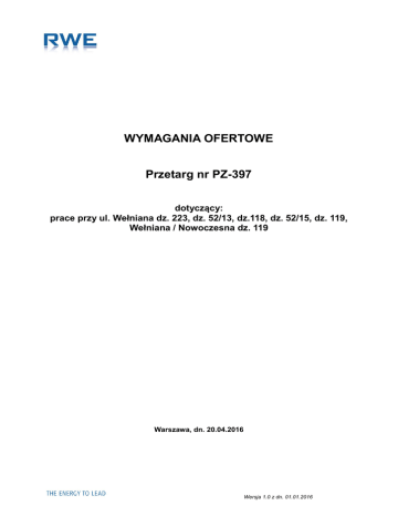 WYMAGANIA OFERTOWE Przetarg nr PZ-397 dotyczący: prace przy ul. Wełniana dz. 223, dz. 52/13, dz.118, dz. 52/15, dz. 119, Wełniana / Nowoczesna dz. 119 Warszawa, dn. 20.04.2016 Wersja 1.0 z dn. 01.01.2016 Przetarg nr PZ-397 1. Dane Ogólne 1.1. RWE Stoen Operator Spółką z ograniczoną odpowiedzialnością z siedzibą przy ul. Pięknej 46, w Warszawie, zwana dalej „Zamawiającym” w imieniu i na rzecz, którego działa: RWE Polska Spółka Akcyjna z siedzibą przy ul. Wybrzeże Kościuszkowskie 41 w Warszawie zaprasza do wzięcia udziału w Przetargu na: Realizacji prac przy ul. Wełniana dz. 223, dz. 52/13, dz.118, dz. 52/15, dz. 119, Wełniana / Nowoczesna dz. 119 Termin realizacji przedmiotu przetargu: 14.09.2016 1.2. O udzielenie zamówienia ubiegać się mogą Oferenci spełniający następujące warunki: 1.2.1. posiadają niezbędne uprawnienia do występowania w obrocie prawym; 1.2.2. pracownicy Oferenta posiadają niezbędne doświadczenie oraz uprawnienia do wykonywania prac będących przedmiotem Przetargu; 1.2.3. w ostatnich 5 latach zrealizowali co najmniej 3 zadania o charakterze i złożoności porównywalnej z zakresem Przetargu; 1.2.4. nie zalegają z płatnościami wobec Urzędu Skarbowego i ZUS oraz znajdują się w sytuacji finansowej pozwalającej na wykonanie przedmiotu Przetargu; 1.2.5. posiadają Certyfikat RWE Stoen Operator w zakresie wykonywania sieci elektroenergetycznych SN i nn; 2. Procedura Przetargowa 2.1. Etap I. Zgłoszenie chęci wzięcia udziału w Przetargu odbywa się na podstawie zeskanowanego wypełnionego i podpisanego Formularza Zgłoszenia (Załącznik 1), który 00 należy wysłać mailem w terminie do 26.04.2016r. do godziny 10 na e-mail: [email protected] 2.1.1. Zamawiający udostępni Oferentom materiały szkoleniowe dot. obsługi Portalu Dostawcy RWE. Po weryfikacji danych Oferenta materiały szkoleniowe zostaną wysłane drogą elektroniczną na adres e-mail podany na Formularzu Zgłoszenia. 2.2. ETAP II. Złożenie ofert za pośrednictwem Portalu Dostawcy RWE: https://supplier.rwe.com/irj/portal/. Oferta powinna zawierać: 2.2.1. wysokość wynagrodzenia za realizację przedmiotu Przetargu. Wycena przedmiotu Przetargu polega na podaniu kwot bez VAT, obejmujących całość przedmiotu Przetargu. Wynagrodzenie musi pokrywać wartość kompletnej realizacji przedmiotu Przetargu, w tym koszty inwentaryzacji, koszty uzyskania wszelkich niezbędnych do rozpoczęcia realizacji przedmiotu Przetargu opinii, uzgodnień, materiałów, pozwoleń, decyzji, itp.; 2.2.2. termin realizacji przedmiotu Przetargu. 2.2.3. Oświadczenie o sytuacji finansowej – odpowiedź na pytania postawione na portalu 2.3. Składanie oferty 2.3.1. Dokumenty wymienione w punkcie 2.2. należy złożyć w terminie do 28.04.2016r. do godziny 00 12 za pośrednictwem Portalu Dostawcy RWE: https://supplier.rwe.com/irj/portal/. 2.3.2. Oferta będzie wprowadzona do Portalu w języku polskim przez uprawnionego przedstawiciela Oferenta. 2 ... Przetarg nr PZ-397 2.3.3. Wszystkie oferty otrzymane przez Zamawiającego w formie innej niż za pośrednictwem Portalu Dostawcy RWE lub po terminie podanym powyżej nie będą rozpatrywane. 2.4. Pozostałe wymagania 2.4.1. Oferta zostanie przesłana bezpłatnie oraz w sposób niewiążący dla Zamawiającego. 2.4.2. Zaleca się, aby Oferent zdobył wszelkie informacje, które mogą być konieczne do przygotowania oferty oraz zaakceptowania umowy. 2.4.3. Każdy Oferent przedłoży tylko jedną ofertę sam lub jako reprezentant spółki. Oferent, który przedłoży więcej niż jedną ofertę zostanie wyłączony z postępowania. 2.4.4. Przy wyborze oferty Zamawiający będzie kierował się następującymi kryteriami: Cena ……………………………………………85% System oceny dostawców ………………………………….15% UWAGA – Oferent może zaproponować Zamawiającemu termin płatności inny niż 30 dni, tj. 45 lub 60 dni od daty otrzymania faktury. W takim przypadku w ramach kryterium cena łączna, przy wyborze oferty Zamawiający uwzględni przedstawiony przez Oferenta termin płatności Zaoferowanie terminu płatności 45 dni lub 60 dni zwiększy atrakcyjność oferty poprzez uwzględnienie stopy zwrotu z kosztu kapitału. 2.4.5. W szczególnie uzasadnionych przypadkach, przed upływem terminu składania ofert Zamawiający może zmodyfikować treść dokumentów Przetargowych. Każda wprowadzona przez Zamawiającego zmiana zostanie opublikowana na stronie internetowej Zamawiającego w dziale Przetargów. Zamawiający może przedłużyć wówczas termin składania ofert w celu umożliwienia Oferentom uwzględnienia w przygotowywanych ofertach otrzymanych zmian. W tym przypadku wszelkie prawa i zobowiązania Zamawiającego i Oferenta odnośnie wcześniej ustalonego terminu będą podlegały ewentualnemu nowemu terminowi. 2.4.6. Termin związania ofertą handlową wynosi 30 dni od daty jej złożenia. 2.4.7. Oferent może wprowadzać zmiany lub wycofać złożoną przez siebie ofertę do końca wyznaczonego w pkt. 2.2.1 terminu składania ofert Oferent nie może wycofać oferty i wprowadzać zmian w ofercie po upływie terminu składania ofert. 2.4.8. Wszystkie oferty będą oceniane przez Komisję Przetargową. 2.4.9. Komisja Przetargowa odrzuca oferty: a) nie odpowiadające w sposób oczywisty warunkom Przetargu; b) złożone bez wymaganych lub kompletnych dokumentów; c) nieczytelne lub budzące wątpliwości co do ich treści; d) złożone po terminie. 3 ... Przetarg nr PZ-397 2.4.10. Wybrany oferent zostanie powiadomiony o zasadach zawarcia umowy. Przetarg uznaje się za rozstrzygnięty w dniu zawarcia umowy z Oferentem, którego oferta została wybrana. 3. Postanowienia Końcowe 3.1. Zamawiający nie przewiduje stosowania preferencji. Wszyscy Oferenci ubiegający się o realizację przedmiotu Przetargu będą traktowani na równych prawach z zachowaniem zasad uczciwej konkurencji. 3.2. Zamawiający zastr