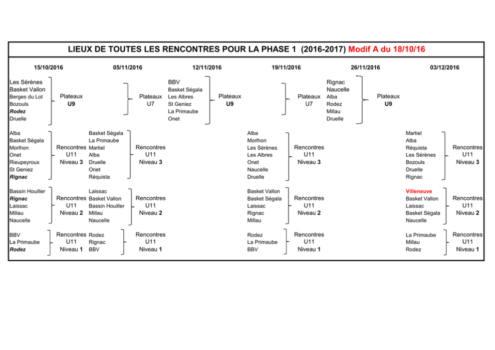 LIEUX DE TOUTES LES RENCONTRES POUR LA PHASE 1 (2016-2017) Modif A du 18/10/16 15/10/2016 05/11/2016 Les Sérènes Basket Vallon Berges du Lot Bozouls Rodez Druelle 12/11/2016 19/11/2016 BBV Plateaux U9 Plateaux U7 Alba Basket Ségala Morlhon Onet Rieupeyroux St Geniez Rignac Basket Ségala La Primaube Rencontres Martiel U11 Alba Niveau 3 Druelle Onet Réquista Bassin Houiller Rignac Laissac Millau Naucelle Rencontres Basket Vallon U11 Bassin Houiller Niveau 2 Millau BBV La Primaube Rodez Rencontres Rodez U11 Rignac Niveau 1 BBV Basket Ségala Les Albres St Geniez La Primaube Onet Plateaux U9 Plateaux U7 Rencontres U11 Niveau 3 Rencontres U11 Niveau 2 Rencontres U11 Niveau 1 Naucelle 03/12/2016 Rignac Naucelle Alba Morlhon Les Sérènes Les Albres Onet Naucelle Druelle Laissac 26/11/2016 Alba Rodez Millau Druelle Plateaux U9 Rencontres U11 Niveau 3 Martiel Alba Réquista Les Sérènes Bozouls Druelle Rignac Rencontres U11 Niveau 3 Basket Vallon Basket Ségala Laissac Rignac Millau Rencontres U11 Niveau 2 Villeneuve Basket Vallon Laissac Basket Ségala Naucelle Rencontres U11 Niveau 2 Rodez La Primaube BBV Rencontres U11 Niveau 1 La Primaube Millau Rodez Rencontres U11 Niveau 1