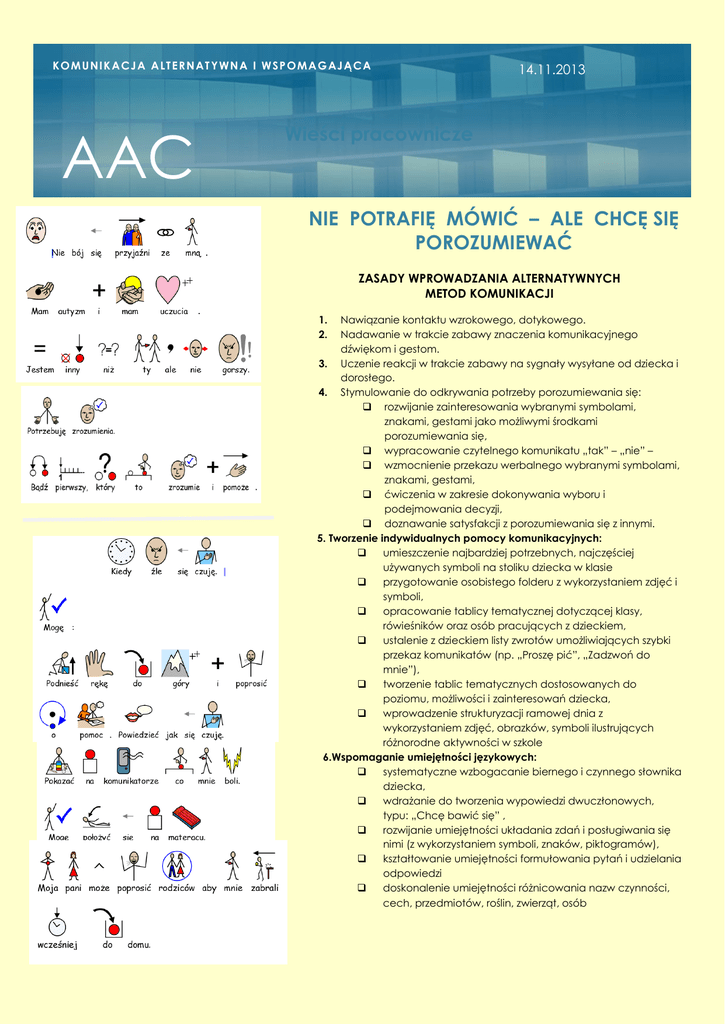K O M U NI K A CJ A A L T E R N AT Y W N A I W S P O M A G AJ Ą CA AAC Fragment z głównego tekstu mający wzbudzić zainteresowanie u czytelnika. 14.11.2013 Wieści pracownicze NIE POTRAFIĘ MÓWIĆ – ALE CHCĘ SIĘ POROZUMIEWAĆ ZASADY WPROWADZANIA ALTERNATYWNYCH METOD KOMUNIKACJI 1. 2. Nawiązanie kontaktu wzrokowego, dotykowego. Nadawanie w trakcie zabawy znaczenia komunikacyjnego dźwiękom i gestom. 3. Uczenie reakcji w trakcie zabawy na sygnały wysyłane od dziecka i dorosłego. 4. Stymulowanie do odkrywania potrzeby porozumiewania się: rozwijanie zainteresowania wybranymi symbolami, znakami, gestami jako możliwymi środkami porozumiewania się, wypracowanie czytelnego komunikatu „tak” – „nie” – wzmocnienie przekazu werbalnego wybranymi symbolami, znakami, gestami, ćwiczenia w zakresie dokonywania wyboru i podejmowania decyzji, doznawanie satysfakcji z porozumiewania się z innymi. 5. Tworzenie indywidualnych pomocy komunikacyjnych: umieszczenie najbardziej potrzebnych, najczęściej używanych symboli na stoliku dziecka w klasie przygotowanie osobistego folderu z wykorzystaniem zdjęć i symboli, opracowanie tablicy tematycznej dotyczącej klasy, rówieśników oraz osób pracujących z dzieckiem, ustalenie z dzieckiem listy zwrotów umożliwiających szybki przekaz komunikatów (np. „Proszę pić”, „Zadzwoń do mnie”), tworzenie tablic tematycznych dostosowanych do poziomu, możliwości i zainteresowań dziecka, wprowadzenie strukturyzacji ramowej dnia z wykorzystaniem zdjęć, obrazków, symboli ilustrujących różnorodne aktywności w szkole 6.Wspomaganie umiejętności językowych: systematyczne wzbogacanie biernego i czynnego słownika dziecka, wdrażanie do tworzenia wypowiedzi dwuczłonowych, typu: „Chcę bawić się” , rozwijanie umiejętności układania zdań i posługiwania się nimi (z wykorzystaniem symboli, znaków, piktogramów), kształtowanie umiejętności formułowania pytań i udzielania odpowiedzi doskonalenie umiejętności różnicowania nazw czynności, cech, przedmiotów, roślin, zwierząt, osób STRONA 2 7. AAC Wspomaganie umiejętności komunikacyjnych: kształtowanie potrzeby i nawyku stałego posiadania przy sobie książki do komunikacji rozwijanie umiejętności posługiwania się książką komunikacyjną – utrwalanie znaczenia poznanych symboli i ich rozmieszczenia w książce, wdrażanie do korzystania z książki komunikacyjnej podczas różnorodnych sytuacji szkolnych rozwijanie umiejętności łączenia podczas rozmowy piktogramów, symboli, gestów, komunikatów werbalnych, sylab, mimiki, zastosowanie urządzeń odtwarzających głos (MÓWIK komputer ze specjalistycznym oprogramowaniem), aranżowanie sytuacji sprzyjających nawiązywaniu kontaktów z rówieśnikami, 8. Wykorzystanie umiejętności komunikacyjnych pozaszkolnych (lekarz, sklep, poczta, fryzjer) TECHNIKI UŻYWANIA SYMBOLI TABLICE UCZESTNICTWA PLANY DNIA . KALENDARZ TABLICE CZASU I POGODY ETYKIETY NA OBIEKTACH PLAKATY TABLICE TEMATYCZNE KSIĄŻKI KOMUNIKACYJNE KOMPUTERY Z OPROGRAMOWAMNIEM TABLETY- KOMUNIKATORY w sytuacjach