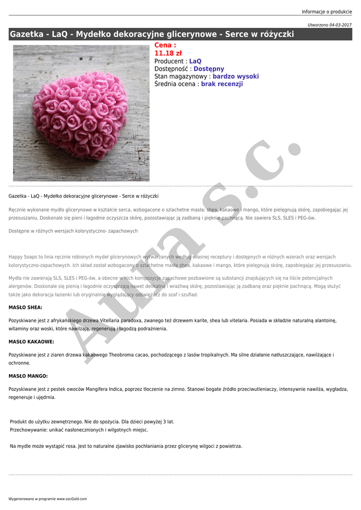 Informacje o produkcie Utworzono 04-03-2017 Gazetka - LaQ - Mydełko dekoracyjne glicerynowe - Serce w różyczki Cena : 11.18 zł s. c. Producent : LaQ Dostępność : Dostępny Stan magazynowy : bardzo wysoki Średnia ocena : brak recenzji Gazetka - LaQ - Mydełko dekoracyjne glicerynowe - Serce w różyczki Ręcznie wykonane mydło glicerynowe w kształcie serca, wzbogacone o szlachetne masła: shea, kakaowe i mango, które pielęgnują skórę, zapobiegając jej przesuszaniu. Doskonale się pieni i łagodnie oczyszcza skórę, pozostawiając ją zadbaną i pięknie pachnącą. Nie zawiera SLS, SLES i PEG-ów. a Dostępne w różnych wersjach kolorystyczno- zapachowych Happy Soaps to linia ręcznie robionych mydeł glicerynowych wytwarzanych według własnej receptury i dostępnych w różnych wzorach oraz wersjach Au r kolorystyczno-zapachowych. Ich skład został wzbogacony o szlachetne masła shea, kakaowe i mango, które pielęgnują skórę, zapobiegając jej przesuszaniu. Mydła nie zawierają SLS, SLES i PEG-ów, a obecne w nich kompozycje zapachowe pozbawione są substancji znajdujących się na liście potencjalnych alergenów. Doskonale się pienią i łagodnie oczyszczają nawet delikatną i wrażliwą skórę, pozostawiając ją zadbaną oraz pięknie pachnącą. Mogą służyć także jako dekoracja łazienki lub oryginalnie wyglądający odświeżacz do szaf i szuflad. MASŁO SHEA: Pozyskiwane jest z afrykańskiego drzewa Vitellaria paradoxa, zwanego też drzewem karite, shea lub vitelaria. Posiada w składzie naturalną alantoinę, witaminy oraz woski, które nawilżają, regenerują i łagodzą podrażnienia. MASŁO KAKAOWE: Pozyskiwane jest z ziaren drzewa kakaowego Theobroma cacao, pochodzącego z lasów tropikalnych. Ma silne działanie natłuszczające, nawilżające i ochronne. MASŁO MANGO: Pozyskiwane jest z pestek owoców Mangifera Indica, poprzez tłoczenie na zimno. Stanowi bogate źródło przeciwutleniaczy, intensywnie nawilża, wygładza, regeneruje i ujędrnia. Produkt do użytku zewnętrznego. Nie do spożycia. Dla dzieci powyżej 3 lat. Przechowywanie: unikać nasłonecznionych i wilgotnych miejsc. Na mydle może wystąpić rosa. Jest to naturalne zjawisko pochłaniania przez glicerynę wilgoci z powietrza. Wygenerowano w programie www.oscGold.com