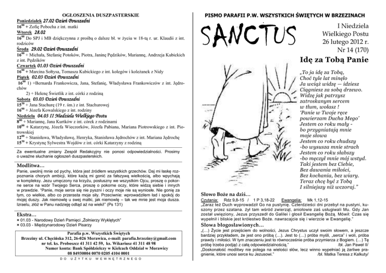 OGŁOSZENIA DUSZPASTERSKIE Poniedziałek 27.02 27.02 Dzień Powszedni 1600 + Zofię Pobocha z int. matki Wtorek 28.02 1600 Do SPJ i MB dziękczynna z prośbą o dalsze bł. w życiu w 18-tą r. ur. Klaudii z int. rodziców Środa 29.02 Dzień Powszedni 1600 + Michała, Stefanię Potoków, Piotra, Janinę Pędzików, Mariannę, Andrzeja Kubickich z int. Pędzików Czwartek 01.03 Dzień Powszedni 1600 + Marcina Sołtysa, Tomasza Kubickiego z int. kolegów i koleżanek z Nidy Piątek 02.03 Dzień Powszedni 1600 1) +Bernarda Frankowicza, Jana, Stefanię, Władysława Frankowiczów z int. Jędrochów 2) + Helenę Świetlik z int. córki z rodziną Sobota 03.03 Dzień Powszedni 1530 + Jana Stachurę (19 r. śm.) z int. Stachurowej 1600 + Józefa Kowalskiego z int. rodziny Niedziela 04.03 II Niedziela Niedziela Wielkiego Postu 800 + Mariannę, Jana Kurtków z int. córek z rodzinami 1000 + Katarzynę, Józefa Wieczorków, Józefa Pabiana, Mariana Piotrowskiego z int. Piotrowskiej 1200 + Stanisława, Władysławę, Henryka, Stanisława Jędrochów z int. Mariana Jędrochę 1530 + Krystynę Sylwestra Wojdów z int. córki Katarzyny z rodziną PISMO PARAFII P.W. WSZYSTKICH ŚWIĘTYCH W BRZEZINACH SANC SANCTUS Idę za Tobą Panie „To ja idę za Tobą, Choć tyle lat minęło Ja wciąż widzę — idziesz Ciągniesz za sobą drzewo. Widzę jak patrzysz zatroskanym sercem w tłum, wołasz ! ‘Panie w Twoje ręce powierzam Ducha Mego’ Jestem co roku mały bo przygniatają mnie moje słowa Jestem co roku chudszy -bo wysusza mnie strach Jestem co roku słabszy -bo męczył mnie mój wstyd. Taki jestem bez Ciebie, Bez dawania miłości, Bez kochania, bez wiary. Teraz chcę być z Tobą I silniejszy niż wczoraj.” Za ewentualne zmiany Zespół Redakcyjny nie ponosi odpowiedzialności. Prosimy o uważne słuchanie ogłoszeń duszpasterskich. Modlitwa… Panie, uwolnij mnie od pychy, która jest źródłem wszystkich grzechów. Daj mi łaskę rozpoznania chorych ambicji, które każą mi gonić za fałszywą wielkością, albo wpychają w kompleksy. Jezu umęczony na krzyżu, posłuszny we wszystkim Ojcu, proszę o pokorne serce na wzór Twojego Serca, proszę o pokorne oczy, które widzą siebie i innych w prawdzie. “Panie, moje serce się nie pyszni i oczy moje nie są wyniosłe. Nie gonię za tym, co wielkie, albo co przerasta moje siły. Przeciwnie: wprowadziłem ład i spokój do mojej duszy. Jak niemowlę u swej matki, jak niemowlę – tak we mnie jest moja dusza. Izraelu, złóż w Panu nadzieję odtąd aż na wieki!” (Ps 131) Ekstra… × 01.03 - Narodowy Dzień Pamięci „Żołnierzy Wyklętych” × 03.03 - Międzynarodowy Dzień Pisarzy Parafia p.w. Wszystkich Świętych Brzeziny ul. Chęcińska 312, 26-026 Morawica, e-mail: [email protected] nr tel. ks. Proboszcz 41 311 42 59, ks. Wikariusz 41 311 48 98 Numer konta: Bank Spółdzielczy w Kielcach Oddział w Morawicy 08 84930004 0070 0205 4104 0001 D O U Ż Y T K U W E W N Ę T R Z N E G O I Niedziela Wielkiego Postu 26 lutego 2012 r. Nr 14 (170) Słowo Boże na dziś… Czytania: Rdz 9,8-15 / 1 P 3,18-22 Ewangelia: Mk 1,12-15 „Zaraz też Duch wyprowadził Go na pustynię. Czterdzieści dni przebył na pustyni, kuszony przez szatana. żył tam wśród zwierząt, aniołowie zaś usługiwali Mu. Gdy Jan został uwięziony, Jezus przyszedł do Galilei i głosił Ewangelię Bożą. Mówił: Czas się wypełnił i bliskie jest królestwo Boże. nawracajcie się i wierzcie w Ewangelię.” Słowa błogosławionych… „(…) Życie jest przejściem do wolności, Jezus Chrystus uczył swoim słowem, a jeszcze bardziej przykładem, że jest ono próbą (…). Jest to (…) próba myśli, „serca” i woli, próba prawdy i miłości. W tym znaczeniu jest to równocześnie próba przymierza z Bogiem. (…) Tę próbę trzeba podjąć z całą odpowiedzialnością.” /bł. Jan Paweł II/ „Doskonałość modlitwy nie polega na wielości słów, lecz winno wypełniać ją żarliwe pragnienie, które unosi serce ku Jezusowi.” /bł. Matka Teresa z Kalkuty/ A w parafii… Boży człowiek… - św. Paula Montal (26 lutego) ▪ W środę popielcową rozpoczął się Wielki Post. Zachęcamy do uczestnictwa w nabożeństwie Drogi Krzyżowej (każdy piątek) i Gorzkich Żali (każda niedziela). ▪ 2 marca przypada pierwszy piątek miesiąca. Zapraszamy na spowiedź i mszę św. ▪ Stowarzyszenie Przyjaciół Brzezin i Podwola serdecznie zaprasza miłośników regionu i historii „małych ojczyzn" oraz osoby związane z Brzezinami na promocję książki "Brzeziny. Nasza mała historia", która odbędzie się w dziś (26 lutego 2012 r.) o godz. 16.30 w Zespole Szkół im. Jana Pawła II w Brzezinach. Paula Montal urodziła się 11 października 1799 r. niedaleko Barcelony w Hiszpanii. Otrzymała staranne i głębokie wychowanie religijne. W wieku 10 lat straciła ojca. Aby pomóc w utrzymaniu rodziny, zaczęła pracować jako hafciarka. Pomagała w swojej parafii w katechizacji dzieci i młodzieży. Przez to doświadczenie zobaczyła, jak ważne jest odpowiednie przygotowanie intelektualne i zawodowe młodych kobiet. W 1829 r., pokonując rozliczne trudności, udała się do Figueras i założyła tam pierwszą szkołę dla dziewcząt. Dbała w niej o formację chrześcijańską i ogólnoludzką. Wkrótce zaczęły powstawać kolejne szkoły. W 1847 r. założyła Zgromadzenie Córek Maryi Sióstr Szkół Pobożnych (pijarki). Od 1859 r. aż do śmierci przebywała w Olesa de Montserrat. Poprzez trud wychowawczy, a także przez ufną modlitwę uczestniczyła w przeżywaniu losów nowego zgromadzenia. W chwili jej śmierci liczyło ono 19 domów, w których mieszkało ponad 300 sióstr. Paula Montal zmarła 26 lutego 1889 r. w Olesa de Montserrat. Beatyfikował ją Jan Paweł II w kwietniu 1983 r.; w listopadzie 2001 r. włączył ją do grona świętych. Modlitwa: „Spójrz Miłości moja, udaję się na spoczynek, w tabernakulum zostawiam Ci 