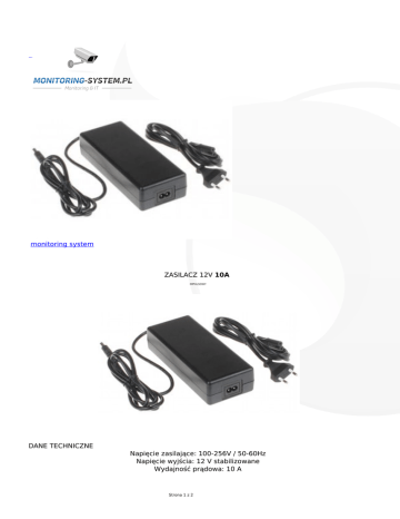 monitoring system ZASILACZ 12V 10A IMPULSOWY DANE TECHNICZNE Napięcie zasilające: 100-256V / 50-60Hz Napięcie wyjścia: 12 V stabilizowane Wydajność prądowa: 10 A Strona 1 z 2 Wyjście: wtyk 2.1 / 5.5 mm na przewodzie Uwaga! Wydajność prądowa zasilacza przekracza prąd znamionowy pojedynczej łączówki/gniazda zasilania (zobacz elementy współpracujące). Zasilacz jest przeznaczony do współpracy z kilkoma łączówkami/gniazdami jednocześnie, gdyż posiadają one możliwość łączenia równoległego. Jeżeli zasilacz przeznaczony jest do pracy ciągłej (24H) to prąd znamionowy zasilacza nie powinien przekraczać 80% prądu maksymalnego. Należy zwrócić szczególną uwagę na prawidłowe chłodzenie zasilacza podczas pracy! Strona 2 z 2