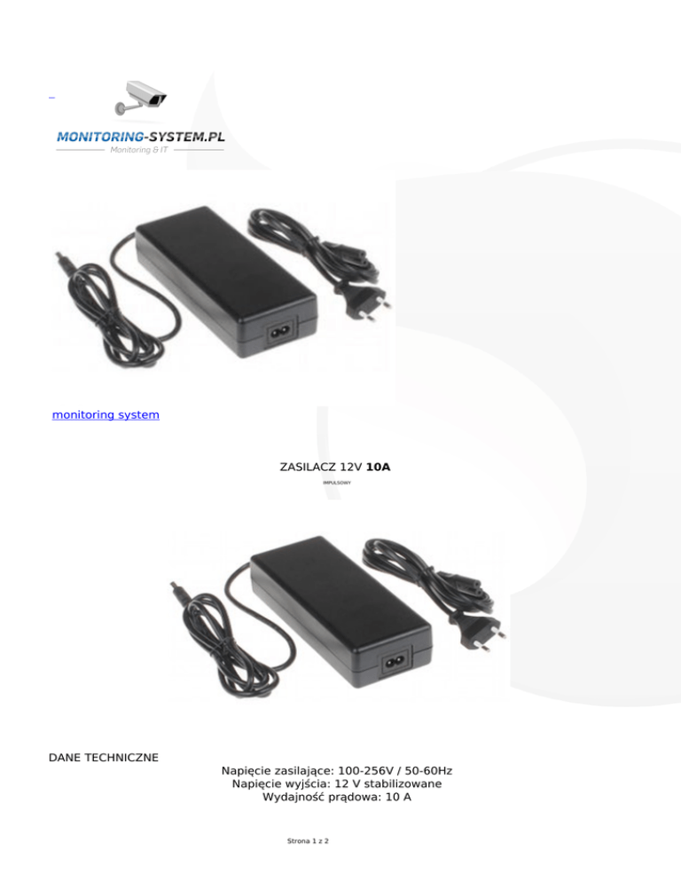 monitoring system ZASILACZ 12V 10A DANE TECHNICZNE