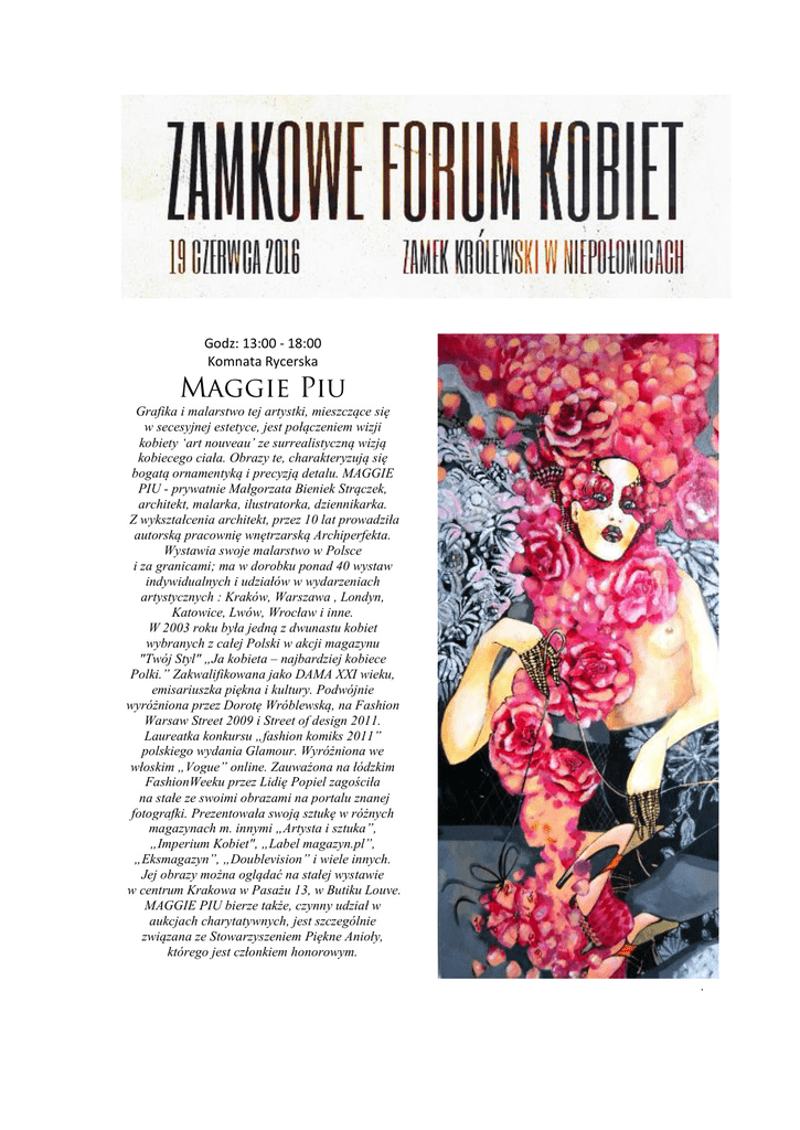 Godz: 13:00 - 18:00 Komnata Rycerska Maggie Piu Grafika i malarstwo tej artystki, mieszczące się w secesyjnej estetyce, jest połączeniem wizji kobiety ‘art nouveau’ ze surrealistyczną wizją kobiecego ciała. Obrazy te, charakteryzują się bogatą ornamentyką i precyzją detalu. MAGGIE PIU - prywatnie Małgorzata Bieniek Strączek, architekt, malarka, ilustratorka, dziennikarka. Z wykształcenia architekt, przez 10 lat prowadziła autorską pracownię wnętrzarską Archiperfekta. Wystawia swoje malarstwo w Polsce i za granicami; ma w dorobku ponad 40 wystaw indywidualnych i udziałów w wydarzeniach artystycznych : Kraków, Warszawa , Londyn, Katowice, Lwów, Wrocław i inne. W 2003 roku była jedną z dwunastu kobiet wybranych z całej Polski w akcji magazynu "Twój Styl" „Ja kobieta – najbardziej kobiece Polki.” Zakwalifikowana jako DAMA XXI wieku, emisariuszka piękna i kultury. Podwójnie wyróżniona przez Dorotę Wróblewską, na Fashion Warsaw Street 2009 i Street of design 2011. Laureatka konkursu „fashion komiks 2011” polskiego wydania Glamour. Wyróżniona we włoskim „Vogue” online. Zauważona na łódzkim FashionWeeku przez Lidię Popiel zagościła na stałe ze swoimi obrazami na portalu znanej fotografki. Prezentowała swoją sztukę w różnych magazynach m. innymi „Artysta i sztuka”, „Imperium Kobiet", „Label magazyn.pl”, „Eksmagazyn”, „Doublevision” i wiele innych. Jej obrazy można oglądać na stałej wystawie w centrum Krakowa w Pasażu 13, w Butiku Louve. MAGGIE PIU bierze także, czynny udział w aukcjach charytatywnych, jest szczególnie związana ze Stowarzyszeniem Piękne Anioły, którego jest członkiem honorowym. .
