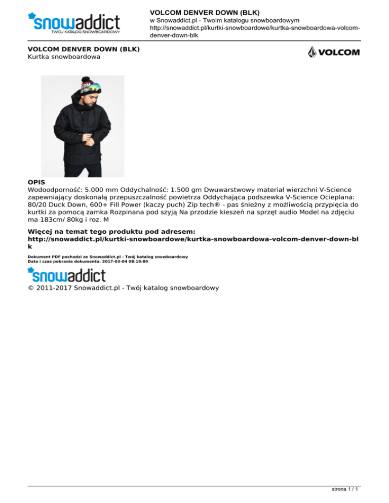 VOLCOM DENVER DOWN (BLK) w Snowaddict.pl - Twoim katalogu snowboardowym http://snowaddict.pl/kurtki-snowboardowe/kurtka-snowboardowa-volcomdenver-down-blk VOLCOM DENVER DOWN (BLK) Kurtka snowboardowa OPIS Wodoodporność: 5.000 mm Oddychalność: 1.500 gm Dwuwarstwowy materiał wierzchni V-Science zapewniający doskonałą przepuszczalność powietrza Oddychająca podszewka V-Science Ocieplana: 80/20 Duck Down, 600+ Fill Power (kaczy puch) Zip tech® - pas śnieżny z możliwością przypięcia do kurtki za pomocą zamka Rozpinana pod szyją Na przodzie kieszeń na sprzęt audio Model na zdjęciu ma 183cm/ 80kg i roz. M Więcej na temat tego produktu pod adresem: http://snowaddict.pl/kurtki-snowboardowe/kurtka-snowboardowa-volcom-denver-down-bl k Dokument PDF pochodzi ze Snowaddict.pl - Twój katalog snowboardowy Data i czas pobrania dokumentu: 2017-03-04 08:19:09 © 2011-2017 Snowaddict.pl - Twój katalog snowboardowy strona 1 / 1 Powered by TCPDF (www.tcpdf.org)