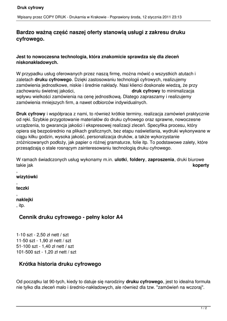 Druk cyfrowy Wpisany przez COPY DRUK - Drukarnia w Krakowie - Poprawiony środa, 12 stycznia 2011 23:13 Bardzo ważną część naszej oferty stanowią usługi z zakresu druku cyfrowego. Jest to nowoczesna technologia, która znakomicie sprawdza się dla zleceń niskonakładowych. W przypadku usług oferowanych przez naszą firmę, można mówić o wszystkich atutach i zaletach druku cyfrowego. Dzięki zastosowaniu technologii cyfrowych, realizujemy zamówienia jednostkowe, niskie i średnie nakłady. Nasi klienci doskonale wiedzą, że przy zachowaniu świetnej jakości, druk cyfrowy to minimalizacja wpływu wielkości zamówienia na cenę jednostkową. Dlatego zapraszamy i realizujemy zamówienia mniejszych firm, a nawet odbiorców indywidualnych. Druk cyfrowy i współpraca z nami, to również krótkie terminy, realizacja zamówień praktycznie od ręki. Szybkie przygotowanie materiałów do druku cyfrowego oraz sprawne, nowoczesne urządzenia, to gwarancja jakości i ekspresowej realizacji zleceń. Specyfika procesu, który opiera się bezpośrednio na plikach graficznych, bez etapu naświetlania, wydruki wykonywane w ciągu kilku godzin, wysoka jakość, personalizacja druków, a także wykorzystanie zróżnicowanych podłoży, jak papier o różnej gramaturze, folie itp. To podstawowe zalety, które przesądzają o stale rosnącym zainteresowaniu technologią druku cyfrowego. W ramach świadczonych usług wykonamy m.in. ulotki, foldery, zaproszenia, druki biurowe takie jak koperty , wizytówki , teczki , naklejki , itp. Cennik druku cyfrowego - pełny kolor A4 1-10 szt - 2,50 zł nett / szt 11-50 szt - 1,90 zł nett / szt 51-100 szt - 1,40 zł nett / szt 101-500 szt - 1,20 zł nett / szt Krótka historia druku cyfrowego Od początku lat 90-tych, kiedy to datuje się narodziny druku cyfrowego, jest to idealna formuła nie tylko dla zleceń mało i średnio-nakładowych, ale również dla tzw. "zamówień na wczoraj". 1/2 Druk cyfrowy Wpisany przez COPY DRUK - Drukarnia w Krakowie - Poprawiony środa, 12 stycznia 2011 23:13 Od roku 1993, kiedy pojawiły się pierwsze rozwiązania z zakresu druku cyfrowego, można mówić o swoistej rewolucji w dziedzinie poligrafii. Komputeryzacja i zmiany w procesach produkcyjnych, jakie niesie druk cyfrowy, stworzyły ogromne szanse dla mniejszych przedsiębiorstw specjalizujących się w usługach DTP. Kończąc niejako czasy monopolu wielkich drukarni i wydawnictw, które dominowały na rynku usług poligraficznych. Korzystają na tym również zleceniodawcy, którzy niezależnie od nakładu, mogą teraz realizować wizję prezentacji graficznej, wydawnictw niszowych, debiutanckich itp., nie ponosząc przy tym wysokich kosztów. 2/2