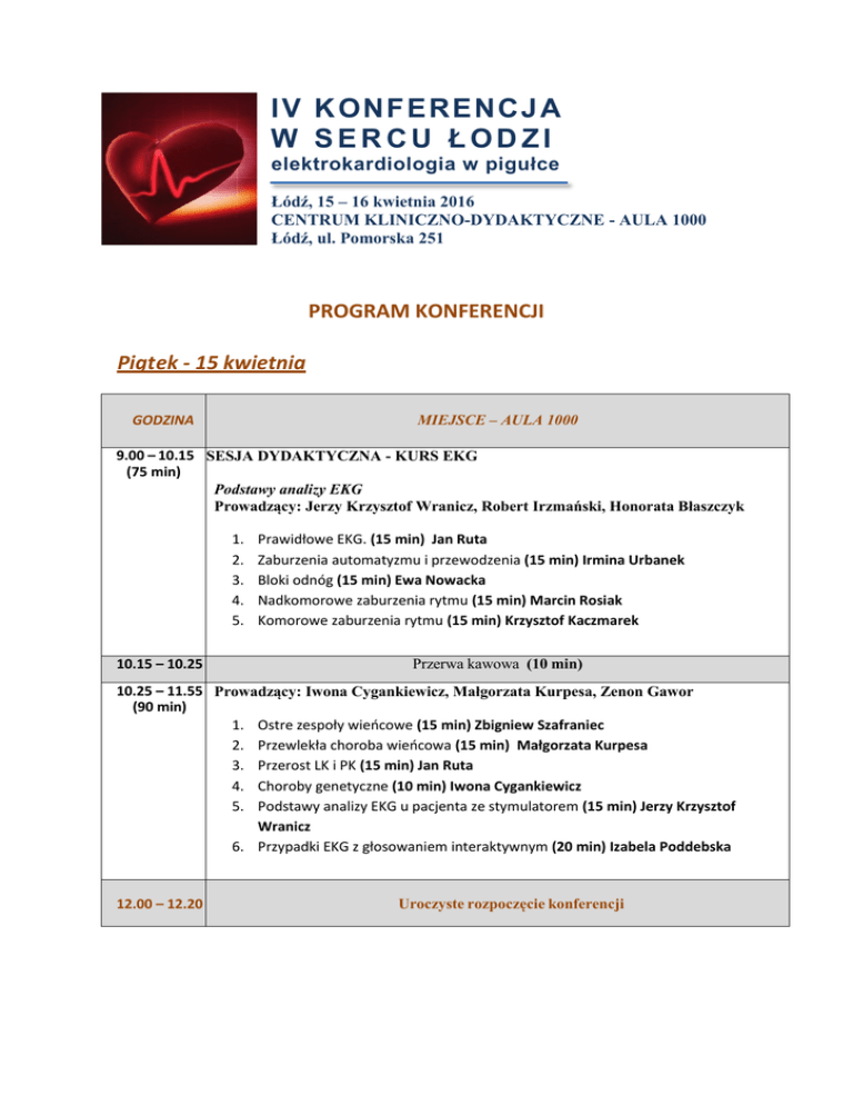 IV KON F ER ENCJA W SERCU ŁODZI elektrokardiologia w pigułce Łódź, 15 – 16 kwietnia 2016 CENTRUM KLINICZNO-DYDAKTYCZNE - AULA 1000 Łódź, ul. Pomorska 251 PROGRAM KONFERENCJI Piątek - 15 kwietnia MIEJSCE – AULA 1000 GODZINA 9.00 – 10.15 SESJA DYDAKTYCZNA - KURS EKG (75 min) Podstawy analizy EKG Prowadzący: Jerzy Krzysztof Wranicz, Robert Irzmański, Honorata Błaszczyk 1. 2. 3. 4. 5. 10.15 – 10.25 Prawidłowe EKG. (15 min) Jan Ruta Zaburzenia automatyzmu i przewodzenia (15 min) Irmina Urbanek Bloki odnóg (15 min) Ewa Nowacka Nadkomorowe zaburzenia rytmu (15 min) Marcin Rosiak Komorowe zaburzenia rytmu (15 min) Krzysztof Kaczmarek Przerwa kawowa (10 min) 10.25 – 11.55 Prowadzący: Iwona Cygankiewicz, Małgorzata Kurpesa, Zenon Gawor (90 min) 1. Ostre zespoły wieńcowe (15 min) Zbigniew Szafraniec 2. Przewlekła choroba wieńcowa (15 min) Małgorzata Kurpesa 3. Przerost LK i PK (15 min) Jan Ruta 4. Choroby genetyczne (10 min) Iwona Cygankiewicz 5. Podstawy analizy EKG u pacjenta ze stymulatorem (15 min) Jerzy Krzysztof Wranicz 6. Przypadki EKG z głosowaniem interaktywnym (20 min) Izabela Poddebska 12.00 – 12.20 Uroczyste rozpoczęcie konferencji 12.20 – 13.50 (90 min) Nowości w farmakoterapii zaburzeń rytmu i niewydolności serca Prowadzący: Marzenna Zielińska, Marlena Broncel, Józef Drzewoski 1. 2. 3. 4. 5. Przewlekła niewydolność serca (15min) Jarosław Drożdż Kontrola częstości akcji serca (10 min) Paweł Ptaszyński Leki antyarytmiczne w migotaniu przedsionków (10 min) Zbigniew Szafraniec Leki przeciwzakrzepowe w migotaniu przedsionków (15 min) Michał Plewka Leczenie farmakologiczne komorowych zaburzeń rytmu serca (10min) Małgorzata Kurpesa 6. Przypadki kliniczne z głosowaniem interaktywnym (30min) 13.50 – 14.20 Przerwa lunchowa (30 min) 14.20 – 15.20 Nowości w elektrokardiologii (60 min) Prowadzący: Iwona Cygankiewicz, Jerzy Krzysztof Wranicz, Paweł Ptaszyński 1. Bezelektrodowy stymulator serca (20 min) Aleksander Maciąg 2. Podskórny kardiowerter-defibrylator (S-ICD) (20 min) Paweł Ptaszyński 3. Kamizelka Life Vest jako alternatywa dla ICD – (20 min) Iwona Cygankiewicz 15.20 – 15.30 Przerwa kawowa (10 min) 15.30 – 17.10 Wskazania do zabiegów elektroterapii (100 min) Prowadzący: Krzysztof Kaczmarek, Grzegorz Piotrowski, Zbigniew Bednarkiewicz 1. Diagnostyka omdleń (10 min) Irmina Urbanek 2. Wskazania do implantacji stymulatora serca (10 min) Artur Klimczak 3. Wskazania do implantacji kardiowertera-defibrylatora (ICD) (10 min) Zbigniew Szafraniec 4. Wskazania do terapii resynchronizującej (CRT/CRT-D) (10 min) Artur Klimczak 5. Wskazania do ablacji (15 min) Krzysztof Kaczmarek 6. Wskazania do usunięcia urządzenia wszczepialnego (10 min) Andrzej Oszczygieł 7. Przypadki kliniczne z głosowaniem interaktywnym (35 min) 17.10 – 17.20 Przerwa kawowa (10 min) 17.20 – 18.20 Interpretacja ECG- quiz (głosowanie interaktywne) (60 min) SESJE WARSZTATOWE SALA 01.22 I TURA godz. 10.00 – 10.45 II TURA godz. 11.00 – 11.45 (obowiązują zapisy) (45 min) SESJA A Prowadzący: Stefan Karczmarewicz, Bartłomiej Szwarc Co nie-elektrofizjolog powinien wiedzieć o przygotowaniu pacjenta z implantowanym urządzeniem wszczepialnym (stymulator serca, ICD, CRT) do niekardiochirurgicznego zabiegu operacyjnego i innych procedur medycznych I TURA godz. 15.00 – 15.45 II TURA godz. 16.00 – 16.45 (obowiązują zapisy) (45 min) SESJA B Prowadzący: Stefan Karczmarewicz, Bartłomiej Szwarc Czego nie-elektrofizjolog może się spodziewać po układzie stymulującym serce, wszczepionym kardiowerterze-defibrylatorze lub układzie resynchronizującym Sobota - 16 kwietnia GODZINA MIEJSCE – AULA 1000 9.00 – Zabiegi elektroterapii - jak wytłumaczyć pacjentowi na czym polega zabieg? - pokazy 10.15 filmowe (75 Prowadzący: Paweł Ptaszyński, Zbigniew Bednarkiewicz, Grzegorz Piotrowski min) 1. Zabieg kardiowersji (10 min) Irmina Urbanek 2. Zabieg implantacji kardiologicznego urządzenia wszczepialnego (rozrusznik/ICD/CRT) (20 min) Michał Chudzik 3. Na czym polega zabieg usunięcia rozrusznika/ICD/CRT? (10 min) Andrzej Oszczygieł 4. Zabieg ablacji (20 min) Paweł Ptaszyński, Krzysztof Kaczmarek 5. Inne nowoczesne zabiegi w elektroterapii: okluder uszka, ablacja tętnic nerkowych, stymulacja nerwu błędnego, CCM (15 min) Michał Kałowski 10.15 – 10.25 Przerwa kawowa (10 min) 10.25 – 12.05 (90 min) Chory z zaburzeniami rytmu lub/i urządzeniem wszczepialnym Prowadzący: Krzysztof Kaczmarek, Honorata Błaszczyk, Paweł Lewek 1. Co wolno a czego nie wolno pacjentowi po implantacji (15min) Marcin Rosiak 2. Chory po implantacji stymulatora /CRT wymagający pilnej hospitalizacji (15 min) Michał Chudzik 3. Chory po implantacji ICD wymagający pilnej hospitalizacji (10 min) Krzysztof Kaczmarek 4. Zabiegi i operacje u chorych leczonych przeciwzakrzepowo (10 min) Monika Kosmalska- Różycka 5. Zabiegi i operacje u chorych z urządzeniem implantowanym (10 min) Michał Kałowski 6. Rehabilitacja u chorych z wszczepionym urządzeniem (15 min) Robert Irzmański 7. Problemy psychologiczne chorego z urządzeniem wszczepialnym lub zaburzeniami rytmu serca (15 min) Katarzyna Mikinka 12.05 – 12.15 Przerwa kawowa (10 min) 12.15 – 13.55 Przypadki kliniczne: Chorzy typowi - wskazania do zabiegów (90 min) Sesja z możliwością głosowania interaktywnego Prowadzący: Michał Chudzik, Zbigniew Bednarkiewicz, Andrzej Bęben Przypadki przedstawiają asystenci Kliniki Elektrokardiologii 1. Chory do implantacji rozrusznika Daria Bałczewska 2. Chory do implantacji ICD Irmina Urbanek 3. Chory do implantacji CRT Bożena Urbanek 4. Chory do usunięcia układu wszczepialnego Michał Kałowski 5. Chory z przedwczesnymi pobudzeniami komorowymi i/lub nadkomorowymi Barbara Cyranik 6. Chory z migotaniem przedsionków leczony zachowawczo Artur Klimczak 7. Chory kierowany na ablację Zbigniew Szafraniec 13.55 – 14.40 Przerwa lunchowa (45 min) Zakończenie konferencji R