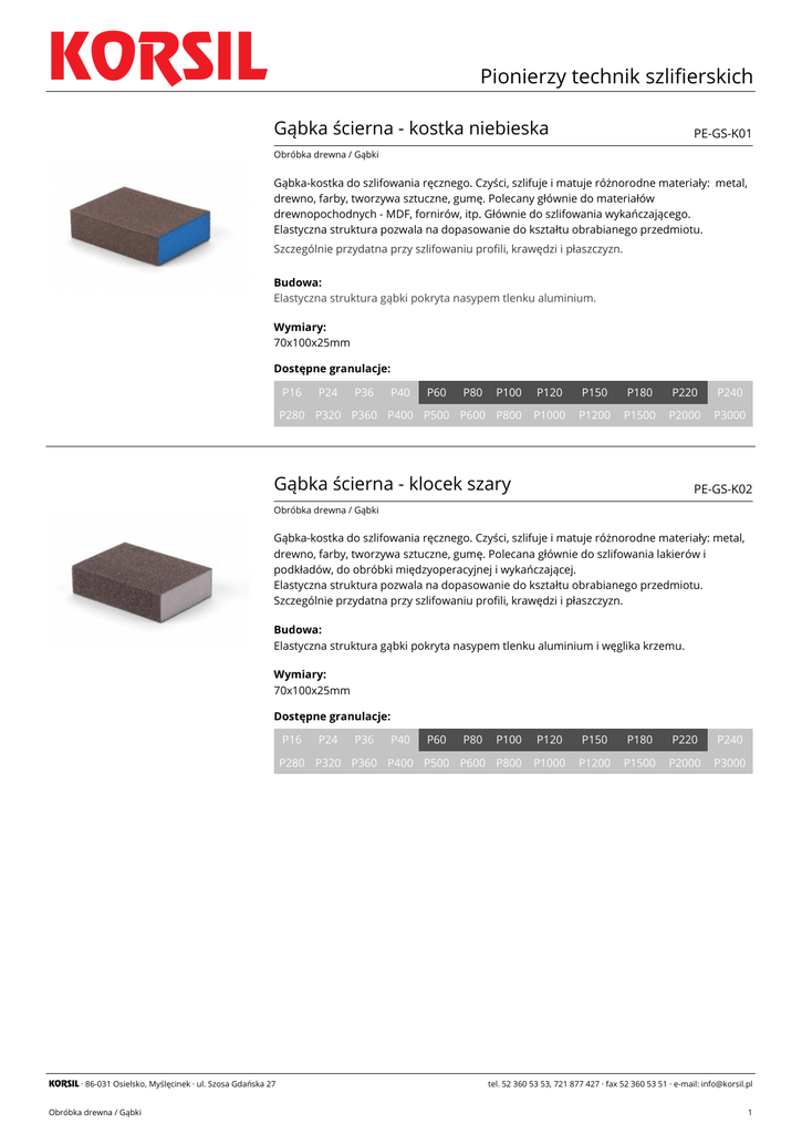 KORSIL Pionierzy technik szlifierskich Gąbka ścierna - kostka niebieska PE-GS-K01 Obróbka drewna / Gąbki Gąbka-kostka do szlifowania ręcznego. Czyści, szlifuje i matuje różnorodne materiały: metal, drewno, farby, tworzywa sztuczne, gumę. Polecany głównie do materiałów drewnopochodnych - MDF, fornirów, itp. Głównie do szlifowania wykańczającego. Elastyczna struktura pozwala na dopasowanie do kształtu obrabianego przedmiotu. Szczególnie przydatna przy szlifowaniu profili, krawędzi i płaszczyzn. Budowa: Elastyczna struktura gąbki pokryta nasypem tlenku aluminium. Wymiary: 70x100x25mm Dostępne granulacje: P16 P24 P36 P40 P60 P80 P100 P120 P150 P180 P220 P240 P280 P320 P360 P400 P500 P600 P800 P1000 P1200 P1500 P2000 P3000 Gąbka ścierna - klocek szary PE-GS-K02 Obróbka drewna / Gąbki Gąbka-kostka do szlifowania ręcznego. Czyści, szlifuje i matuje różnorodne materiały: metal, drewno, farby, tworzywa sztuczne, gumę. Polecana głównie do szlifowania lakierów i podkładów, do obróbki międzyoperacyjnej i wykańczającej. Elastyczna struktura pozwala na dopasowanie do kształtu obrabianego przedmiotu. Szczególnie przydatna przy szlifowaniu profili, krawędzi i płaszczyzn. Budowa: Elastyczna struktura gąbki pokryta nasypem tlenku aluminium i węglika krzemu. Wymiary: 70x100x25mm Dostępne granulacje: P16 KORSIL · 86-031 Osielsko, Myślęcinek · ul. Szosa Gdańska 27 Obróbka drewna / Gąbki P24 P36 P40 P60 P80 P100 P120 P150 P180 P220 P240 P280 P320 P360 P400 P500 P600 P800 P1000 P1200 P1500 P2000 P3000 tel. 52 360 53 53, 721 877 427 · fax 52 360 53 51 · e-mail: [email protected] 1 KORSIL Pionierzy technik szlifierskich Gąbka dwustronna - pad niebieska PE-GD-P01 Obróbka drewna / Gąbki Gąbka dwustronna do szlifowania ręcznego. Szlifuje i matuje różnorodne materiały: metal, drewno, farby, tworzywa sztuczne, gumę. Polecany głównie do materiałów drewnopochodnych - MDF, fornirów, itp. Głównie do szlifowania wykańczającego. Elastyczna struktura pozwala na idealne dopasowanie się do kształtu obrabianego przedmiotu. Szczególnie przydatna przy szlifowaniu skomplikowanych profili i miejsc trudno dostępnych. Budowa: Elastyczna struktura gąbki pokryta nasypem tlenku aluminium. Wymiary: 98x125x12mm Dostępne granulacje: P16 P24 P36 P40 P60 P80 P100 P120 P150 P180 P220 P240 P280 P320 P360 P400 P500 P600 P800 P1000 P1200 P1500 P2000 P3000 Gąbka dwustronna - pad szara PE-GD-P02 Obróbka drewna / Gąbki Gąbka dwustronna do szlifowania ręcznego. Szlifuje i matuje różnorodne materiały: metal, drewno, farby, tworzywa sztuczne, gumę. Polecany głównie do szlifowania lakierów i podkładów oraz materiałów drewnopochodnych - MDF, HDF, do szlifowania wykańczającego i międzyoperacyjnego. Elastyczna struktura pozwala na idealne dopasowanie się do kształtu obrabianego przedmiotu. Szczególnie przydatna przy szlifowaniu skomplikowanych profili i miejsc trudno dostępnych. Budowa: Elastyczna struktura gąbki pokryta nasypem tlenku aluminium / węglika krzemu. Wymiary: 98x125x12mm Dostępne granulacje: P16 KORSIL · 86-031 Osielsko, Myślęcinek · ul. Szosa Gdańska 27 Obróbka drewna / Gąbki P24 P36 P40 P60 P80 P100 P120 P150 P180 P220 P240 P280 P320 P360 P400 P500 P600 P800 P1000 P1200 P1500 P2000 P3000 tel. 52 360 53 53, 721 877 427 · fax 52 360 53 51 · e-mail: [email protected] 2 KORSIL Pionierzy technik szlifierskich Mata ścierna - jednostronna PE-MS-01 Obróbka drewna / Gąbki Mata jednostronna do szlifowania ręcznego. Szlifuje i matuje różnorodne materiały: metal, drewno, farby, tworzywa sztuczne, gumę. Polecana głównie do szlifowania lakierów i podkładów oraz materiałów drewnopochodnych - MDF, HDF, do szlifowania wykańczającego i międzyoperacyjnego. Elastyczna i wytrzymała struktura pozwala na idealne dopasowanie się do kształtu obrabianego przedmiotu. Szczególnie przydatna przy szlifowaniu skomplikowanych profili i miejsc trudno dostępnych. Budowa: Pianka poliuretanowa o wysokiej gęstości jednostronnie pokryta nasypem tlenku aluminium. Wymiary: 115x140x5mm Dostępne twardości: coarse KORSIL · 86-031 Osielsko, Myślęcinek · ul. Szosa Gdańska 27 Obróbka drewna / Gąbki medium fine very fine super fine ultra fine tel. 52 360 53 53, 721 877 427 · fax 52 360 53 51 · e-mail: [email protected] 3