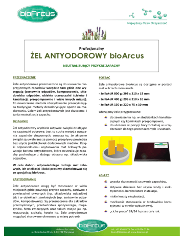 Najwyższy Czas Oczyszczać Profesjonalny ŻEL ANTYODOROWY bioArcus NEUTRALIZUJĄCY PRZYKRE ZAPACHY PRZEZNACZENIE POSTAĆ Żele antyodorowe przeznaczone są do usuwania nieprzyjemnych zapachów wszędzie tam gdzie one występują (sortownie odpadów, kompostownie, składowiska odpadów, obiekty oczyszczalni ścieków i kanalizacji, przepompownie i wiele innych miejsc). To nowoczesna metoda zdecydowanie przewyższająca tradycyjne metody dezodoryzujące oparte na maskowaniu. Celem żeli antyodorowych jest skuteczna i tania neutralizacja zapachu. Żele antyodorowe bioArcus są dostępne w postaci mat w trzech rozmiarach. - żel bA-JR 800 g: 295 x 210 x 15 mm - żel bA-JR 400 g: 295 x 210 x 10 mm - żel bA-JR 130 g: 220 x 75 x 10 mm Oferujemy żele przygotowane: do zawieszenia np. w studzienkach kanalizacyjnych czy kominkach przepompowni, do ułożenia w pozycji horyzontalnej w urządzeniach do tego przeznaczonych i rusztach. DZIAŁANIE Żel antyodorowy wydziela aktywne związki działające na cząsteczki odorowe. Jest to sucha metoda usuwania zapachów złowonnych, oznacza to, że aktywne związki są uwalniane za pomocą przepływu powietrza bez użycia jakichkolwiek dodatkowych mediów. Dzięki odpowiedniemu usytuowaniu mat żelowych powstaje bariera antyodorowa, która neutralizuje zapachy pochodzące z dużego obszaru np. składowiska odpadów. W celu doboru odpowiedniego rodzaju mat żelowych, ich wielkości i ilości prosimy skontaktować się ze specjalistą bioArcus. ZASTOSOWANIE Żele antyodorowe mogą być stosowane w wielu miejscach gdzie powstają przykre zapachy, zarówno z powierzchni otwartych (np. składowiska odpadów) jak i w obiektach zamkniętych (np. sortownie odpadów, kompostownie). Są przeznaczone dla zakładów przemysłowych, przetwórstwa spożywczego, magazynów, ferm zwierzęcych oraz takich miejsc jak np. restauracje, szpitale, hotele itp. Żele antyodorowe mogą być stosowane okresowo w miarę potrzeb. bioArcus Sp. zSp. o.o.z o.o. bioArcus ul. Białostocka 22 lok. 9, 03-741 Warszawa ul. Białostocka 22 lok. 9, 03-741 Warszawa ZALETY wysoka skuteczność usuwania zapachów, aktywne działanie bez użycia wody i elektryczności, bardzo łatwa instalacja, niskie koszty eksploatacji, możliwość stosowania w środowisku korozyjnym i w strefie wybuchowej, „cicha praca” 24/24 h przez cały rok. tel.: +48 654 0505 75,75, fax: +48 22654 65405 0576 76 tel.:22 +22 654 fax: +22 [email protected], www.bioarcus.pl [email protected], www.bioarcus.pl Najwyższy Czas Oczyszczać ŻELE w KANALIZACJI ŻELE ANTYODOROWE bioArcus to: Żele antyodorowe bioArcus do skutecznego usuwa- tanie i skuteczne rozwiązanie, nia odorów wydobywających się z kanalizacji komunalnych, przemysłowych, studzienek kanali- natychmiastowe działanie, zacyjnych redukują odory typowe dla systemów kanalizacyjnych. Żele kanalizacyjne występują w postaci mat w dwu rozmiarach. bardzo prosty montaż, - żel bA-JR 400 g: 295 x 210 x 10 mm długa aktywność żelu (2-4 miesiące), - żel bA-JR 130 g: 220 x 75 x 10 cmm możliwość zastąpienia innych kosztownych metod dezodoryzacji kanalizacji, Aktywne związki w żelu reagują z cząsteczkami odorowymi z kanalizacji w wyniku czego neutralizują nieprzyjemny zapach wydostający się na zewnątrz studzienki. Żel działa zarówno na odory „siarkowe” (H2S) jak i azotowe (NH3). Stężenie H2S nie ma praktycznego znaczenia dla efektywnego działania. rozwiązanie przyjazne, ekologicznie, bezpieczne dla ludzi i zwierząt. bezpośrednie działanie aktywnych związków antyodorowych na cząsteczki złowonne, OFERTA Ponieważ żele antyodorowe występują w kilku rodzajach i rozmiarach, prosimy o kontakt w celu określenia Państwa wymagań i wyboru optymalnego rozwiązania. ŚRODKI OSTROŻNOŚCI: W przypadku długotrwałego kontaktu ze skórą zmyć wodą z mydłem. W przypadku kontaktu z oczyma płukać dużą ilością wody, a przy nieustępującym podrażnieniu skontaktować się z lekarzem. Chronić przed dostępem dzieci. Szczegółowe informacje o produkcie znajdują się w Karcie Charakterystyki. bioArcus Sp. zSp. o.o.z o.o. bioArcus ul. Białostocka 22 lok. 9, 03-741 Warszawa ul. Białostocka 22 lok. 9, 03-741 Warszawa Przedstawione preparaty są jednymi z wielu proponowanych przez naszą firmę. Prosimy o kontakt. Służymy bezpłatnie naszą wiedzą i wieloletnim doświadczeniem w celu doboru najbardziej efektywnego, w danych warunkach preparatu i najlepszej metody jego aplikacji. Dodatkowych informacji udzielimy Państwu osobiście lub telefonicznie. Zapraszamy do współpracy. tel. 22 654 05 75 tel.: +48 654 0505 75,75, fax: +48 22654 65405 0576 76 tel.:22 +22 654 fax: +22 [email protected], www.bioarcus.pl [email protected], www.bioarcus.pl