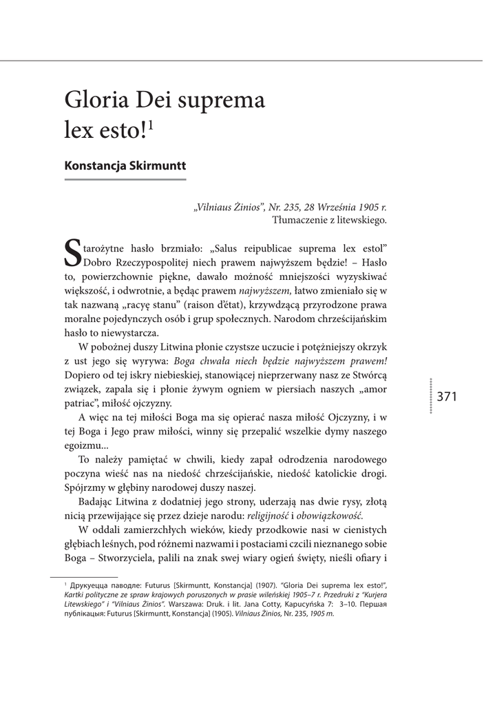 Gloria Dei suprema lex esto!1 Konstancja Skirmuntt „Vilniaus Żinios”, Nr. 235, 28 Września 1905 r. Tłumaczenie z litewskiego. S tarożytne hasło brzmiało: „Salus reipublicae suprema lex estol” Dobro Rzeczypospolitej niech prawem najwyższem będzie! – Hasło to, powierzchownie piękne, dawało możność mniejszości wyzyskiwać większość, i odwrotnie, a będąc prawem najwyższem, łatwo zmieniało się w tak nazwaną „racyę stanu” (raison d’état), krzywdzącą przyrodzone prawa moralne pojedynczych osób i grup społecznych. Narodom chrześcijańskim hasło to niewystarcza. W pobożnej duszy Litwina płonie czystsze uczucie i potężniejszy okrzyk z ust jego się wyrywa: Boga chwała niech będzie najwyższem prawem! Dopiero od tej iskry niebieskiej, stanowiącej nieprzerwany nasz ze Stwórcą związek, zapala się i płonie żywym ogniem w piersiach naszych „amor patriac”, miłość ojczyzny. A więc na tej miłości Boga ma się opierać nasza miłość Ojczyzny, i w tej Boga i Jego praw miłości, winny się przepalić wszelkie dymy naszego egoizmu... To należy pamiętać w chwili, kiedy zapał odrodzenia narodowego poczyna wieść nas na niedość chrześcijańskie, niedość katolickie drogi. Spójrzmy w głębiny narodowej duszy naszej. Badając Litwina z dodatniej jego strony, uderzają nas dwie rysy, złotą nicią przewijające się przez dzieje narodu: religijność i obowiązkowość. W oddali zamierzchłych wieków, kiedy przodkowie nasi w cienistych głębiach leśnych, pod różnemi nazwami i postaciami czcili nieznanego sobie Boga – Stworzyciela, palili na znak swej wiary ogień święty, nieśli ofiary i 1 Друкуецца паводле: Futurus [Skirmuntt, Konstancja] (1907). “Gloria Dei suprema lex esto!”, Kartki polityczne ze spraw krajowych poruszonych w prasie wileńskiej 1905–7 r. Przedruki z “Kurjera Litewskiego” i “Vilniaus Żinios”. Warszawa: Druk. i lit. Jana Cotty, Kapucyńska 7: 3–10. Першая публікацыя: Futurus [Skirmuntt, Konstancja] (1905). Vilniaus Żinios, Nr. 235, 1905 m. 371 КРАЁВАЯ ІДЭЯ, канец ХІХ – пачатак ХХ стагоддзя анталогія 372 we wszystkich, czynnościach swoich tak na wojnie jak w pokoju, wzywali wpływu, woli i uczestnictwa Bóstwa – wtedy już, w pogańskich czasach, zaznaczył się ten rys charakterystyczny narodu litewskiego – głęboka pobożność, która sprawiała że pierwszy Litwin, jeszcze z maczugą w dłoni i skórą zwierzęcą okryty, rzucał broń, padał na kolana, wznosił oczy w górę i marzył o tem Bóstwie do którego czuł się przynależnym, i czcił je jak umiał. Kiedy w końcu, po nadzwyczajnych trudnościach i przeszkodach, naród nasz dobił się do chrześcijaństwa, usłyszał prawdy Objawienia, uwierzył w Boga prawdziwego i począł chwalić Go w swych kościołach – wtedy pobożność litewska wylać się musiała w nowych objawach, stwierdzających przyrodzoną religijność naszego narodu. I tak było rzeczywiście. Wielcy nasi, Jagiełło i Witold, sami w języku rodzinnym uczą lud pierwszego „Ojcze Nasz”, a w dniu w którym u nóg swoich rozciągnąć ma odwiecznego wroga Litwy – Krzyżaków, Jagiełło, pierwej długo i we łzach słucha Mszy Św. – Książęcy patron Litwy, gardzi świętnością korony, klęczy nocami na śniegu przed zamkniętemi drzwiami kościołów wileńskich, pragnąc i dniem i nocą wielbić Boga swego. – Biskup, zbliża poniekąd do Litwy Ziemię Św. urządzając stacye Kalwaryi pod Wilnem, dla zaspokojenia pobożności swojej i swego ludu. Hetman, obnosi ze czcią w procesyi po ulicach Wilna chorągiew Św. Kazimierza. Żmujdzini w obronie murów kościoła przelewają krew swoją, albo nieraz za ostatni grosz kupują tak drogi jeszcze niedawno „Złoty Ołtarzyk”. Taką jest żywa wiara naszego narodu. Dziś, kiedy język nasz ojczysty odżył w piśmiennictwie i po długim mroku zabłysły nam pierwsze promienie wolności człowieka, niezerwijmy w niczem świętej nici tradycyi, nie przestańmy być sobą. Więc chwała Boga – to ma być nasz pierwszy cel, a od spełnienia obowiązku niech nie odwodzą nas najpiękniejsze wezwania i hasła, któreby się z uczuciem i pojęciem szczerze chrześcijańskiem pogodzić nie dały. Przedewszystkiem, niech nie wietrzeje „sól ziemi” – duchowieństwo nasze, gdyż ono powołane dawać nam wyższe pojęcia, niż pojęcia czysto świeckie, ono ma nam świecić przykładem jak łączyć miłość narodu z miłością Boga i bliźniego. Smutne tego „wietrzenia” rysy okazują się tu i owdzie. Słudzy ołtarza, zapomniawszy o swem powołaniu, sławę swego narodu stawią po nad chwałę i prawo Boże. Niektórzy księża nasi niecierpliwie i gwałtownie usiłują wygnać polszczyznę ze żmujdzkich i litewskich naszych kościołów i zastąpić ją litewszczyzną, nie bacząc na to, że gwałtowne w tem postępowanie niemoże się obejść bez krzywdy dusz i sumień ludzkich. Jeżeli tak gdziebądź postępują względem litewszczyzny „wszech polacy” i oddani im księża – obowiązkiem naszym jest oprzeć się im z całą energią na właściwych drogach, lecz niewolno podobnie źle postępować. Księża nasi, razem z największą miłością ojczyzny, mają nam dawać przykład – karności, niezachwianego w trudnych warunkach wytrwania w tych dwóch zasadniczych cnotach, które z pociechą serca możemy, dotąd nazywać narodowemi: w pobożności i obowiązkowości. Na to są kapłanami, i na to są Litwinami. Prace narodowe, księża mogą łączyć tylko z mądrością i cierpliwością dobrych pasterzy. Wreszcie te dwie podstawowe cnoty obowiązują nas wszystkich. Niewolno nam czynić sobie bożyszcza – ani z mowy naszej – ponieważ byłby to taki egoizm narodowy, jakiego szpetne oblicze widzimy w hakatyzmie – ani ze sławy i dobrobytu naszego narodu, bo łatwo tu wkroczyć