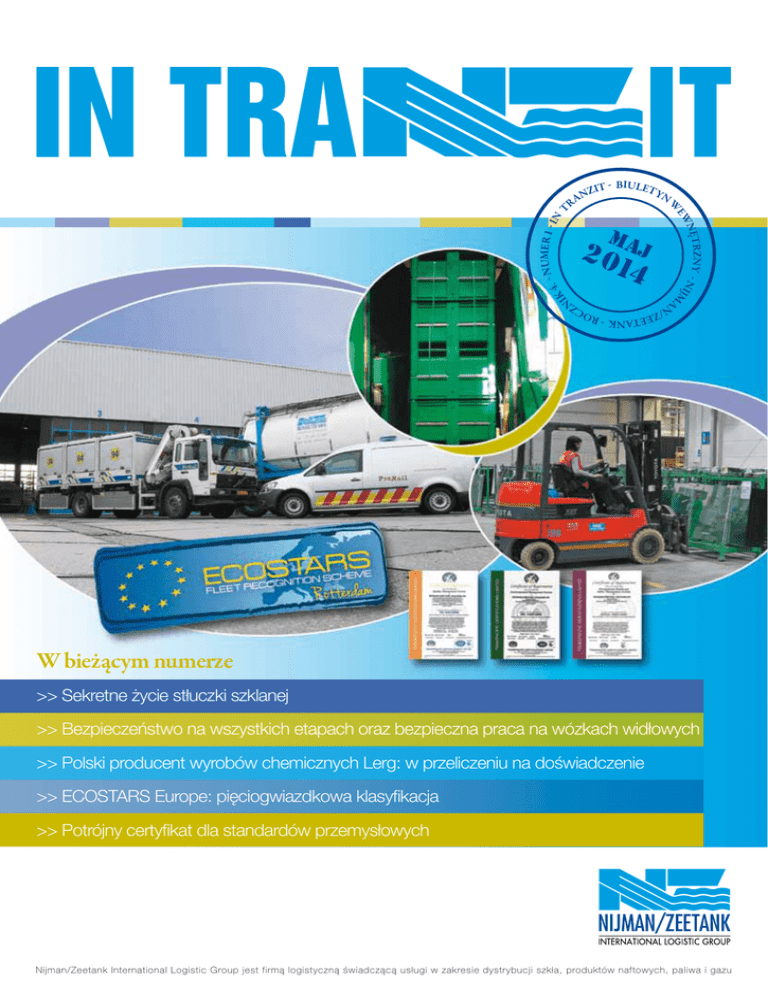 NUMER 1 - I N 4. T IK m 2 01aj 4 RZNY - N NĘT IJM EW W IT - BIULETY NZ N A R ETANK - ROC /ZE ZN AN W bieżącym numerze >> Sekretne życie stłuczki szklanej >> Bezpieczeństwo na wszystkich etapach oraz bezpieczna praca na wózkach widłowych >> Polski producent wyrobów chemicznych Lerg: w przeliczeniu na doświadczenie >> ECOSTARS Europe: pięciogwiazdkowa klasyfikacja >> Potrójny certyfikat dla standardów przemysłowych Nijman/Zeetank International Logistic Group jest firmą logistyczną świadczącą usługi w zakresie dystrybucji szkła, produktów naftowych, paliwa i gazu Słowo wstępne W transporcie i logistyce przywykliśmy do tego, że czasy bywają burzliwe. A już na pewno w ostatnich latach dało się to odczuć. Z jednej strony spadek wielkości dostaw, a z drugiej zmniejszenie kapitału obrotowego u klientów i odbiorców, przez co nastąpiła spora redukcja zasobów. Skutkiem tego było późniejsze składanie zamówień i wobec tego okres między złożeniem zamówienia a faktycznym jego zrealizowaniem stawał się krótszy. Bez transportu wszystko stoi: często zatem czekały nas wyzwania, aby sprostać rozmaitym oczekiwaniom. W ostatnich tygodniach systematycznie pojawiają się w mediach optymistyczne dane. Poniżej garść przykładów z licznych publikacji: Kees van Noordt - De Containerumschlag-Index z Rheinisch-Westfälischen Institut für Wirtschaftforschung Dyrektor Generalny (RWI) oraz Institut für Seeverkehrswirtschaft und Logistik (ISL) pokazały w styczniu dużą poprawę w postaci wyniku do 120,7 punktów. W grudniu 2013 r. indeks ten wskazywał jeszcze 117,5 punktu. Według naukowców ta, od dłuższego czasu najwyższa wartość, wskazuje na stabilny wzrost handlu światowego. - Według danych niemieckiego Bundesamt für Güterverkehr (BAG), w styczniu tego roku wzrosła liczba kilometrów pokonanych przez ciężarówki, za które obowiązuje opłata. Liczba przejazdów w Niemczech była wtedy o 3,1% wyższa. We wszystkich przejechanych kilometrach udział ciężarówek z silnikami typu Euro-3 stanowił 6%, Euro-4 – 6%, Euro-5 i z silnikiem EEV – 82%, i tymczasem aż 6% z silnikiem Euro-6. - Wzrost gospodarki niemieckiej wyniósł w 2013 r. 0,4%. Na rok 2014 spodziewany jest Spis treści 3 ekretne życie S stłuczki szklanej Nijman/Zeetank chce uczynić świat szkła zieleńszym, czystszym i jaśniejszym. wzrost o 1,8%, a w 2015 roku o 2%. - Według Centralnego Biura Statystyki - Centraal Bureau voor de Statistiek (CBS), w gospodarce Holandii w czwartym kwartale ubiegłego roku nastąpił wzrost wynoszący 0,7% 6 Bezpieczeństwo na wszystkich etapach w stosunku do kwartału trzeciego tego samego roku. Był to po raz pierwszy od dwóch lat wzrost zanotowany w skali rocznej. - Prognoza dla gospodarki Holandii w 2014 r. przewiduje jej wzrost o 0,7%. ProRail korzysta z doświadczenia Nijman/Zeetank dla celów szkoleniowych. - Poland Manufacturing Index (PMI) wzrósł z 55,4 w styczniu 2014 r. do 55,9 w lutym tego roku. Jest to najwyższy poziom od grudnia 2010 r. - Produkt narodowy brutto w Polsce wzrósł według Głównego Urzędu Statystycznego 7 (GUS) w czwartym kwartale 2013 r. o 2,7% w stosunku do trzeciego kwartału tego samego roku. W odniesieniu do całego 2013 roku wzrost wyniósł 1,6%. - British Chambers of Commerce (BCC), niezależny instytut Wielkiej Brytanii spodziewa Bezpieczna praca na wózkach widłowych Nijman/Zeetank Polska uważa, że operatorzy wózków muszą poświęcać dużo uwagi bezpieczeństwu. się, że wzrost gospodarczy Wielkiej Brytanii wyniesie w 2014 r. 2,8%. - BCC oczekuje, że bezrobocie w Wielkiej Brytanii spadnie z 7,2% – poziom w czwartym kwartale 2013 r. – do 6% w czwartym kwartale 2016 r. 8 Taka poprawa sytuacji jest pilnie potrzebna. Od 2009 r. wielu zleceniodawców osiąga dużo Producent wyrobów chemicznych Lerg: w przeliczeniu na doświadczenie niższe zyski finansowe. Od 2009 r. wyniki licznych przedsiębiorstw logistycznych również Długotrwałe relacje też mają znaczenie Członka znacznie pozostają w tyle. Presja cen, ich spadek, brak możliwości wkalkulowania wzrostu Zarządu firmy Lerg Andrzeja Korony. kosztów oraz spadek wielkości dostaw, z powodu którego pogorszyła się wydajność – to najważniejsze przyczyny słabych wyników finansowych. Jest to sytuacja szczególnie niezdrowa dla sektora tak kapitałochłonnego, jakim jest logistyka. 10 ECOSTARS Europe Jeden z pierwszych przewoźników ze znakiem Z niecierpliwością wypatrujemy zapowiedzianej poprawy. Z ufnością jej oczekujemy i klasyfikacji gwiazdkowej. mamy nadzieję, że zarówno Państwo, jako klient, jak i my, jako firma świadcząca usługi w logistyce, będziemy już wkrótce mogli zbierać jej owoce. << 2 | 11 Potrójny certyfikat dla standardów przemysłowych Ostatni audyt w St. Helens zakończony sukcesem. Sekretne życie stłuczki szklanej Wiadomym jest, że Nijman/Zeetank transportuje produkty znajdujące się niejako na przeciwnych końcach wachlarza przewozów: z jednej strony ciekłe chemikalia w tank-kontenerach, z drugiej zaś szkło w specjalnych naczepach typu innenlader. A jednak te produkty mają ze sobą więcej wspólnego aniżeli mogłoby się wydawać na pierwszy rzut oka. Szkło składa się w końcu z chemicznych komponentów, które - poprzez niewielkie ich zróżnicowanie w ytwarzają odmienne właściwości, takie jak kolor, wytrzymałość i możliwości izolacyjne. Szkło traktuje się poza tym jako ”mocno schłodzoną substancję płynną”, gdyż, choć jest ono łamliwe, to jest też twardsze niż większość znanych nam substancji. WWW.NIJMAN-ZEETANK.COM Najważniejszy składnik szkła to krze- również temperatura pieca przy wytapia- wycinaniu dużej ilości szyb okiennych mionka, lub inaczej piasek, który, choć niu mieszanki szklanej może być niższa. z wielkich tafli szklanych o powierzchni 6 na 3 m. trudno w to uwierzyć, jest materiałem nieodnawialnym. I nawet jeśli może