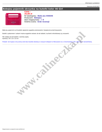 Informacje o produkcie Utworzono 04-03-2017 BebeJou pojemnik skrzynka na butelki kolor 46 Girl Cena : 25,00 zł Nr katalogowy : Bebe Jou 656646 Producent : BebeJou Stan magazynowy : < 0 Średnia ocena : brak recenzji Bebe Jou pojemnik na 6 butelek zapewnia wygodne przenoszenie i bezpieczne przechowywanie. pl Butelki z pokarmem i sokami można wygodnie wstawic do do lodówki, kuchenki mikrofalowej czy zmywarki. Nie nadaje się do butelek z szeroką szyjką wymiary: 19 x 13 x 13 cm w w w .c al in ec zk a. Produkt ten kupisz w tej samej cenie bez kosztów dostawy w naszych sklepach w Warszawie na ul. Grochowskiej 178 i 180 róg ul. Garwolińskiej. Wygenerowano w programie www.oscGold.com