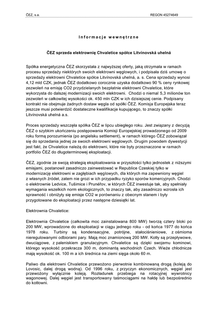 ČEZ, s.a. REGON 45274649 Informacje wewnętrzne ČEZ sprzeda elektrownię Chvaletice spółce Litvínovská uhelná Spółka energetyczna ČEZ skorzystała z najwyższej oferty, jaką otrzymała w ramach procesu sprzedaży niektórych swoich elektrowni węglowych, i podpisała dziś umowę o sprzedaży elektrowni Chvaletice spółce Litvínovská uhelná, a. s. Cena sprzedaży wynosi 4,12 mld CZK, jednak ČEZ dodatkowo corocznie uzyska dodatkowo 90 % ceny rynkowej zezwoleń na emisję CO2 przydzielanych bezpłatnie elektrowni Chvaletice, które wykorzysta do dalszej modernizacji swoich elektrowni. Chodzi o niemal 5,3 milionów ton zezwoleń w całkowitej wysokości ok. 450 mln CZK w ich dzisiejszej cenie. Podpisany kontrakt nie obejmuje żadnych dostaw węgla od spółki ČEZ. Komisja Europejska teraz jeszcze musi potwierdzić dostateczne kwalifikacje kupującego, to znaczy spółki Litvínovská uhelná a.s. Proces sprzedaży wszczęła spółka ČEZ w lipcu ubiegłego roku. Jest związany z decyzją ČEZ o szybkim ukończeniu postępowania Komisji Europejskiej prowadzonego od 2009 roku formą porozumienia (po angielsku settlement), w ramach którego ČEZ zobowiązał się do sprzedania jednej ze swoich elektrowni węglowych. Drugim powodem dywestycji jest fakt, że Chvaletice należą do elektrowni, które nie były przeznaczone w ra mach portfolio ČEZ do długoterminowej eksploatacji. ČEZ, zgodnie ze swoją strategią eksploatowania w przyszłości tylko jednostek z niższymi emisjami, postanowił zasadniczo zainwestować w Republice Czeskiej tylko w modernizację elektrowni w zagłębiach węglowych, dla których ma zapewniony węgiel z własnych źródeł, zatem nie grozi w ich przypadku ryzyko sporów komercyjnych. Chodzi o elektrownie Ledvice, Tušimice i Prunéřov, w których ČEZ inwestuje tak, aby spełniały wymagania wszelkich norm ekologicznych, to znaczy tak, aby zasadniczo wzrosła ich sprawność i obniżyły się emisje CO2 w porównaniu z obecnym stanem i były przygotowane do eksploatacji przez następne dziesiątki lat. Elektrownia Chvaletice: Elektrownia Chvaletice (całkowita moc zainstalowana 800 MW) tworzą cztery bloki po 200 MW, wprowadzone do eksploatacji w ciągu jednego roku - od końca 1977 do końca 1978 roku. Turbiny są kondensacyjne, potrójne, stałociśnieniowe, z ośmioma nieregulowanymi odbiorami pary. Mają moc znamionową 200 MW. Kotły są przepływowe, dwuciągowe, z paleniskiem granulacyjnym. Chvaletice są dzięki swojemu kominowi, którego wysokość przekracza 300 m, dominantą wschodnich Czech. Wieże chłodnicze mają wysokość ok. 100 m a ich średnica na ziemi sięga około 60 m. Paliwo dla elektrowni Chvaletice przewożono pierwotnie kombinowaną drogą (koleją do Lovosic, dalej drogą wodną). Od 1996 roku, z przyczyn ekonomicznych, węgiel jest przewożony wyłącznie koleją. Rozładunek przebiega na rotacyjnej wywrotnicy wagonowej. Dalej węgiel jest transportowany taśmociągami na hałdę lub bezpośrednio do kotłowni.