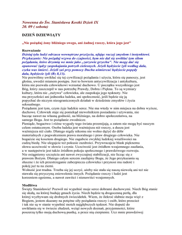 Nowenna do Św. Stanisława Kostki Dzień IX 20. 09 ( sobota) DZIEŃ DZIEWIĄTY „Nie pożądaj żony bliźniego swego, ani żadnej rzeczy, która jego jest" Rozważanie Dzisiaj tylu ludzi odrzuca wewnętrzne przeżycia, ufając raczej zmysłom i instynktowi. Przykazanie: Nie pożądaj wzywa do czujności, bym nie dal się uwikłać tym siłom pożądania, które drzemią we mnie jako „zarzewie grzechu". Nie mogę dać się opanować żądzy zaspokajania potrzeb cielesnych. Jeżeli będziecie żyli według dala, czeka was śmierć. Jeżeli zaś przy pomocy Ducha uśmiercać będziecie popędy dala, będziecie żyli (Rz 8,13). Nie pozwólmy uwikłać się tej cywilizacji pożądania i użycia, która się panoszy, jest głośna, uwodzi mianem postępu. Jest to bowiem antycywilizacja i antykultura, która nie pozwala człowiekowi wzrastać duchowo. U początku wszystkiego jest Bóg, który zaszczepił w nas potrzebę Prawdy, Dobra i Piękna. To są wymiary kultury, która nie „zużywa" człowieka, ale zaspokaja jego tęsknoty. Nie ma przyszłości ani jednostka ludzka, ani społeczność, jeśli będzie się ją popychać do niczym nieograniczonych działań w dziedzinie zmysłów i życia seksualnego. Pożądanie jest tym, czym żyje ludzkie serce. Nie ma wtedy w nim miejsca na dobra wyższe, duchowe. Człowiek staje się poniekąd niewolnikiem posiadania i używania, nie bacząc nawet na własną godność, na bliźniego, na dobro społeczeństwa, na samego Boga. Jest to pożądanie zwodnicze. Pieniądz, bogactwo i różne wygody tego świata przemijają, a zatem nie mogą być naszym celem ostatecznym. Osoba ludzka jest ważniejsza niż rzeczy, a dusza jest ważniejsza niż ciało. Dlatego nigdy nikomu nie wolno dążyć do dóbr materialnych z pogwałceniem prawa moralnego i praw drugiego człowieka. Nie bogaćcie się kosztem drugiego. Nie zagubcie zwykłej ludzkiej wrażliwości na cudzą biedę. Nie ulegajcie też pokusie zazdrości. Przywracajcie blask pięknemu słowu uczciwość w słowie i czynie. Uczciwość jest źródłem wzajemnego zaufania, a w następstwie jest także źródłem pokoju społecznego i prawdziwego rozwoju. Nie osiągniemy szczęścia ani nawet zwyczajnej stabilizacji, nie licząc się z prawem Bożym. Dlatego całym sercem zaufajmy Bogu, że Jego przykazania są słuszne i że ich przestrzeganie zabezpiecza człowieka i przynosi mu radość i pokój już tu na ziemi. Wolność jest trudna. Trzeba się jej uczyć, ażeby nie stała się naszą niewolą ani też nie stawała się przyczyną zniewolenia innych. Pożądanie rzeczy i ludzi jest korzeniem egoizmu, a nawet zawiści i nienawiści wzajemnych. Modlitwa Święty Stanisławie! Pozwól mi wypełnić moje serce dobrami duchowymi. Niech Bóg stanie się skałą, na której buduję gmach życia. Niech będzie tą drogocenną perłą, dla której wyzbywam się drobnych świecidełek. Wiem, że ilekroć słabnie moja więź z Bogiem, jestem skazany na potężne siły pożądania rzeczy i osób, które przecież i tak nie są w stanie wypełnić moich najgłębszych tęsknot. Nie dopuść do uwikłania się w świecie złudzeń, wciąż nowych doznań, przyjemności, które poszerzą tylko moją duchową pustkę, a przez nią cierpienie. Ucz mnie prawdziwej wolności. Przez Chrystusa Pana naszego. Amen. Rachunek sumienia Jest naturalne, że rodzą się w nas pożądania. Wywołują one napięcia pomiędzy tym, co powinienem uczynić, a tym, do czego popychają emocje, namiętności, zmysły. Czy poddaję moje namiętności kontroli rozumu, czy też łatwo ulegam im? Jak często ostateczne zwycięstwo należy do norm moralnych i troski o zachowanie własnej godności? Co jest moim najpoważniejszym zniewoleniem? Do czego najczęściej lgnie moje serce i jakim sprawom poświęcam swój czas i zainteresowania? Czy stoją one na drodze do mojego duchowego wzrostu? Czy motto św. Stanisława Kostki Do wyższych rzeczy jestem stworzony, może być mottem również i mojego życia? Czy jestem przekonany o prawdzie, że tylko Chrystus może uczynić mnie wolnym? Przesłania Uważajcie i strzeżcie się wszelkiej chciwości, bo nawet gdy ktoś opływa we wszystko, życie jego nie jest zależne od jego mienia (Łk 12,15). Każdy, kto pożądliwie patrzy na kobietę, już się w swoim sercu dopuścił cudzołóstwa (Mt 5,27). Niespokojne jest serce człowieka, dopóki nie spocznie w Bogu (św. Augustyn). Ojcze nasz..., Zdrowaś Maryjo..., Chwała Ojcu....