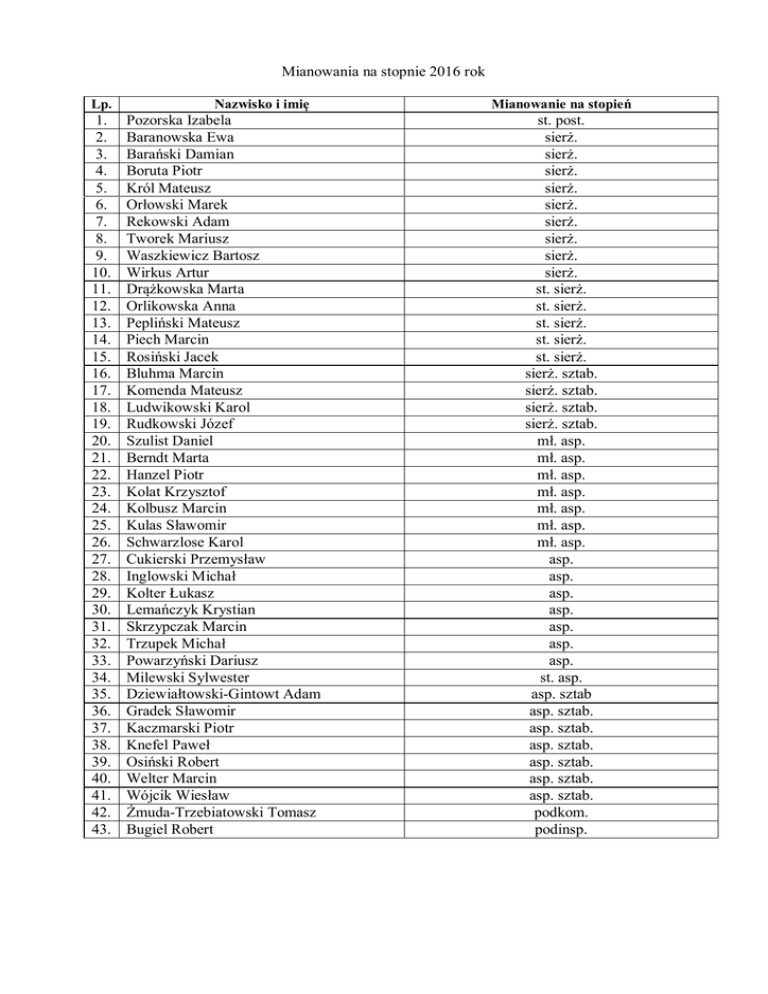 Mianowania na stopnie 2016 rok Lp. 1. 2. 3. 4. 5. 6. 7. 8. 9. 10. 11. 12. 13. 14. 15. 16. 17. 18. 19. 20. 21. 22. 23. 24. 25. 26. 27. 28. 29. 30. 31. 32. 33. 34. 35. 36. 37. 38. 39. 40. 41. 42. 43. Nazwisko i imię Pozorska Izabela Baranowska Ewa Barański Damian Boruta Piotr Król Mateusz Orłowski Marek Rekowski Adam Tworek Mariusz Waszkiewicz Bartosz Wirkus Artur Drążkowska Marta Orlikowska Anna Pepliński Mateusz Piech Marcin Rosiński Jacek Bluhma Marcin Komenda Mateusz Ludwikowski Karol Rudkowski Józef Szulist Daniel Berndt Marta Hanzel Piotr Kolat Krzysztof Kolbusz Marcin Kulas Sławomir Schwarzlose Karol Cukierski Przemysław Inglowski Michał Kolter Łukasz Lemańczyk Krystian Skrzypczak Marcin Trzupek Michał Powarzyński Dariusz Milewski Sylwester Dziewiałtowski-Gintowt Adam Gradek Sławomir Kaczmarski Piotr Knefel Paweł Osiński Robert Welter Marcin Wójcik Wiesław Żmuda-Trzebiatowski Tomasz Bugiel Robert Mianowanie na stopień st. post. sierż. sierż. sierż. sierż. sierż. sierż. sierż. sierż. sierż. st. sierż. st. sierż. st. sierż. st. sierż. st. sierż. sierż. sztab. sierż. sztab. sierż. sztab. sierż. sztab. mł. asp. mł. asp. mł. asp. mł. asp. mł. asp. mł. asp. mł. asp. asp. asp. asp. asp. asp. asp. asp. st. asp. asp. sztab asp. sztab. asp. sztab. asp. sztab. asp. sztab. asp. sztab. asp. sztab. podkom. podinsp.