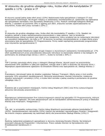 Warszawa, baza firm, oferty pracy, branża IT :: WarszawaIT.pl W stosunku do grudnia ubiegłego roku, liczba ofert dla kandydatów IT spadła o 11% - praca w IT W styczniu ponad jedna piata ofert pracy (23%) dedykowana była specjalistom z kategorii IT oraz Nowoczesne Technologie. Na drugim miejscu w zestawieniu monsterpolska.pl, uplasowały się ogłoszenia dla specjalistów Sprzedaży oraz Sprzedaży Detalicznej (17%). Podium zamknęła kategoria Obsługa Klienta, z udziałem na poziomie 16% w ogólnej puli ofert. Znacznie wzrosło zapotrzebowanie na Inżynierów, liczba ofert pracy wzrosła o 25%. W stosunku do grudnia ubiegłego roku, liczba ofert dla kandydatów IT spadła o 11%. Spadek nie świadczy jednak o braku zainteresowania pracownikami z tego sektora. Jest to tendencja krótkookresowa, której wynikiem jest długi okres świąteczny, który przełożył się na rozpoczęcie rekrutacji we wszystkich kategoriach, nie tylko w IT. W styczniu na portalu monsterpolska.pl, co piąta oferta pracy skierowana była do specjalistów IT/ Programowania. Firmy nadal najchętniej poszukiwały programistów oraz inżynierów oprogramowania. Sprzedaż/ Sprzedaż Detaliczna zajęła drugie miejsce w styczniowym zestawieniu monsterpolska.pl. 17% ofert opublikowanych przez pracodawców dotyczyło rekrutacji na stanowiska właśnie w tej kategorii. W porównaniu do analogicznego okresu z 2014 r., liczba ta wzrosła o 30%. TOP 3 portalu zamykają oferty pracy z kategorii Obsługa Klienta. Wysoki popyt na pracowników zaowocował 16% udziałem w całej puli ogłoszeń, notując skok o 29% w stosunku do stycznia 2014 r. Największe zapotrzebowanie zgłaszano na Doradców Klienta oraz Specjalistów ds. Obsługi Klienta. Pracodawcy rekrutowali także do działów Logistyka/ Zakupy/ Transport. Oferty pracy o tym profilu stanowiły 10% wszystkich opublikowanych. Aktywnie poszukiwano również Inżynierów, zwłaszcza dziedzin automatyki i produkcji (12%), a liczba ofert wzrosła o jedną czwartą w porównaniu do grudnia ubiegłego roku. Podobnie jak w poprzednich miesiącach, Centra Usług Wspólnych (SSC) oraz firmy outsourcingowe aktywnie rekrutowały pracowników. Największym zainteresowaniem firm outsourcingowych cieszyli się specjaliści IT/ Programowania, których dotyczyło 67% ogłoszeń. 5% było adresowanych zaś do kandydatów zainteresowanych pracą w Obsłudze Klienta oraz Finansach / Księgowości. Tak, jak i w przypadku outsourcingu, Centra Usług Wspólnych poszukiwały głównie kandydatów IT (42%). Zainteresowaniem rekruterów (25%) cieszyli się kandydaci reprezentujący Finanse / Księgowość. Na trzecim miejscu uplasowały się natomiast oferty dla pracowników Obsługi Klienta (12%). Ranking najbardziej pożądanych specjalizacji w styczniu otwierają Doradcy Klienta. Na kolejnych pozycjach plasują się Programiści i Inżynierowie. Praca czekała również na Sprzedawców oraz Przedstawicieli handlowych. http://www.warszawait.pl Kreator PDF Utworzono 4 March, 2017, 08:19 Warszawa, baza firm, oferty pracy, branża IT :: WarszawaIT.pl http://www.warszawait.pl Kreator PDF Utworzono 4 March, 2017, 08:19