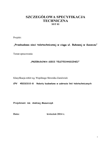 SZCZEGÓŁOWA SPECYFIKACJA TECHNICZNA SST 01 Projekt: „Przebudowa sieci teletechnicznej w ciągu ul. Bukowej w Suszczu” Temat opracowania: „PRZEBUDOWA SIECI TELETECHNICZNEJ” Klasyfikacja robót wg. Wspólnego Słownika Zamówień: CPV 45232310-8 Roboty budowlane w zakresie linii teletechnicznych Projektant: inż. Andrzej Mazurczyk Data: kwiecień 2014 r. 1 SPIS TREŚCI 1 WSTĘP...............................................................................................................3 1.1 PRZEDMIOT SST..............................................................................................................................................3 1.2 ZAKRES STOSOWANIA SST..............................................................................................................................3 1.3 ZAKRES ROBÓT OBJĘTYCH SST.......................................................................................................................3 1.4 OKREŚLENIA PODSTAWOWE.............................................................................................................................3 2 MATERIAŁY....................................................................................................5 2.1 MATERIAŁY BUDOWLANE................................................................................................................................5 2.2 MATERIAŁY GOTOWE.......................................................................................................................................5 2.2.1 Rury polietylenowe...................................................................................................................................5 2.2.2 Kable........................................................................................................................................................6 2.2.3 Złącza.......................................................................................................................................................6 2.3 ELEMENTY PREFABRYKOWANE.......................................................................................................................6 2.4 ODBIÓR MATERIAŁÓW NA BUDOWIE................................................................................................................6 3 SPRZĘT..............................................................................................................6 3.1 OGÓLNE WYMAGANIA.....................................................................................................................................6 3.2 SPRZĘT DO BUDOWY KABLOWYCH LINII TELEKOMUNIKACYJNYCH................................................................7 4 TRANSPORT.....................................................................................................7 4.1 TRANSPORT MATERIAŁÓW I ELEMENTÓW........................................................................................................7 5 WYKONANIE ROBÓT.....................................................................................8 5.1 SZCZEGÓŁOWE ZASADY WYKONANIA ROBÓT..................................................................................................8 5.2 TRASOWANIE...................................................................................................................................................8 5.3 USYTUOWANIE KANALIZACJI...........................................................................................................................8 5.4 LINIE ŚWIATŁOWODOWE..................................................................................................................................9 5.5 MONTAŻ KABLI MIEDZIANYCH......................................................................................................................10 5.6 DEMONTAŻ LINII............................................................................................................................................10 6 KONTROLA JAKOŚCI ROBÓT....................................................................11 6.1 OGÓLNE ZASADY KONTROLI JAKOŚCI ROBÓT................................................................................................11 7 OBMIAR ROBÓT...........................................................................................11 8 ODBIÓR ROBÓT............................................................................................11 9 PODSTAWA PŁATNOŚCI.............................................................................11 10 PRZEPISY ZWIĄZANE...............................................................................12 2 1 1.1 WSTĘP Przedmiot SST Przedmiotem niniejszej szczegółowej specyfikacji technicznej są wymagania dotyczące wykonania i odbioru robót teletechnicznych przebudowy i zabezpieczeniasieci teletechnicznej kolidującej z projektowaną modernizacja ul. Bukowej w Suszczu. 1.2 Zakres stosowania SST Szczegółowa specyfikacja techniczna jest stosowana jako dokument przetargowy i kontraktowy przy zlecaniu i realizacji robót. 1.3 Zakres robót objętych SST Kanalizacja teletechniczna 2-otw Studnie teletechniczne Linie światłowodowe Kable teletechniczne 50m 4 szt. 0,25km 0,06km/ 3,6kmp Szczegółowy zakres robót i materiałów podano w projekcie wykonawczym p. 3 1.4 Określenia podstawowe Studnia kablowa - pomieszczenia podziemne wbudowane między ciągi kanalizacji kablowej w celu umożliwienia wciągania, montażu i konserwacji kabli. Kablowa sieć miejscowa - sieć łączy telefonicznych z urządzeniami liniowymi, łącząca centrale telefoniczne między sobą oraz centrale telefoniczne ze stacjami abonenckimi. Sieć międzycentralowa - część linii miejscowej obejmująca linie łączące centrale telefoniczne w jednym mieście. Łącze - zestaw przewodów i urządzeń między centralami, centralą a aparatem abonenckim. Tor abonencki - para żył kablowych lub napowietrznych między cent