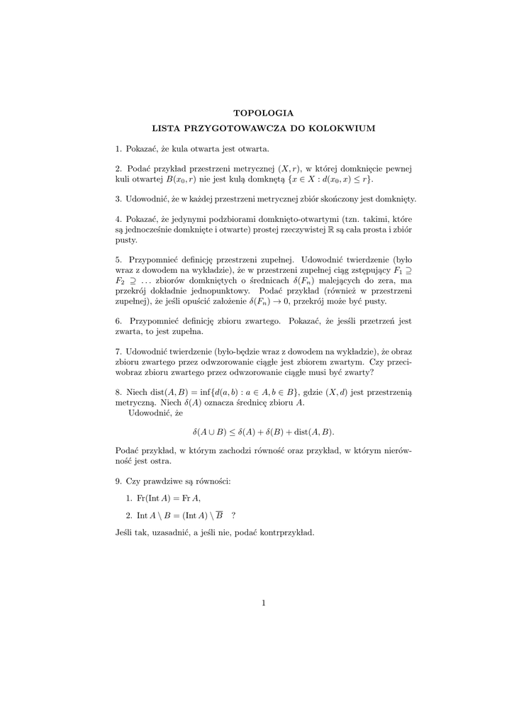 TOPOLOGIA LISTA PRZYGOTOWAWCZA DO KOLOKWIUM 1