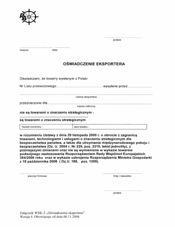 mreJsce data oŚwlł DczENIE EKs Po RTERA oŚwiadCzam,ze towarlywysłanyle z Po|ski Nr Listu nazwa eksportera przeznaczonedla.. ;r;; .J;il;;y nie są towaramio znaczeniustrategicznym. są towaramio znaczeniustrategicznym N u me rkont r o l n-y opis towaru- W rozumieniuUstawy z dnia 29 listopada 2000 r. o obrocie zzagranicą towarami,technologiami i usługamio znaczeniu strategicznym d!a bezpieczenstwa panstwo, o takżedla utrzymania międzynarodowego pokoju i bezpieczenstwa (Dz. U. 2004 r. Nr 229, poz. 2315,tekst jednolityl, z poŹniejszymi zmianami oraz nle są wymienione w wykazle towarow podwojnego zastosowa n ia Rozp orządzeniem Rady Ws po !n ot E u ropejs kic h 39412006roku oraz w wykazie uzbrojenia Rozporządzenie Ministra Gospodarki 2006 ( Dz.U. 188, poz. 1309). z 18 października pieczęcfirmowa W SK. 2,' o świ adczenteeksportera'' Zał,ączntk Wersja4. obowiązujeod dnia 06.11.2006 imie i naz w isko