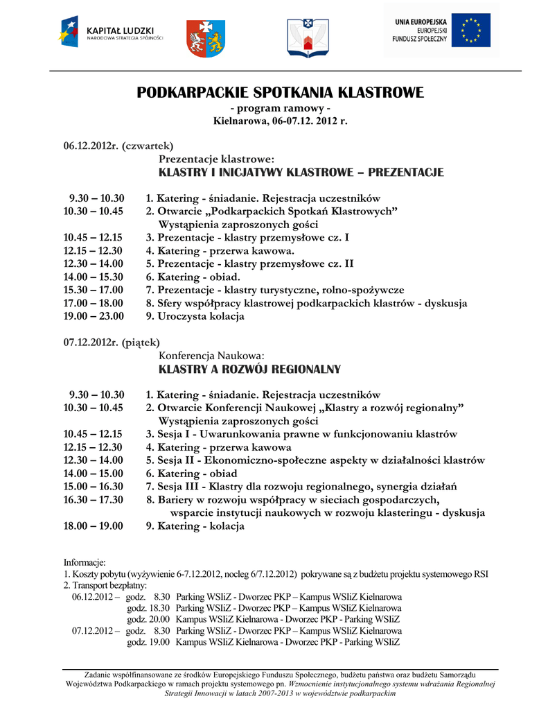PODKARPACKIE SPOTKANIA KLASTROWE - program ramowy Kielnarowa, 06-07.12. 2012 r. 06.12.2012r. (czwartek) Prezentacje klastrowe: KLASTRY I INICJATYWY KLASTROWE – PREZENTACJE 9.30 – 10.30 10.30 – 10.45 10.45 – 12.15 12.15 – 12.30 12.30 – 14.00 14.00 – 15.30 15.30 – 17.00 17.00 – 18.00 19.00 – 23.00 1. Katering - śniadanie. Rejestracja uczestników 2. Otwarcie „Podkarpackich Spotkań Klastrowych” Wystąpienia zaproszonych gości 3. Prezentacje - klastry przemysłowe cz. I 4. Katering - przerwa kawowa. 5. Prezentacje - klastry przemysłowe cz. II 6. Katering - obiad. 7. Prezentacje - klastry turystyczne, rolno-spożywcze 8. Sfery współpracy klastrowej podkarpackich klastrów - dyskusja 9. Uroczysta kolacja 07.12.2012r. (piątek) Konferencja Naukowa: KLASTRY A ROZWÓJ REGIONALNY 9.30 – 10.30 10.30 – 10.45 10.45 – 12.15 12.15 – 12.30 12.30 – 14.00 14.00 – 15.00 15.00 – 16.30 16.30 – 17.30 18.00 – 19.00 1. Katering - śniadanie. Rejestracja uczestników 2. Otwarcie Konferencji Naukowej „Klastry a rozwój regionalny” Wystąpienia zaproszonych gości 3. Sesja I - Uwarunkowania prawne w funkcjonowaniu klastrów 4. Katering - przerwa kawowa 5. Sesja II - Ekonomiczno-społeczne aspekty w działalności klastrów 6. Katering - obiad 7. Sesja III - Klastry dla rozwoju regionalnego, synergia działań 8. Bariery w rozwoju współpracy w sieciach gospodarczych, wsparcie instytucji naukowych w rozwoju klasteringu - dyskusja 9. Katering - kolacja Informacje: 1. Koszty pobytu (wyżywienie 6-7.12.2012, nocleg 6/7.12.2012) pokrywane są z budżetu projektu systemowego RSI 2. Transport bezpłatny: 06.12.2012 – godz. 8.30 Parking WSIiZ - Dworzec PKP – Kampus WSIiZ Kielnarowa godz. 18.30 Parking WSIiZ - Dworzec PKP – Kampus WSIiZ Kielnarowa godz. 20.00 Kampus WSIiZ Kielnarowa - Dworzec PKP - Parking WSIiZ 07.12.2012 – godz. 8.30 Parking WSIiZ - Dworzec PKP – Kampus WSIiZ Kielnarowa godz. 19.00 Kampus WSIiZ Kielnarowa - Dworzec PKP - Parking WSIiZ Zadanie współfinansowane ze środków Europejskiego Funduszu Społecznego, budżetu państwa oraz budżetu Samorządu Województwa Podkarpackiego w ramach projektu systemowego pn. Wzmocnienie instytucjonalnego systemu wdrażania Regionalnej Strategii Innowacji w latach 2007-2013 w województwie podkarpackim