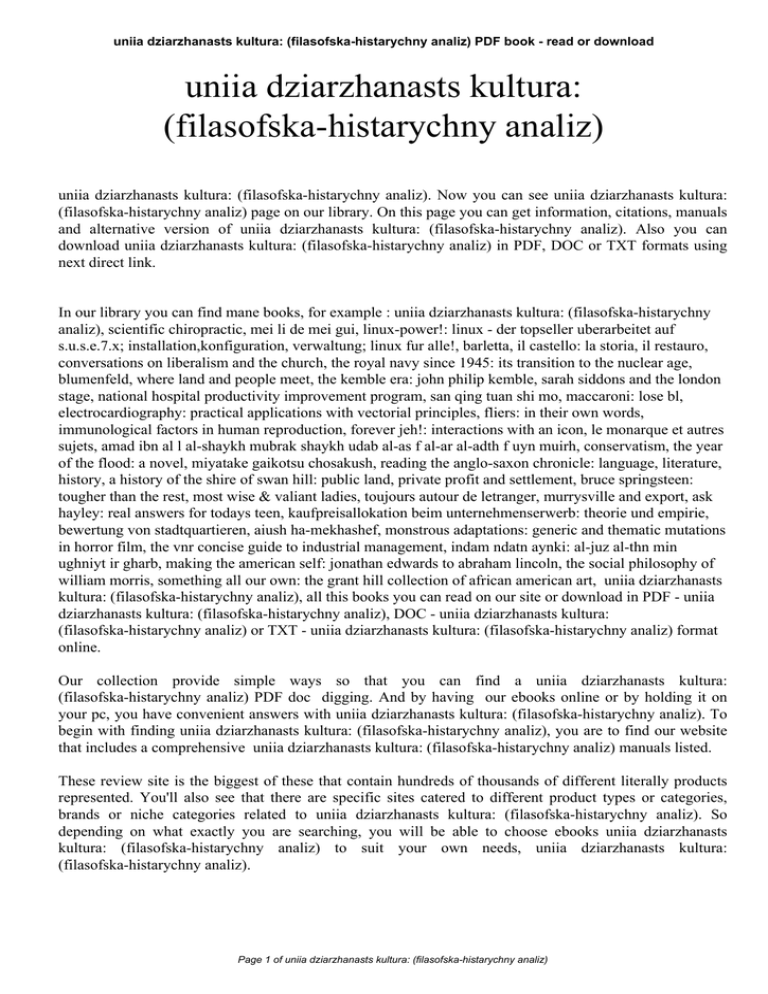 uniia dziarzhanasts kultura: (filasofska-histarychny analiz) PDF book - read or download uniia dziarzhanasts kultura: (filasofska-histarychny analiz) uniia dziarzhanasts kultura: (filasofska-histarychny analiz). Now you can see uniia dziarzhanasts kultura: (filasofska-histarychny analiz) page on our library. On this page you can get information, citations, manuals and alternative version of uniia dziarzhanasts kultura: (filasofska-histarychny analiz). Also you can download uniia dziarzhanasts kultura: (filasofska-histarychny analiz) in PDF, DOC or TXT formats using next direct link. In our library you can find mane books, for example : uniia dziarzhanasts kultura: (filasofska-histarychny analiz), scientific chiropractic, mei li de mei gui, linux-power!: linux - der topseller uberarbeitet auf s.u.s.e.7.x; installation,konfiguration, verwaltung; linux fur alle!, barletta, il castello: la storia, il restauro, conversations on liberalism and the church, the royal navy since 1945: its transition to the nuclear age, blumenfeld, where land and people meet, the kemble era: john philip kemble, sarah siddons and the london stage, national hospital productivity improvement program, san qing tuan shi mo, maccaroni: lose bl, electrocardiography: practical applications with vectorial principles, fliers: in their own words, immunological factors in human reproduction, forever jeh!: interactions with an icon, le monarque et autres sujets, amad ibn al l al-shaykh mubrak shaykh udab al-as f al-ar al-adth f uyn muirh, conservatism, the year of the flood: a novel, miyatake gaikotsu chosakush, reading the anglo-saxon chronicle: language, literature, history, a history of the shire of swan hill: public land, private profit and settlement, bruce springsteen: tougher than the rest, most wise & valiant ladies, toujours autour de letranger, murrysville and export, ask hayley: real answers for todays teen, kaufpreisallokation beim unternehmenserwerb: theorie und empirie, bewertung von stadtquartieren, aiush ha-mekhashef, monstrous adaptations: generic and thematic mutations in horror film, the vnr concise guide to industrial management, indam ndatn aynki: al-juz al-thn min ughniyt ir gharb, making the american self: jonathan edwards to abraham lincoln, the social philosophy of william morris, something all our own: the grant hill collection of african american art, uniia dziarzhanasts kultura: (filasofska-histarychny analiz), all this books you can read on our site or download in PDF - uniia dziarzhanasts kultura: (filasofska-histarychny analiz), DOC - uniia dziarzhanasts kultura: (filasofska-histarychny analiz) or TXT - uniia dziarzhanasts kultura: (filasofska-histarychny analiz) format online. Our collection provide simple ways so that you can find a uniia dziarzhanasts kultura: (filasofska-histarychny analiz) PDF doc digging. And by having our ebooks online or by holding it on your pc, you have convenient answers with uniia dziarzhanasts kultura: (filasofska-histarychny analiz). To begin with finding uniia dziarzhanasts kultura: (filasofska-histarychny analiz), you are to find our website that includes a comprehensive uniia dziarzhanasts kultura: (filasofska-histarychny analiz) manuals listed. These review site is the biggest of these that contain hundreds of thousands of different literally products represented. You'll also see that there are specific sites catered to different product types or categories, brands or niche categories related to uniia dziarzhanasts kultura: (filasofska-histarychny analiz). So depending on what exactly you are searching, you will be able to choose ebooks uniia dziarzhanasts kultura: (filasofska-histarychny analiz) to suit your own needs, uniia dziarzhanasts kultura: (filasofska-histarychny analiz). Page 1 of uniia dziarzhanasts kultura: (filasofska-histarychny analiz)