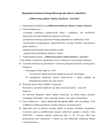 Regulamin konkursu fotograficznego dla dzieci i młodzieży „Odkrywamy piękno Gminy Sieniawa - kościoły” 1. Organizatorem konkursu jest Biblioteka Publiczna Miasta i Gminy Sieniawa 2. Celem konkursu jest: -rozwijanie osobistych zainteresowań dzieci i młodzieży, ich wrażliwości estetycznej oraz indywidualnych zdolności twórczych; -prezentacja twórczego spojrzenia młodego pokolenia na współczesny świat; -umożliwienie fotografującym zaprezentowania swojego dorobku mieszkańcom gminy Sieniawa; -popularyzacja fotografii jako dziedziny sztuki. - popularyzacja architektury Sieniawy i okolic 3. Temat konkursu brzmi : ,,Odkrywamy piękno Gminy Sieniawa - kościoły”. 4. Do udziału w konkursie zapraszamy: dzieci i młodzież z terenu gminy Sieniawa. 5. Uczestnik konkursu ma przedstawić 1 kolorową fotografię (kościół z terenu gminy Sieniawa). Wymagany format zdjęć to: 15x21 Na odwrocie zdjęcia powinien znajdować się opis zawierający: szczegółową lokalizację (nazwę miejscowości w której znajduje się fotografowany obiekt oraz jego nazwę) 6. Wszystkie prace należy składać w kopertach. Na kopercie powinno znajdować się: imię i nazwisko autora, oraz tytuł konkursu. Na odwrocie fotografii należy nakleić metryczkę, na której należy umieścić następujące informacje: imię i nazwisko autora, wiek, adres zamieszkania. 7. Prace konkursowe należy składać do 19 czerwca 2015 roku do godziny 12:00 w Bibliotece Publicznej Miasta i Gminy Sieniawa, ul. Kościuszki 4 8. Zgłoszenie prac na konkurs uważane będzie za uznanie warunków regulaminu, wyrażenie zgody na publikowanie danych osobowych zgodnie z ustawą z dnia 28.08.1997 o ochronie danych osobowych (Dz. U. Nr 133 poz. 883) oraz przeniesienie praw autorskich w całości na rzecz Biblioteki Publicznej Miasta i Gminy Sieniawa. 9. Do oceny złożonych prac zostanie powołane jury. Ze względu na różnice wieku uczestników konkursu, ocena prac będzie odbywać się w trzech kategoriach wiekowych: uczniowie szkół podstawowych uczniowie klas gimnazjalnych uczniowie klas ponadgimnazjalnych W każdej z powyższych kategorii najlepsi (pierwsza trójka) zostaną uhonorowani cennymi nagrodami, przewidujemy także po dwa wyróżnienia. 10. Rozstrzygnięcie konkursu i ocena prac nastąpi w dniach od 22 do 23 czerwca 2015 roku, a ogłoszenie wyników i rozdanie nagród zwycięzcom konkursu nastąpi : 25 czerwca 2015 r. o godz. 12.30 w CKSiR Sokół „Piwnica”. Po zakończeniu konkursu odbędzie się wystawa prac konkursowych w Bibliotece Publicznej Miasta i Gminy Sieniawa, ul Kościuszki 4 Wystawa trwać będzie do 31 sierpnia 2015r. 11. Prace złożone na konkurs nie będą zwracane autorom. 12. Prace, które nie będą spełniały kryteriów przedstawionych w Regulaminie zostaną zdyskwalifikowane. 13. We wszystkich sprawach nie uregulowanych regulaminem decyduje Jury i ostateczna interpretacja Regulaminu należy do Jury. tel. kontaktowy 16 6421433 14. Udział w konkursie jest jednoznaczny z akceptacją regulaminu oraz zgodą na publikację danych osobowych uczestników i zgodą na publikacje materiałów z przebiegu konkursu w tym wizerunku fotografowanych osób.