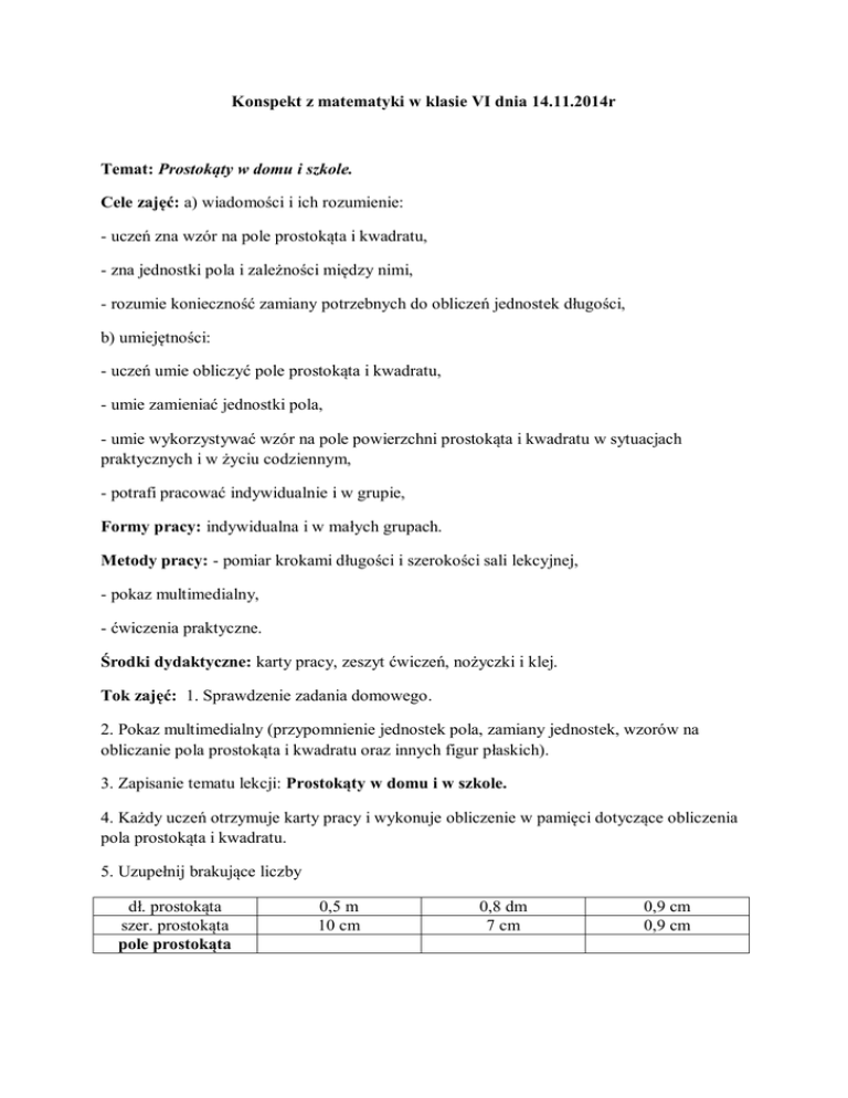 Konspekt z matematyki w klasie VI dnia 14.11.2014r Temat: Prostokąty w domu i szkole. Cele zajęć: a) wiadomości i ich rozumienie: - uczeń zna wzór na pole prostokąta i kwadratu, - zna jednostki pola i zależności między nimi, - rozumie konieczność zamiany potrzebnych do obliczeń jednostek długości, b) umiejętności: - uczeń umie obliczyć pole prostokąta i kwadratu, - umie zamieniać jednostki pola, - umie wykorzystywać wzór na pole powierzchni prostokąta i kwadratu w sytuacjach praktycznych i w życiu codziennym, - potrafi pracować indywidualnie i w grupie, Formy pracy: indywidualna i w małych grupach. Metody pracy: - pomiar krokami długości i szerokości sali lekcyjnej, - pokaz multimedialny, - ćwiczenia praktyczne. Środki dydaktyczne: karty pracy, zeszyt ćwiczeń, nożyczki i klej. Tok zajęć: 1. Sprawdzenie zadania domowego. 2. Pokaz multimedialny (przypomnienie jednostek pola, zamiany jednostek, wzorów na obliczanie pola prostokąta i kwadratu oraz innych figur płaskich). 3. Zapisanie tematu lekcji: Prostokąty w domu i w szkole. 4. Każdy uczeń otrzymuje karty pracy i wykonuje obliczenie w pamięci dotyczące obliczenia pola prostokąta i kwadratu. 5. Uzupełnij brakujące liczby dł. prostokąta szer. prostokąta pole prostokąta 0,5 m 10 cm 0,8 dm 7 cm 0,9 cm 0,9 cm Sprawdzenie wyników – jeden uczeń odczytuje wyniki. 6. W jaki sposób można zmierzyć wymiary naszej klasy (nietypowo). Zmierzymy wymiary naszej sali krokami. Wybrany uczeń, który zna swój wzrost mierzy krokami długość i szerokość. Obliczymy długość jednego kroku w cm w zależności od wzrostu. dł. kroku = wys. w cm/2 dł. sali = szer. sali = pole sali = 7. Proszę dobrać się parami w ławkach, zadaniem waszym jest umeblować pokój. W związku z tym otrzymacie kartkę z rzutem pokoju oraz kartkę z meblami. Należy wyciąć po jednym meblu z każdego rodzaju i umeblować pokój, następnie obliczyć powierzchnię pokoju i powierzchnię mebli. 8. Zadanie domowe: zeszyt ćwiczeń str. 21 zad 1. Wymiary sali lekcyjnej: Długość – ilość kroków: Szerokość – ilość kroków: Długość sali lekcyjnej wyrażona w metrach: Szerokość sali lekcyjnej wyrażona w metrach: Powierzchnia sali lekcyjnej: Jaką część pokoju zajmują meble: