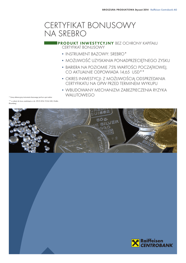 BROSZURA PRODUKTOWa Styczeń 2014 Raiffeisen Centrobank AG CERTYFIKAT BONUSOWY NA SREBRO P rodukt i n w e st yc y j n y BEZ OCHRONY KAPITAŁU CERTYFIKAT BONUSOWY ▪▪ INSTRUMENT BAZOWY: SREBRO* ▪▪ możliwość uzyskania ponadprzeciętnego zysku ▪▪ BARIERA NA POZIOMIE 75% wartości początkowej, CO AKTUALNIE ODPOWIADA 14,65 USD** ▪▪ OKRES INWESTYCJI: Z MOŻLIWOŚCIĄ ODSPRZEDANIA CERTYFIKATU NA GPW PRZED TERMINEM WYKUPU * Ceną referencyjną instrumentu bazowego jest kurs spot srebra ** w relacji do kursu zamknięcia z dn. 09.01.2014 19,54 USD, Źródło: Bloomberg ▪▪ Wbudowany mechanizm zabezpieczenia ryzyka walutowego Raiffeisen Centrobank AG Certyfikat Bonusowy na Srebro SZANSE NA ZYSK W TRENDZIE BOCZNYM Inwestycja w certyfikat bonusowy RCB na srebro daje Inwestorowi możliwość udzialu 1:1 we wzroscie ceny srebra do wysokosci 23%-27,5%* za okres 1,5 roku. W przypadku umiarkowanego spadku ceny srebra, wykup certyfikatu nastapi po 110% wartości nominalnej o ile mechanizm bonusowy pozostanie w mocy (dla spadku niższego niż o 25% w odniesieniu do wartości początkowej - ceny zamknięcia z dnia pierwszej wyceny). Wykup certyfikatów nastąpi w dniu 31.07.2015 r. * ostateczna wysokości limitu górnego zostanie ustalona w dniu 30.01. b.r. NAJWAŻNIEJSZE INFORMACJE Emitent Raiffeisen Centrobank AG Gwarant* Raiffeisen Centrobank AG ISIN AT0000A15229 Kwota nominalna 1000 zł Cena emisyjna 1000 zł Opłata subskrypcyjna 10 zł za jeden certyfikat Subskrypcja1 15 - 28.01.2014 Dzień pierwszej wyceny 30.01.2014 Dzień ostatecznej wyceny 28.07.2015 Dzień wykupu 31.07.2015 Oczekiwany pierwszy dzień notowania na GPW2 21.02.2014 Waluta Produktu PLN (mechanizm zabezpieczenia ryzyka kursu walutowego) Kwota bonusu 10% Limit Gorny 123-127,50%* (ostateczny poziom zostanie ustalony w dn. 30.01.2014 r.) Kwota wykupu (wykup przez Raiffeisen Centrobank AG* w terminie wykupu) Inwestor otrzymuje za każdy certyfikat wartość nominalną plus wartość zmiany ceny srebra nie większą niż 23%-27,5%* wartości nominalnej ale nie mniejszą niż 10% wartości nominalnej, lub jeśli w okresie obserwacji kurs instrumentu bazowego chociaż raz dotknął lub spadł poniżej bariery 75%, kwotę nominalną indeksowana procentowa zmiana ceny instrumentu bazowego (obliczonej w walucie tego instrumentu) do wysokości limitu górnego (cap). NotowaniaGPW2 Aktualna cena www.rcb.at 1 … Raiffeisen Centrobank AG zastrzega sobie prawo do przedwczesnego zakończenia lub wydłużenia okresu subskrypcji. 2 … Intencją Emitenta jest ubieganie się o dopuszczenie certyfikatów do obrotu na GPW. Termin pierwszego notowania może ulec przesunięciu z przyczyn niezależnych od Emitenta BRAK RYZYKA KURSU WALUTOWEGO Certyfikat Bonusowy na srebro zapewnia 100% ochronę przed wpływem zmian kursu walutowego USDPLN na wartość inwestycji. Innymi słowymi kurs walutowy nie ma żadnego wpływu na zmianę wartości certyfikatu. Inwestorzy pragnący zdywersyfikować swój portfel mogą to zrobić poprzez inwestycje w metale szlachetne, które są dla wielu inwestorów jedną z najważniejszych metod ochrony wartości. Srebro jest ciekawą alternatywą dla złota ze względu na jego większe zastosowanie w przemyśle, w szczególności sektorze elektronicznym. Chiny są jednym z największych producentów i konsumentów surowca. Dodatkowo bezpośrednia inwestycja niesie za sobą Inwestycja bezpośrednia w wymaga silnego przekonania co przyszłych wzrostów notowań surowca i nie zapewnia jakiejkolwiek ochrony przed potencjalnym spadkiem ceny. Niesie ona ze sobą również ryzyko walutowe, gdyż cena srebra wyrażona jest w USD. Certyfikat Bonusowy na Srebro jest przeznaczony dla tych inwestorów, którzy w perspektywie 1,5 roku nie oczekują spadków ceny surowca większych niż 25%. Obok warunkowego mechanizmu ochronnego kapitału, inwestorzy nie posiadają ryzyka walutowego w tym produkcie. Zasady funkcjonowania W dacie pierwszej wyceny (30.01.2014) ustalane są: cena początkowa (cena zamknięcia, poziom bariery oraz poziom limitu górnego (cap). Wykup certyfikatu w terminie wykupu zależy od zmiany wartości instrumentu bazowego. W okresie obserwacji cena srebra jest w sposób ciągły porównywana z poziomem bariery. W dniu ostatecznej wyceny może wystąpić jeden z dwóch scenariuszy: Scenariusz 1: W okresie obserwacji cena srebra zawsze była powyżej bariery 75% Tak długo jak cena srebra nie spadnie do poziomu 75% wartości początkowej lub więcej, mechanizm bonusowy w dniu wykupu jest aktywny. Tym samym, w dniu wykupu inwestor otrzymuje 100% zainwestowanego kapitału (z wyłączeniem opłaty subskrypcyjnej) plus kwotę bonusu (równą 100 zł za jeden certyfikat) co łącznie odpowiada 1100 zł za każdy certyfikat. W przypadku wzrostu ceny srebra więcej niż 10% inwestor partycypuje w tym wzroście do wysokości górnego limitu 23%-27,5% www.rcb.at INSTRUMENT BAZOWY Fixing ceny srebra na London Silver Market w Londynie. Cena używana do obserwacji bariery to cena z Bloomberg XAG. Cena srebra ustalana jest w dolarach amerykańskich za uncję trojańską (przy czym 1 uncja odpowiada ok. 31.10 gramów). Przykładowy Wykup (Przykładowy cap 125%) Stopa zwrotu ZE SREBRA KWOTA WYKUPU CERTYFIKATU +35% wyplata wedlug w wysokosci limitu gornego (cap) 1250 zł +23% 23%x 1000 zł (wynik srebra > 10%) + 1000 zł (kwota nominalna) 1230 zł +15% 15% x 1000 zł (wynik srebra > 10%) + 1000 zł (kwota nominalna) 1150 zł +8% 10% x 1000 zł (bonus) + 1000 zł (kwota nominalna) 1100 zł -24% 10% x 1000 zł (bonus) + 1000 zł (kwota nominalna) 1100 zł Cena USD 60,00 50,00 40,00 30,00 20,00 10,00 0 Q1 Q2 Q3 Q4 Q1 2009 Q2 Q3 2010 Q4 Q1 Q2 Q3 Q4 2011 Q1 Q2 Q3 Q4 Q1 Q2 2012 Q3 Q4 2013 Źrodło: Bloomerg (SLVRLN) Prosimy pamiętać, że wyniki rynkowe odnotowane w przeszłości nie mogą stanowić podstaw do wyciągania jakichkolwiek wnioskow i formułowania jakichkolwiek prognoz odnośnie przyszłych wyników indeksu ani produ