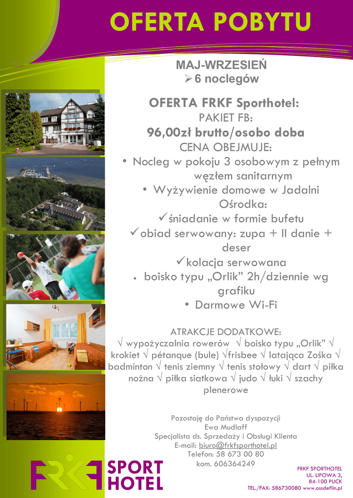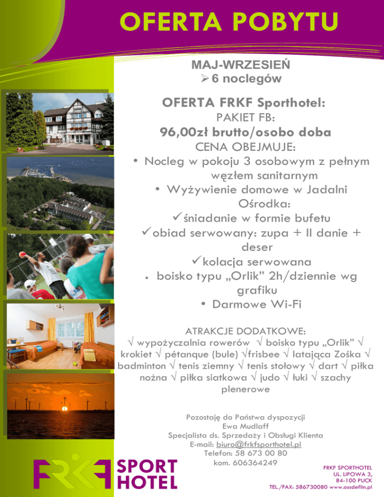 OFERTA POBYTU Rozwiązania informatyczne MAJ-WRZESIEŃ 6 noclegów OFERTA FRKF Sporthotel: PAKIET FB: 96,00zł brutto/osobo doba CENA OBEJMUJE: • Nocleg w pokoju 3 osobowym z pełnym węzłem sanitarnym • Wyżywienie domowe w Jadalni Ośrodka: śniadanie w formie bufetu obiad serwowany: zupa + II danie + deser kolacja serwowana boisko typu „Orlik” 2h/dziennie wg grafiku • Darmowe Wi-Fi ATRAKCJE DODATKOWE: √ wypożyczalnia rowerów √ boisko typu „Orlik” √ krokiet √ pétanque (bule) √frisbee √ latająca Zośka √ badminton √ tenis ziemny √ tenis stołowy √ dart √ piłka nożna √ piłka siatkowa √ judo √ łuki √ szachy plenerowe [Wpisz tekst] Pozostaję do Państwa dyspozycji Ewa Mudlaff Specjalista ds. Sprzedaży i Obsługi Klienta E-mail: [email protected] Telefon: 58 673 00 80 kom. 606364249 FRKF SPORTHOTEL UL. LIPOWA 3, 84-100 PUCK TEL./FAX: 586730080 www.ossdeflin.pl