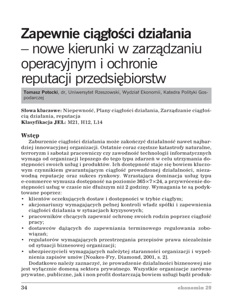 Zapewnie ci¹g³oœci dzia³ania – nowe kierunki w zarz¹dzaniu operacyjnym i ochronie reputacji przedsiêbiorstw Tomasz Potocki, dr, Uniwersytet Rzeszowski, Wydzia³ Ekonomii, Katedra Polityki Gospodarczej S³owa kluczowe: Niepewnoœæ, Plany ci¹g³oœci dzia³ania, Zarz¹dzanie ci¹g³oœci¹ dzia³ania, reputacja Klasyfikacja JEL: M21, H12, L14 Wstêp Zaburzenie ci¹g³oœci dzia³ania mo¿e zakoñczyæ dzia³alnoœæ nawet najbardziej innowacyjnej organizacji. Ostatnie coraz czêstsze katastrofy naturalne, terroryzm i sabota¿ pracowniczy czy zawodnoœæ technologii informatycznych wymaga od organizacji lepszego do tego typu zdarzeñ w celu utrzymania dostêpnoœci swoich us³ug i produktów. Ich dostêpnoœæ staje siê bowiem kluczowym czynnikiem gwarantuj¹cym ci¹g³oœæ prowadzonej dzia³alnoœci, niezawodn¹ reputacjê oraz sukces rynkowy. Wzrastaj¹ca dominacja us³ug typu e-commerce wymusza dostêpnoœæ na poziomie 365×7×24, a przywrócenie dostêpnoœci us³ug w czasie nie d³u¿szym ni¿ 2 godziny. Wymagania te s¹ podyktowane poprzez: • klientów oczekuj¹cych dostaw i dostêpnoœci w trybie ci¹g³ym; • akcjonariuszy wymagaj¹cych pe³nej kontroli w³adz spó³ki i zapewnienia ci¹g³oœci dzia³ania w sytuacjach kryzysowych; • pracowników chc¹cych zapewniæ ochronê swoich rodzin poprzez ci¹g³oœæ pracy; • dostawców d¹¿¹cych do zapewniania terminowego regulowania zobowi¹zañ; • regulatorów wymagaj¹cych przestrzegania przepisów prawa niezale¿nie od sytuacji biznesowej organizacji; • ubezpieczycieli wymagaj¹cych nale¿ytej starannoœci organizacji i wype³nienia zapisów umów [Noakes-Fry, Diamond, 2001, s. 2]. Dodatkowo nale¿y zaznaczyæ, ¿e prowadzenie dzia³alnoœci biznesowej nie jest wy³¹cznie domen¹ sektora prywatnego. Wszystkie organizacje zarówno prywatne, publiczne, jak i non profit dostarczaj¹ bowiem us³ugi b¹dŸ produk- 34 ekonomia 29 Zapewnie ci¹g³oœci dzia³ania — nowe kierunki w zarz¹dzaniu operacyjnym… ty swoim klientom. W ³añcuchu dostaw pojawiaj¹ siê incydenty i zdarzenia, które nie tylko mog¹ zak³óciæ efektywny proces dostarczania produktów i us³ug, ale wrêcz go zablokowaæ, doprowadzaj¹c do przestoju operacyjnego organizacji. Powoduje to najczêœciej obni¿enie reputacji organizacji, a przy powtarzaniu siê takich zdarzeñ prowadzi do jej marginalizacji i w koñcu do upadku. Ale jak przygotowaæ siê na sytuacje (ataki terrorystyczne, nag³e powodzie czy po¿ary), których w wiêkszoœci przypadków nie jesteœmy w stanie przewidzieæ? Z pomoc¹ przychodzi strategia zapewnienia ci¹g³oœci dzia³ania obejmuj¹ca szerokie spektrum narzêdzi technologicznych, elektronicznych, papierowych. Wykorzystuj¹ca narzêdzia zautomatyzowane i manualne, a tak¿e stosuj¹ca podejœcie indywidualne lub globalne. Zyskuje ona coraz wiêksze znaczenie zarówno w procesie zarz¹dzania ryzykiem operacyjnym, jak i ochronie reputacji przedsiêbiorstw. Du¿¹ rolê odgrywaj¹ dzia³ania zwi¹zanie z zarz¹dzaniem ryzykiem, zarz¹dzaniem kryzysowym czy budowaniem planów ci¹g³oœci dzia³ania. Nale¿y jednak zaznaczyæ, ¿e efektywnoœæ tych dzia³añ zale¿y w g³ównej mierze od ujêcia ich w planach strategii przedsiêbiorstwa i pe³nej integracji tych dzia³añ z dzia³aniami biznesowymi organizacji. Zarz¹dzanie ci¹g³oœci¹ dzia³ania pocz¹tkowo by³o uto¿samiane z dzia³alnoœci¹ du¿ych ponadnarodowych korporacji i sektorem publicznym. Jednak, jak wspomnieliœmy powy¿ej, obecnie jest to wyzwanie dla ka¿dej organizacji, która chce odnosiæ sukcesy rynkowe zwi¹zane ze wzrostem sprzeda¿y, zadowoleniem klientów i rosn¹c¹ reputacj¹ wœród akcjonariuszy. Jak wskazuj¹ bowiem badania prowadzone przez The Chartered Management Institute ju¿ ponad 52% wœród badanych organizacji stanowi¹ ma³e i œrednie, b¹dŸ te reprezentuj¹ce specyficzne i niszowe bran¿e [Woodman, Kumar, 2009, s. 4]. Zarz¹dzanie ci¹g³oœci¹ dzia³ania nie jest jedynie odpowiedzialnoœci¹ dzia³ów IT. Wskazujemy na ten aspekt, gdy¿ przez wiele lat i w wielu krêgach dominowa³ ten pogl¹d. Prawd¹ jest natomiast, ¿e zarz¹dzanie ci¹g³oœci¹ dzia³ania narodzi³o siê i rozwija³o z planów ci¹g³oœci systemów IT, ale ju¿ dawno przesta³o byæ domen¹ departamentów IT, a sta³o siê czêœci¹ strategii przedsiêbiorstwa i zwi¹zane jest bezpoœrednio z dzia³aniami pionów biznesowych. Logika dzia³añ w obszarze zarz¹dzania ci¹g³oœci¹ dzia³ania powinna obj¹æ jako punkt wyjœcia prezentacjê incydentów i zdarzeñ, które mog¹ zachwiaæ reputacj¹ przedsiêbiorstwa, oraz ich wp³ywu na dzia³alnoœæ operacyjn¹ organizacji. Przyk³ady takich sytuacji prezentowane s¹ w poni¿szym rozdziale. Zagro¿enia dla ci¹g³oœci dzia³ania Organizacje odpowiadaj¹ce za swoje dzia³ania i wyniki przed interesariuszami musz¹ wzi¹æ pod uwagê zdarzenia „kryzysowe”, które wymagaj¹ „kryzysowych” dzia³añ i nie mog¹ byæ nadzorowane w oparciu o typowe procedury dzia³añ naprawczych czy narzêdzia zarz¹dzania ryzykiem. Jedn¹ z najpowa¿niejszych konsekwencji wyst¹pienia sytuacji kryzysowych mo¿e byæ ekonomia 29 35 Tomasz Potocki zniszczenie b¹dŸ czasowa niedostêpnoœæ infrastruktury organizacji, krytycznej z punktu widzenia prowadzenia dzia³alnoœci biznesowej. W 2007 roku Chartered Management Institute wyda³ ósmy ju¿ raport Business Continuity Management poœwiêcony ci¹g³oœci biznesu, w którym zapyta³ 10 600 cz³onków instytutu w Wielkiej Brytanii o zagadnienia poœwiêcone zarz¹dzaniu sytuacj¹ kryzysow¹ oraz potrzeb¹ wdra¿ania systemów zarz¹dzania ci¹g³oœci¹ biznesu. Na powy¿sze ankiety odpowiedzia³o 1257 respondentów i stanowi³o to próbê badawcz¹ dla autorów. Jak wskazuj¹ autorzy, gdy w roku 2002 najwiêksze zagro¿enie dla kontynuowania dzia³alnoœci biznesowej stanowi³y krytyczna opinia w mediach (33%), utrata kluczowych umiejêtnoœci pracowniczych (2