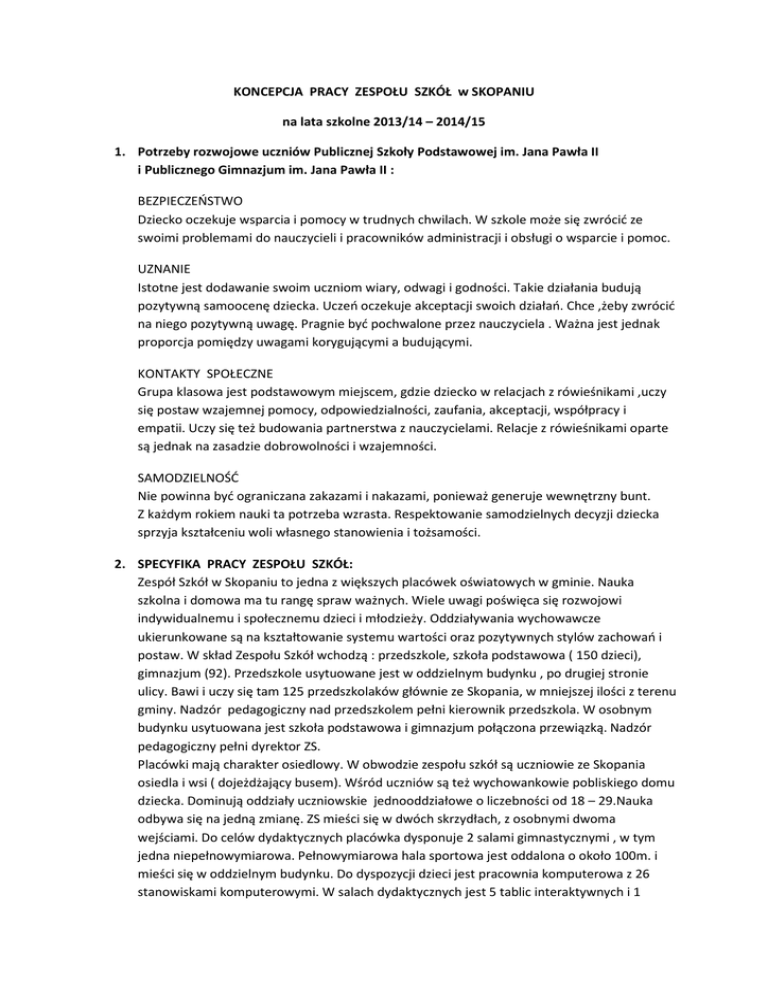 KONCEPCJA PRACY ZESPOŁU SZKÓŁ w SKOPANIU na lata szkolne 2013/14 – 2014/15 1. Potrzeby rozwojowe uczniów Publicznej Szkoły Podstawowej im. Jana Pawła II i Publicznego Gimnazjum im. Jana Pawła II : BEZPIECZEŃSTWO Dziecko oczekuje wsparcia i pomocy w trudnych chwilach. W szkole może się zwrócić ze swoimi problemami do nauczycieli i pracowników administracji i obsługi o wsparcie i pomoc. UZNANIE Istotne jest dodawanie swoim uczniom wiary, odwagi i godności. Takie działania budują pozytywną samoocenę dziecka. Uczeń oczekuje akceptacji swoich działań. Chce ,żeby zwrócić na niego pozytywną uwagę. Pragnie być pochwalone przez nauczyciela . Ważna jest jednak proporcja pomiędzy uwagami korygującymi a budującymi. KONTAKTY SPOŁECZNE Grupa klasowa jest podstawowym miejscem, gdzie dziecko w relacjach z rówieśnikami ,uczy się postaw wzajemnej pomocy, odpowiedzialności, zaufania, akceptacji, współpracy i empatii. Uczy się też budowania partnerstwa z nauczycielami. Relacje z rówieśnikami oparte są jednak na zasadzie dobrowolności i wzajemności. SAMODZIELNOŚĆ Nie powinna być ograniczana zakazami i nakazami, ponieważ generuje wewnętrzny bunt. Z każdym rokiem nauki ta potrzeba wzrasta. Respektowanie samodzielnych decyzji dziecka sprzyja kształceniu woli własnego stanowienia i tożsamości. 2. SPECYFIKA PRACY ZESPOŁU SZKÓŁ: Zespół Szkół w Skopaniu to jedna z większych placówek oświatowych w gminie. Nauka szkolna i domowa ma tu rangę spraw ważnych. Wiele uwagi poświęca się rozwojowi indywidualnemu i społecznemu dzieci i młodzieży. Oddziaływania wychowawcze ukierunkowane są na kształtowanie systemu wartości oraz pozytywnych stylów zachowań i postaw. W skład Zespołu Szkół wchodzą : przedszkole, szkoła podstawowa ( 150 dzieci), gimnazjum (92). Przedszkole usytuowane jest w oddzielnym budynku , po drugiej stronie ulicy. Bawi i uczy się tam 125 przedszkolaków głównie ze Skopania, w mniejszej ilości z terenu gminy. Nadzór pedagogiczny nad przedszkolem pełni kierownik przedszkola. W osobnym budynku usytuowana jest szkoła podstawowa i gimnazjum połączona przewiązką. Nadzór pedagogiczny pełni dyrektor ZS. Placówki mają charakter osiedlowy. W obwodzie zespołu szkół są uczniowie ze Skopania osiedla i wsi ( dojeżdżający busem). Wśród uczniów są też wychowankowie pobliskiego domu dziecka. Dominują oddziały uczniowskie jednooddziałowe o liczebności od 18 – 29.Nauka odbywa się na jedną zmianę. ZS mieści się w dwóch skrzydłach, z osobnymi dwoma wejściami. Do celów dydaktycznych placówka dysponuje 2 salami gimnastycznymi , w tym jedna niepełnowymiarowa. Pełnowymiarowa hala sportowa jest oddalona o około 100m. i mieści się w oddzielnym budynku. Do dyspozycji dzieci jest pracownia komputerowa z 26 stanowiskami komputerowymi. W salach dydaktycznych jest 5 tablic interaktywnych i 1 tablica niepełnowymiarowa. Biblioteka z ICM dysponuje bogatym księgozbiorem. Proces opieki ułatwia funkcjonowanie stołówki szkolnej i świetlica dostosowana do godzin pracy rodziców .Większość zatrudnionej kadry nauczycielskiej to nauczyciele dyplomowani .Szkoła zatrudnia pedagogów szkolnych. Szkoła podstawowa i gimnazjum osiągają dobre wyniki w egzaminach zewnętrznych, co potwierdzają raporty OKE w Krakowie( staniny od średnich do wysokich wyników).Corocznie szkoły odnoszą znaczące sukcesy w pracy z uczniem zdolnym (konkursy przedmiotowe, artystyczne i sportowe).Funkcjonuje spójny system zajęć pozalekcyjnych uwzględniający oczekiwania i możliwości uczniów. W ZS wytworzony jest dobry klimat sprzyjający kulturze edukacyjnej. Motorem wielu działań szkół są rodzice, którzy skupiają się na dobrej edukacji i także pracują na wyniki edukacyjne. ZS wychodzi do środowiska lokalnego współpracując z organem prowadzącym, instytucjami i stowarzyszeniami. Problemem ZS jest brak wielofunkcyjnego boiska sportowego. 3. ZIDENTYFIKOWANE OCZEKIWANIA ŚRODOWISKA LOKALNEGO: Uczniowie ( rozmowa z uczniami w klasach) „ Co dla Was jest ważne w szkole i powinno być przedmiotem szczególnej troski?”: - wiedza - zachowanie - zajęcia sportowe - rozwój zainteresowań - rozwój postaw patriotycznych - indywidualizacja -praca zespołowa - aktywność wszystkich uczniów - motywacja do nauki - bardzo dobre przygotowanie do egzaminu - różne sposoby uczenia - szersze zaangażowanie w życie szkoły. Nauczyciele ( dyskusja na radzie pedagogicznej): - skuteczna edukacja i wychowanie - poszerzanie aktywności uczniów - rozwijanie współpracy z rodzicami Rodzice ( ankieta przekazana do domu) : - skuteczna edukacja i wychowanie 122 osoby 93% - poszerzanie aktywności uczniów 104 79% - promowanie nauki i kultury 90 69% - rozwijanie współpracy z rodzicami 33 25% - otwarcie się na środowisko lokalne 32 24% - inne: nacisk na j. angielski 1 Skuteczniejsza edukacja dzieci zdolnych oraz uwzględnianie możliwości rozwoju jego zainteresowań 1 Indywidualne podejście do nauki 1 Rozwijanie i wyszukiwanie nowych talentów u dzieci 1 KIERUNKI DZIAŁANIA ZESPOŁU SZKÓŁ w SKOPANIU wspólnie ustalone przez społeczność szkolną ( uczniów, nauczycieli i rodziców) na lata szkolne 2013/14 – 2014/15 1. SKUTECZNA EDUKACJA I WYCHOWANIE 2. POSZERZANIE AKTYWNOŚCI UCZNIÓW 3. PROMOWANIE NAUKI I KULTURY Koncepcja pracy została przyjęta na radzie pedagogicznej w dniu 19. 09. 2013 r.