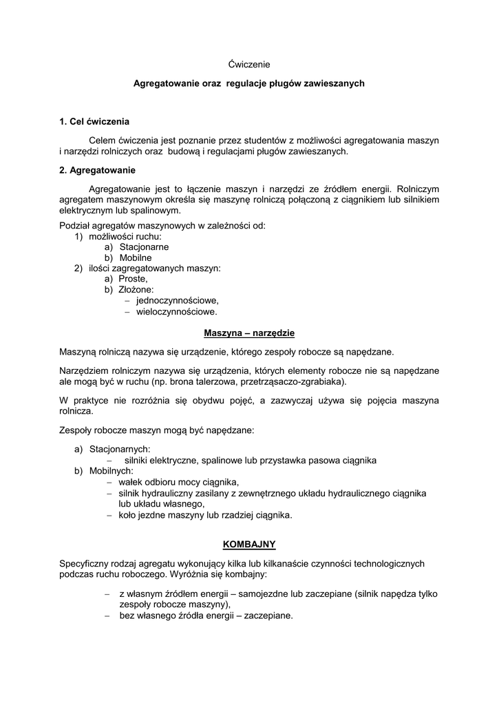Ćwiczenie Agregatowanie oraz regulacje pługów zawieszanych 1. Cel ćwiczenia Celem ćwiczenia jest poznanie przez studentów z możliwości agregatowania maszyn i narzędzi rolniczych oraz budową i regulacjami pługów zawieszanych. 2. Agregatowanie Agregatowanie jest to łączenie maszyn i narzędzi ze źródłem energii. Rolniczym agregatem maszynowym określa się maszynę rolniczą połączoną z ciągnikiem lub silnikiem elektrycznym lub spalinowym. Podział agregatów maszynowych w zależności od: 1) możliwości ruchu: a) Stacjonarne b) Mobilne 2) ilości zagregatowanych maszyn: a) Proste, b) Złożone: jednoczynnościowe, wieloczynnościowe. Maszyna – narzędzie Maszyną rolniczą nazywa się urządzenie, którego zespoły robocze są napędzane. Narzędziem rolniczym nazywa się urządzenia, których elementy robocze nie są napędzane ale mogą być w ruchu (np. brona talerzowa, przetrząsaczo-zgrabiaka). W praktyce nie rozróżnia się obydwu pojęć, a zazwyczaj używa się pojęcia maszyna rolnicza. Zespoły robocze maszyn mogą być napędzane: a) Stacjonarnych: silniki elektryczne, spalinowe lub przystawka pasowa ciągnika b) Mobilnych: wałek odbioru mocy ciągnika, silnik hydrauliczny zasilany z zewnętrznego układu hydraulicznego ciągnika lub układu własnego, koło jezdne maszyny lub rzadziej ciągnika. KOMBAJNY Specyficzny rodzaj agregatu wykonujący kilka lub kilkanaście czynności technologicznych podczas ruchu roboczego. Wyróżnia się kombajny: z własnym źródłem energii – samojezdne lub zaczepiane (silnik napędza tylko zespoły robocze maszyny), bez własnego źródła energii – zaczepiane. Sposoby łączenia maszyn z ciągnikiem a) zawieszenie tylne (trójpunktowe) środkowe (boczne) przednie (czołowe b) półzawieszenie c) zaczepienie d) nabudowanie Mechanizmy łączenia ciągnika z maszynami 3. Pługi Ogólna budowa pługa Każdy pług składa się następujących zespołów i podzespołów: rama, korpus (lemieszowy lub talerzowy), mechanizmy do łączenia z ciągnikiem, mechanizmy regulacji (głębokości i szerokości orki). Ponadto pługi (półzawieszane) posiadają mechanizmy zmiany położenia z roboczego w transportowe i odwrotnie. Podstawowym zespołem roboczym każdego pługa jest korpus (lemieszowy lub talerzowy). Klasyfikacja pługów-kryteria Tabela 1 Budowa korpusu pługa lemieszowego Podstawowymi elementami korpusu płużnego są: lemiesz i odkładnica - są to elementy czynne, tworzące korpusu, słupica i płoza zakończona piętką - elementy bierne. powierzchnię roboczą Korpus pługa lemieszowego: 1-lemiesz, 2-odkładnica (3-pierś odkładnicy, 4-skrzydło odkładnicy), 5-słupica, 6-płoza, 7-piętka płozy, 8-listwa usztywniająca (zastrzał) 4. Przebieg ćwiczenia Zagregatować pług z ciągnikiem. Wykonać regulację poziomowania podłużnego i poprzecznego. Ustawić głębokość pracy pługa na 20 cm. Wyorywanie pierwszych bruzd pługiem ciągnikowym. Rozpoczynając orkę najczęściej stosuje się metodę podwójnej bruzdy. Przy pierwszym przejeździe pług ustawia się tak, aby orał płytko (8-10cm) i tylko ostatnim korpusem. f) Pierwszy przejazd należy wykonać na dosyć prędko tak, aby nastąpiło możliwie jak najszersze rozrzucenie skiby. g) Do drugiego przejazdu traktorzysta wykonuje nawrót w lewo i wyoruje drugą skibę tuż obok pierwszej . Powstaje w ten sposób podwójna bruzda – stąd nazwa tej metody Druga bruzda powinna być nieco głębsza niż pierwsza i też wyorana tylko ostatnim korpusem pługa h) Następne przejazdy pługa wykonuje się w skład. Przed trzecim przejazdem pługa należy opuścić pozostałe korpusy. Nastawienie pługa trzeba przy tym zmieniać tak, aby pierwszy korpus orał nowo bruzdę tylko nieznacznie głębszą od bruzdy wyznaczającej grzbiet zagonu, natomiast ostatni – prawie na pełną głębokość orki. Zagłębienie poszczególnych korpusów pługa podczas tego przejazdu będzie więc niejednakowe, a rama pługa przyczepianego lub zawieszanego nie będzie ustawiona poziomo. i) W podobny sposób możemy również orać przy czwartym przejeździe pługa. j) Po wyoraniu pierwszych czterech skib i wypoziomowaniu pługa przystępujemy do normalnego wyorywania orki. a) b) c) d) e) 5. Treść sprawozdania a) W sprawozdaniu należy opisać zadania wykonywane w punktach a - j. b) Dokonać oceny jakości orki wg poniższych kryteriów: sposób wyorania pierwszych skib (na grzbiecie zagonu), równość i prostoliniowość skib, głębokość orki, dokładność kruszenia gleby i przykrycia resztek roślinnych, sposób wykończenia orki. Literatura Józef Kuczewski, „Budowa i regulacja maszyn rolniczych”. PWN 1992r. Leszek Mieszkalski, „Maszyny rolnicze w schematach”. ART. Olsztyn 1991r. Kufel K.: Maszyny i urządzenia rolnicze. AR Szczecin 1992r. Worona M., Dawidowski J.B.: Maszyny rolnicze cz.1, AR Szczecin 1999. Ciągniki i maszyny rolnicze budowa, przeznaczenie. Informator PIMR Poznań 2004/2005. 6. Instrukcje fabryczne. 1. 2. 3. 4. 5. Pytania kontrolne 1. Wymienić sposoby łączenia maszyn z ciągnikiem 2. Wymienić elementy wchodzące w skład trójpunktowego układu zawieszenia 3. Wymienić główne zespoły pługów zawieszanych 4. Omówić budowę elementów roboczych pługa 5. Jak przygotowuje się pług zawieszany do pracy?