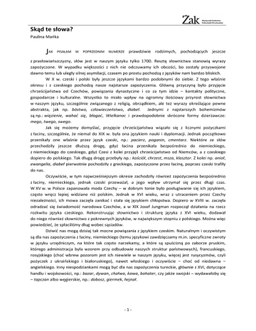 Skąd te słowa? Paulina Mańka JAK PISAŁAM W POPRZEDNIM NUMERZE prawdziwie rodzimych, pochodzących jeszcze z prasłowiańszczyzny, słów jest w naszym języku tylko 1700. Resztę słownictwa stanowią wyrazy zapożyczone. W wypadku większości z nich nie odczuwamy ich obcości, bo zostały przyswojone dawno temu lub uległy silnej asymilacji, czasem po prostu pochodzą z języków nam bardzo bliskich. W X w. czeski i polski były jeszcze językami bardzo podobnymi do siebie. Z tego właśnie okresu i z czeskiego pochodzą nasze najstarsze zapożyczenia. Główną przyczyną było przyjęcie chrześcijaństwa od Czechów, powiązania dynastyczne i co za tym idzie – kontakty polityczne, gospodarcze i kulturalne. Wszystko to miało wpływ na ogromny ilościowy przyrost słownictwa w naszym języku, szczególnie związanego z religią, obrządkiem, ale też wyrazy określające pewne abstrakta, jak np. bóstwo, człowieczeństwo, diabeł. Jednymi z najstarszych bohemizmów są np.: więzienie, wahać się, błagać, Wielkanoc i prawdopodobnie skrócone formy dzierżawcze: mego, twego, swego. Jak się możemy domyślać, przyjęcie chrześcijaństwa wiązało się z licznymi pożyczkami z łaciny, szczególnie, że niemal do XIX w. była ona językiem nauki i dyplomacji. Jednak początkowo przenikały one właśnie przez język czeski, np.: pacierz, poganin, cmentarz. Niektóre ze słów przechodziły jeszcze dłuższą drogę, gdyż łacina przenikała bezpośrednio do niemieckiego, z niemieckiego do czeskiego, gdyż Czesi z kolei przyjęli chrześcijaństwo od Niemców, a z czeskiego dopiero do polskiego. Tak długą drogę przebyły np.: kościół, chrzest, msza, klasztor. Z kolei np. anioł, ewangelia, diabeł pierwotnie pochodziły z greckiego, zapożyczone przez łacinę, poprzez czeski trafiły do nas. Oczywiście, w tym najwcześniejszym okresie zachodziły również zapożyczenia bezpośrednio z łaciny, niemieckiego, jednak czeski przeważał, a jego wpływ utrzymał się przez długi czas. W XV w. w Polsce zapanowała moda Czechy – w dobrym tonie było posługiwanie się ich językiem, często wręcz lepiej widziane niż polskim. Jednak w XVI wieku, wraz z utraceniem przez Czechy niezależności, ich mowa zaczęła zanikać i stała się językiem chłopstwa. Dopiero w XVIII w. zaczęła odradzać się świadomość narodowa Czechów, a w XIX Josef Jungman rozpoczął działania na rzecz rozkwitu języka czeskiego. Rekonstruując słownictwo i strukturę języka z XVI wieku, dodawał do niego również słownictwo z pokrewnych języków, w największym stopniu z polskiego. Można więc powiedzieć, że spłaciliśmy dług wobec sąsiadów. Dziwić nas mogą dzisiaj tak mocne powiązania z językiem czeskim. Naturalnym i oczywistym są dla nas zapożyczenia z łaciny, niemieckiego (temu językowi zawdzięczamy m.in. specyficzne zwroty w języku urzędniczym, na które tak często narzekamy, a które są spuścizną po zaborze pruskim, którego administracja była wzorem przy odbudowie naszych struktur państwowych), francuskiego, rosyjskiego (choć wbrew pozorom jest ich niewiele w naszym języku, więcej jest rusycyzmów, czyli pożyczek z ukraińskiego i białoruskiego), nawet włoskiego i oczywiście – choć od niedawna – angielskiego. Inny niespodziankami mogą być dla nas zapożyczenia tureckie, głównie z XVI, dotyczące handlu i wojskowości, np.: bazar, dywan, chałwa, kawa, bohater, czy jakże swojski – wydawałoby się – tapczan albo węgierskie, np.: dobosz, giermek, hejnał. -1- Wbrew pozorom, 1700 słów zachowanych jeszcze z prasłowiańszczyzny to bardzo dobry wynik. Nie możemy myśleć, że skoro stanowią one tak znikomą ilość na tle słów zapożyczonych, to tak właściwie nie możemy mówić o języku polskim. Język to nie tylko same słowa, ale także ich specyficzne znaczenia (czasem zmieniane w procesie przejmowania wyrazów), fonologia, morfologia i kładnia języka. Większość pożyczek ulega zaadaptowaniu na grunt polski, stąd nie wyczuwamy ich obcości. A są one pięknym odzwierciedleniem naszej bujnej historii i bogatych kontaktów z innymi narodami. -2-