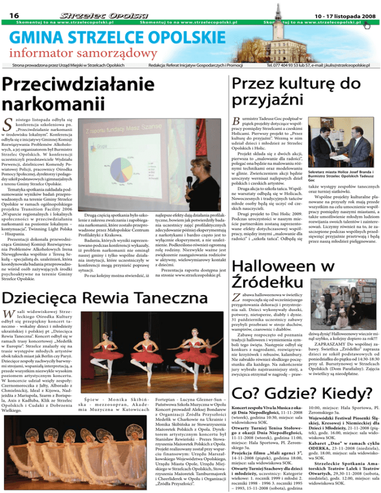 16 10 - 17 listopada 2008 Skomentuj to na w w w.strzelecopolski.pl Skomentuj to na w w w.strzelecopolski.pl Skomentuj to na w w w.strzelecopolski.pl GMINA STRZELCE OPOLSKIE informator samorządowy Strona prowadzona przez Urząd Miejski w Strzelcach Opolskich Redakcja: Referat Inicjatyw Gospodarczych i Promocji Przeciwdziałanie narkomanii S Przez kulturę do przyjaźni B urmistrz Tadeusz Goc podpisał w piątek projekty dotyczące współpracy pomiędzy Strzelcami a czeskimi Holicami. Pierwszy projekt to „Przez kulturę do przyjaźni”. Wezmą w nim udział dzieci i młodzież ze Strzelec Opolskich i Holic. zóstego listopada odbyła się konferencja szkoleniowa pn. „Przeciwdziałanie narkomanii w środowisku lokalnym”. Konferencja odbyła się z inicjatywy Gminnej Komisji Rozwiązywania Problemów Alkoholowych, a jej organizatorem był Burmistrz Strzelec Opolskich. W konferencji uczestniczyli przedstawiciele Wydziału Prewencji, dzielnicowi Komendy Powiatowej Policji, pracownicy Ośrodka Pomocy Społecznej, dyrektorzy i pedagodzy szkół podstawowych i gimnazjalnych z terenu Gminy Strzelce Opolskie. Tematyka spotkania zakładała podsumowanie wyników badań przeprowadzonych na terenie Gminy Strzelce Opolskie w ramach ogólnopolskiego projektu Transition Facility 2006 „Wsparcie regionalnych i lokalnych społeczności w przeciwdziałaniu narkomanii na poziomie lokalnym – kontynuacja”, Twinning Light Polska – Hiszpania. Prezentacji dokonała przewodnicząca Gminnej Komisji Rozwiązywania Problemów Alkoholowych Irena Niewęgłowska wspólnie z Teresą Sekułą – specjalistą ds. uzależnień, która koordynowała badania przeprowadzone wśród osób zażywających środki psychoaktywne na terenie Gminy Strzelce Opolskie. Drugą częścią spotkania było szkolenie z zakresu zwalczania i zapobiegania narkomanii, które zostało przeprowadzone przez Małopolskie Centrum Profilaktyki z Krakowa. Badania, których wyniki zaprezentowano podczas konferencji wykazały, iż problem narkomanii nie ominął naszej gminy i tylko wspólne działania instytucji, które uczestniczyły w konferencji mogą przynieść poprawę sytuacji. Po raz kolejny można stwierdzić, iż najlepsze efekty dają działania profilaktyczne, bowiem jak potwierdziły badania uczestnicy zajęć profilaktycznych zdecydowanie później eksperymentują z narkotykami i bardzo często jest to wyłącznie eksperyment, a nie uzależnienie. Podkreślono również ogromną rolę rodziny. Niezwykle ważne jest zwiększenie zaangażowania rodziców w aktywny, wielowymiarowy kontakt z dziećmi. Prezentacja raportu dostępna jest na stronie www.strzelceopolskie.pl. Dziecięca Rewia Taneczna W sali widowiskowej Strzeleckiego Ośrodka Kultury odbył się przepiękny koncert taneczno - wokalny dzieci i młodzieży ukraińskiej i polskiej pt „Dziecięca Rewia Taneczna”. Koncert odbył się w ramach trasy koncertowej „Medefik w Europie”. Strzelce znalazły się na trasie występów młodych artystów obok takich miast jak Berlin czy Paryż. Dziecięce zespoły zachwyciły barwnymi strojami, wspaniałą interpretacją, a przede wszystkim niezwykle wysokim poziomem artystycznym koncertu. W koncercie udział wzięły zespoły: Czernomoroczka z Jałty, Alborado z Chmielnickij, Ideal z Kijowa, Nadjeżdża z Mariupola, Szarm z Borispola, Axis z Kadłuba, Klik ze Strzelec Opolskich i Cudaki z Dobrzenia Wielkiego. Tel. 077 404 93 53 lub 57, e-mail: [email protected] Projekt składa się z dwóch akcji, pierwsza to „malowanie dla radości”, polegać ona będzie na malowaniu różnymi technikami oraz modelowaniu w glinie. Zwieńczeniem akcji będzie uroczysty wernisaż najlepszych dzieł polskich i czeskich artystów. Druga akcja to szkoła tańca. Wspólne warsztaty odbędą się w Holicach. Nowoczesnych i tradycyjnych tańców młode osoby będą się uczyć od czeskich nauczycieli. Drugi projekt to Dni Holic 2009. Podczas uroczystości w naszym mieście partnerskim zostaną zaprezentowane efekty dotychczasowej współpracy, między innymi „malowanie dla radości” i „szkoła tańca”. Odbędą się Fortepian - Lucyna Glezner-Sun – Państwowa Szkoła Muzyczna w Opolu Koncert prowadził Aleksej Bondarew z Organizacji Źródła Przyszłości Medefik w Charkowie na Ukrainie i Monika Skibińska ze Stowarzyszenia Mażoretek Polskich z Opola. Dyrektorem artystycznym koncertu był Stanisław Rewieński - Prezes Stowarzyszenia Mażoretek Polskich z Opola. Projekt realizowany został przy wsparciu finansowym: Urzędu Marszałkowskiego Województwa Opolskiego, Urzędu Miasta Opole, Urzędu Miejskiego w Strzelcach Opolskich, Stowarzyszenia Mażoretek Tamburmajorek i Cheerliderek w Opolu i Organizacji „Źródła Przyszłości”. także występy zespołów tanecznych oraz turniej siatkówki. Wspólne projekty kulturalne planowane na przyszły rok mają przede wszystkim na celu umocnienie współpracy pomiędzy naszymi miastami, a także umożliwienie młodym ludziom rozwijania swoich talentów i zainteresowań. Liczymy również na to, że zaszczepione podczas wspólnych przedsięwzięć przyjaźnie przetrwają i będą przez naszą młodzież pielęgnowane. Halloween w Źródełku Z abawa halloweenowa w świetlicy rozpoczęła się od wcześniejszego przygotowania dekoracji i przystrojenia sali. Dzieci wykonywały duszki, potwory, nietoperze, diabły i dynie. 31 października uczestnicy zabawy przybyli przebrani w stroje duchów, wampirów, czarownic i diabłów. Zabawę rozpoczęto od poznania tradycji halloween i wymienienia symboli tego święta. Następnie odbył się konkurs z nagrodami, rozwiązywanie krzyżówek i rebusów, kalambury. Nie zabrakło również słodkiego poczęstunku dla każdego. Na zakończenie jury wybrało najstraszniejszy strój, a zwycięzca otrzymał w nagrodę – praw- Śpiew - Monika Skibińska - mezzosopran, Akadem i a Mu z yc z n a w Kat ow i c a c h Sekretarz miasta Holice Josef Branda i 