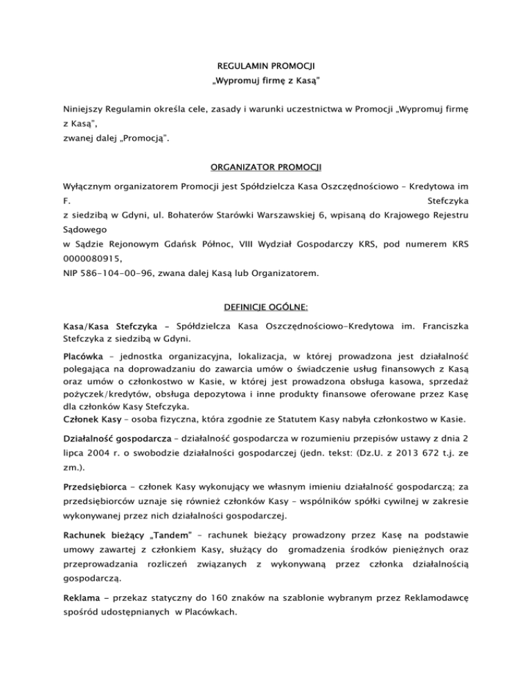 REGULAMIN PROMOCJI „Wypromuj firmę z Kasą” Niniejszy Regulamin określa cele, zasady i warunki uczestnictwa w Promocji „Wypromuj firmę z Kasą”, zwanej dalej „Promocją”. ORGANIZATOR PROMOCJI Wyłącznym organizatorem Promocji jest Spółdzielcza Kasa Oszczędnościowo – Kredytowa im F. Stefczyka z siedzibą w Gdyni, ul. Bohaterów Starówki Warszawskiej 6, wpisaną do Krajowego Rejestru Sądowego w Sądzie Rejonowym Gdańsk Północ, VIII Wydział Gospodarczy KRS, pod numerem KRS 0000080915, NIP 586-104-00-96, zwana dalej Kasą lub Organizatorem. DEFINICJE OGÓLNE: Kasa/Kasa Stefczyka – Spółdzielcza Kasa Oszczędnościowo-Kredytowa im. Franciszka Stefczyka z siedzibą w Gdyni. Placówka – jednostka organizacyjna, lokalizacja, w której prowadzona jest działalność polegająca na doprowadzaniu do zawarcia umów o świadczenie usług finansowych z Kasą oraz umów o członkostwo w Kasie, w której jest prowadzona obsługa kasowa, sprzedaż pożyczek/kredytów, obsługa depozytowa i inne produkty finansowe oferowane przez Kasę dla członków Kasy Stefczyka. Członek Kasy – osoba fizyczna, która zgodnie ze Statutem Kasy nabyła członkostwo w Kasie. Działalność gospodarcza – działalność gospodarcza w rozumieniu przepisów ustawy z dnia 2 lipca 2004 r. o swobodzie działalności gospodarczej (jedn. tekst: (Dz.U. z 2013 672 t.j. ze zm.). Przedsiębiorca - członek Kasy wykonujący we własnym imieniu działalność gospodarczą; za przedsiębiorców uznaje się również członków Kasy – wspólników spółki cywilnej w zakresie wykonywanej przez nich działalności gospodarczej. Rachunek bieżący „Tandem” – rachunek bieżący prowadzony przez Kasę na podstawie umowy zawartej z członkiem Kasy, służący do przeprowadzania rozliczeń związanych z gromadzenia środków pieniężnych oraz wykonywaną przez członka działalnością gospodarczą. Reklama - przekaz statyczny do 160 znaków na szablonie wybranym przez Reklamodawcę spośród udostępnianych w Placówkach. ADRESACI PROMOCJI Promocja skierowana jest do Członków Kasy Stefczyka, którzy posiadają wpływy na Rachunek bieżący „Tandem” w wysokości i okresie określonych w części Regulaminu dot. Uczestników promocji. W Promocji nie mogą brać udziału pracownicy Organizatora, Apelli S.A. z siedzibą w Gdyni przy ul. Legionów 126-128, Towarzystwa Zarządzającego SKOK Sp. z o.o. Spółka komandytowo –akcyjna z siedzibą w Gdyni przy ul. Legionów 126-128, Towarzystwa Zarządzającego SKOK sp. z o.o. z siedzibą w Gdyni przy ul. Legionów 126-128, Stefczyka Finanse TZ Sp. z o.o. S.K.A. z siedzibą w Gdyni przy ul. Legionów126-128, Towarzystwa Finansowego SKOK S.A. z siedzibą w Gdańsku przy ul. Arkońskiej 11, Krajowej Spółdzielczej Kasy Oszczędnościowo-Kredytowej z siedzibą w Sopocie przy ul. Władysława IV 22, Stowarzyszenia Krzewienia Edukacji Finansowej z siedzibą w Gdyni przy ul. Legionów 126128, Premium Management Spółka z ograniczoną odpowiedzialnością spółka komandytowoakcyjna z siedzibą w Gdyni przy ul. Legionów 126/128, 81-472. CEL PROMOCJI Celem Promocji jest rozpowszechnianie usług i produktów Kasy Stefczyka, w szczególności rachunków bieżących „Tandem” służących do gromadzenia środków pieniężnych oraz przeprowadzania rozliczeń związanych z wykonywaną przez członka działalnością gospodarczą. CZAS TRWANIA PROMOCJI Promocja obowiązuje od dnia 1 sierpnia 2015 r. do 31 października 2015 r. UCZESTNICY PROMOCJI Uczestnikiem Promocji może być pełnoletni członek Kasy, który w okresie od 1 sierpnia 2015 r. do 31 października 2015 r. posiadał miesięczne wpływy na rachunek Tandem w wysokości minimum 3000,00 złotych (suma wpływów w miesiącu) w każdym z dwóch następujących po sobie miesiącach kalendarzowych. WARUNKI I PRZEBIEG PROMOCJI I. Członek Kasy, który w okresie od 1 sierpnia 2015 r. do 31 października 2015 r. posiadał wpływy na rachunek Tandem w wysokości minimum 3000,00 złotych miesięcznie w każdym z dwóch następujących po sobie miesiącach kalendarzowych otrzyma nagrodę w postaci: - bonu podarunkowego o wartości 68,50 zł brutto, na miesięczną emisję reklamy działalności gospodarczej Uczestnika promocji na monitorze LCD w Placówce Organizatora, w której założono rachunek Tandem lub w innej wybranej przez uczestnika Placówce w regionie w przypadku braku monitora w placówce macierzystej. Szczegółowe warunki na jakich dokonywana jest emisja reklamy określa odrębny regulamin, który zostanie wydany Uczestnikowi Promocji wraz z nagrodą. II. Uczestnik Promocji obowiązany jest do zapłaty 19% zryczałtowanego podatku od nagród (13,00 zł, słownie: trzynaście złotych). Kwota określona w zdaniu poprzednim może być potrącona z rachunku Członka przed odebraniem bonu podarunkowego, o ile na rachunku tym znajdują się stosowne środki. W innym wypadku Członek obowiązany jest do uiszczenia kwoty podatku przy odbieraniu bonu podarunkowego. III. Organizator konkursu przekaże kwotę należnego podatku na rachunek organu skarbowego, którym kieruje naczelnik urzędu skarbowego właściwy według jego siedziby Zgodnie z Art. 42 Ustawy o PIT. Jeśli Placówka posiada monitor wyświetlany wewnątrz i zewnętrz Placówki, Uczestnik Promocji ma prawo wybrać monitor, na którym będzie emitowana reklama. IV. Lista placówek z podziałem na regiony stanowi załącznik nr 1 do niniejszego regulaminu. V. Przekaz reklamowy może zostać wyemitowany jako przekaz statyczny do 160 znaków, na szablonie wybranym przez Reklamodawcę spośród wzorów dostępnych w Placówce. VI. Emisja reklamy zgłoszona przez Uczestników Promocji pracownikowi Placówki do 20 dnia danego miesiąca realizowana jest od pierwszego dnia miesiąca następującego po miesiącu, w którym nastąpiło zgłoszenie (emisja reklamy będzie trwać przez jeden miesiąc kalendarzowy). Emisje reklam zgłoszone przez Ucze