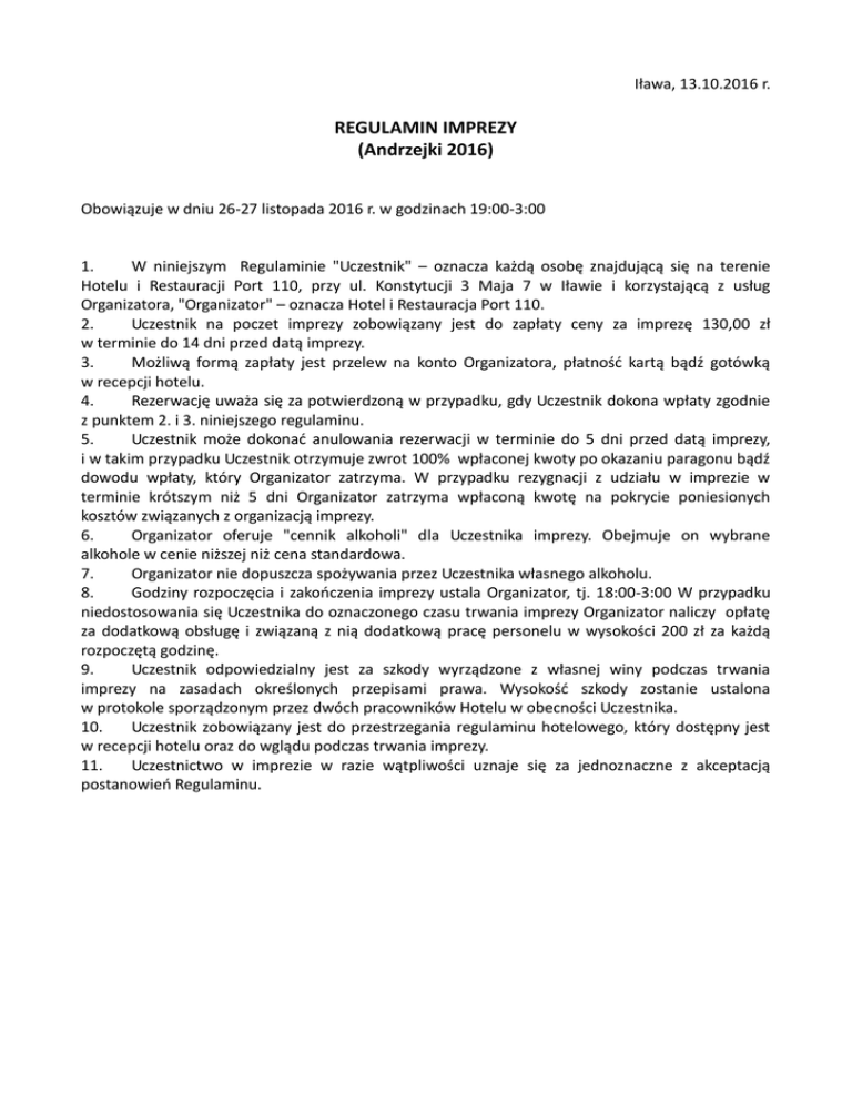 Iława, 13.10.2016 r. REGULAMIN IMPREZY (Andrzejki 2016) Obowiązuje w dniu 26-27 listopada 2016 r. w godzinach 19:00-3:00 1. W niniejszym Regulaminie "Uczestnik" – oznacza każdą osobę znajdującą się na terenie Hotelu i Restauracji Port 110, przy ul. Konstytucji 3 Maja 7 w Iławie i korzystającą z usług Organizatora, "Organizator" – oznacza Hotel i Restauracja Port 110. 2. Uczestnik na poczet imprezy zobowiązany jest do zapłaty ceny za imprezę 130,00 zł w terminie do 14 dni przed datą imprezy. 3. Możliwą formą zapłaty jest przelew na konto Organizatora, płatność kartą bądź gotówką w recepcji hotelu. 4. Rezerwację uważa się za potwierdzoną w przypadku, gdy Uczestnik dokona wpłaty zgodnie z punktem 2. i 3. niniejszego regulaminu. 5. Uczestnik może dokonać anulowania rezerwacji w terminie do 5 dni przed datą imprezy, i w takim przypadku Uczestnik otrzymuje zwrot 100% wpłaconej kwoty po okazaniu paragonu bądź dowodu wpłaty, który Organizator zatrzyma. W przypadku rezygnacji z udziału w imprezie w terminie krótszym niż 5 dni Organizator zatrzyma wpłaconą kwotę na pokrycie poniesionych kosztów związanych z organizacją imprezy. 6. Organizator oferuje "cennik alkoholi" dla Uczestnika imprezy. Obejmuje on wybrane alkohole w cenie niższej niż cena standardowa. 7. Organizator nie dopuszcza spożywania przez Uczestnika własnego alkoholu. 8. Godziny rozpoczęcia i zakończenia imprezy ustala Organizator, tj. 18:00-3:00 W przypadku niedostosowania się Uczestnika do oznaczonego czasu trwania imprezy Organizator naliczy opłatę za dodatkową obsługę i związaną z nią dodatkową pracę personelu w wysokości 200 zł za każdą rozpoczętą godzinę. 9. Uczestnik odpowiedzialny jest za szkody wyrządzone z własnej winy podczas trwania imprezy na zasadach określonych przepisami prawa. Wysokość szkody zostanie ustalona w protokole sporządzonym przez dwóch pracowników Hotelu w obecności Uczestnika. 10. Uczestnik zobowiązany jest do przestrzegania regulaminu hotelowego, który dostępny jest w recepcji hotelu oraz do wglądu podczas trwania imprezy. 11. Uczestnictwo w imprezie w razie wątpliwości uznaje się za jednoznaczne z akceptacją postanowień Regulaminu.