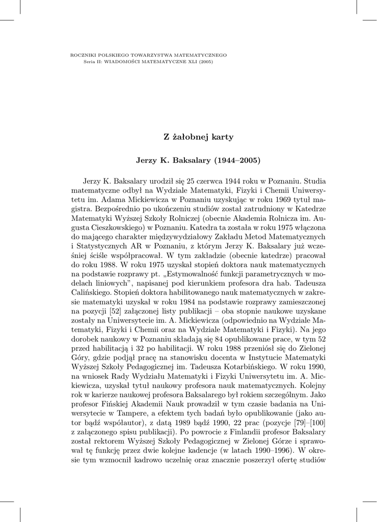 ROCZNIKI POLSKIEGO TOWARZYSTWA MATEMATYCZNEGO Seria II: WIADOMOŚCI MATEMATYCZNE XLI (2005) Z żałobnej karty Jerzy K. Baksalary (1944–2005) Jerzy K. Baksalary urodził się 25 czerwca 1944 roku w Poznaniu. Studia matematyczne odbył na Wydziale Matematyki, Fizyki i Chemii Uniwersytetu im. Adama Mickiewicza w Poznaniu uzyskując w roku 1969 tytuł magistra. Bezpośrednio po ukończeniu studiów został zatrudniony w Katedrze Matematyki Wyższej Szkoły Rolniczej (obecnie Akademia Rolnicza im. Augusta Cieszkowskiego) w Poznaniu. Katedra ta została w roku 1975 włączona do mającego charakter międzywydziałowy Zakładu Metod Matematycznych i Statystycznych AR w Poznaniu, z którym Jerzy K. Baksalary już wcześniej ściśle współpracował. W tym zakładzie (obecnie katedrze) pracował do roku 1988. W roku 1975 uzyskał stopień doktora nauk matematycznych na podstawie rozprawy pt. „Estymowalność funkcji parametrycznych w modelach liniowych”, napisanej pod kierunkiem profesora dra hab. Tadeusza Calińskiego. Stopień doktora habilitowanego nauk matematycznych w zakresie matematyki uzyskał w roku 1984 na podstawie rozprawy zamieszczonej na pozycji [52] załączonej listy publikacji – oba stopnie naukowe uzyskane zostały na Uniwersytecie im. A. Mickiewicza (odpowiednio na Wydziale Matematyki, Fizyki i Chemii oraz na Wydziale Matematyki i Fizyki). Na jego dorobek naukowy w Poznaniu składają się 84 opublikowane prace, w tym 52 przed habilitacją i 32 po habilitacji. W roku 1988 przeniósł się do Zielonej Góry, gdzie podjął pracę na stanowisku docenta w Instytucie Matematyki Wyższej Szkoły Pedagogicznej im. Tadeusza Kotarbińskiego. W roku 1990, na wniosek Rady Wydziału Matematyki i Fizyki Uniwersytetu im. A. Mickiewicza, uzyskał tytuł naukowy profesora nauk matematycznych. Kolejny rok w karierze naukowej profesora Baksalarego był rokiem szczególnym. Jako profesor Fińskiej Akademii Nauk prowadził w tym czasie badania na Uniwersytecie w Tampere, a efektem tych badań było opublikowanie (jako autor bądź współautor), z datą 1989 bądź 1990, 22 prac (pozycje [79]–[100] z załączonego spisu publikacji). Po powrocie z Finlandii profesor Baksalary został rektorem Wyższej Szkoły Pedagogicznej w Zielonej Górze i sprawował tę funkcję przez dwie kolejne kadencje (w latach 1990–1996). W okresie tym wzmocnił kadrowo uczelnię oraz znacznie poszerzył ofertę studiów 190 Z żałobnej karty powołując m.in. Instytut Zarządzania, Instytut Filozofii, kolegia językowe oraz nowe kierunki nie związane ściśle z pedagogiką. Za jego rządów WSP stała się miejscem corocznych spotkań matematyków w ramach konferencji „Konfrontacje Zielonogórskie”. Rektor Baksalary stworzył w WSP podwaliny nowoczesnego ośrodka akademickiego, co miało istotne znaczenie dla powołania w 2001 roku Uniwersytetu Zielonogórskiego. Kierowanie uczelnią godził z aktywną pracą naukową – w roku 1991 został profesorem zwyczajnym na Wydziale Matematyki, Fizyki i Techniki WSP, a jego dorobek publikacyjny, przypadający na lata 1991–1996, obejmuje 23 prace (pozycje [101]–[123] z załączonego spisu publikacji). Po zakończeniu sprawowania funkcji rektora, profesor Baksalary został dziekanem Wydziału Matematyki, Fizyki i Techniki – pełnił tę funkcję w latach 1996–1999. Od roku 2001, tj. od chwili powstania Uniwersytetu Zielonogórskiego, był kierownikiem Zakładu Algebry Liniowej i Statystyki Matematycznej na Wydziale Matematyki, Informatyki i Ekonometrii. Jerzy K. Baksalary wypromował 4 doktorów, a ostatnio sprawował opiekę naukową nad 3 doktorantkami. Recenzował rozprawy doktorskie, habilitacyjne oraz wnioski o tytuł naukowy profesora. Był członkiem kolegiów redakcyjnych trzech znanych periodyków (Journal of Statistical Planning and Inference – lata 1987–1990, Current Index to Statistics – od roku 2001, IMAGE – od roku 2001) oraz współredaktorem specjalnego tomu Journal of Statistical Planning and Inference (lata 1990–1992) i specjalnego tomu Linear Algebra and Its Applications (lata 1990–1992). Uczestniczył w wielu międzynarodowych konferencjach naukowych wygłaszając często wykłady proszone. W roku 2004 w Ośrodku Konferencyjnym Instytutu Matematycznego PAN w Będlewie odbyła się 1-dniowa sesja z okazji 60-tej rocznicy urodzin Jerzego K. Baksalarego. Sesja ta poprzedzała międzynarodową konferencję „13th International Workshop on Matrices and Statistics in Celebration of Ingram Olkin’s 80th Birthday” – była to ostania konferencja, w której Jerzy uczestniczył. Organizatorzy kolejnej konferencji w cyklu „Matrices and Statistics”, która odbyła się w dniach 29 marca – 1 kwietnia 2005 w Auckland (Nowa Zelandia), uczcili pamięć Jerzego specjalną sesją: The Jerzy Baksalary Memorial Session. Podczas całej konferencji jedno miejsce w pierwszym rzędzie, w którym zazwyczaj siadał, pozostawało wolne. W dniach 9–10 czerwca 2005 roku w University of Windsor (Kanada) odbyło się sympozjum dedykowane pamięci Jerzego pt. „Southern Ontario Matrices and Statistics Days”, na które był zaproszony w charakterze prelegenta. Jerzy K. Baksalary prowadził badania naukowe w takich krajach jak: Indie (Indian Statistical Institute), Finlandia (University of Tampere), Kanada (McGill University, University of Waterloo), Niemcy (Universitaet Dortmund, Universitaet Augsburg) oraz USA (Pittsburg University, Pensylwania State University). Z żałobnej karty 191 Jerzy K. Baksalary jest autorem lub współautorem 176 prac naukowych, z czego znakomita większość została opublikowana w renomowanych czasopismach o zasięgu światowym. Swoje badania prowadził w szerokiej współpracy. Grono jego współpracowników krajowych liczy 16 osób, a grono partnerów z zagranicy 25 osób. Miałem szczęście i zaszczyt współpracować z Jerzym. Od 1999 roku brał on udział w seminarium środowiskowym poświęconym teori